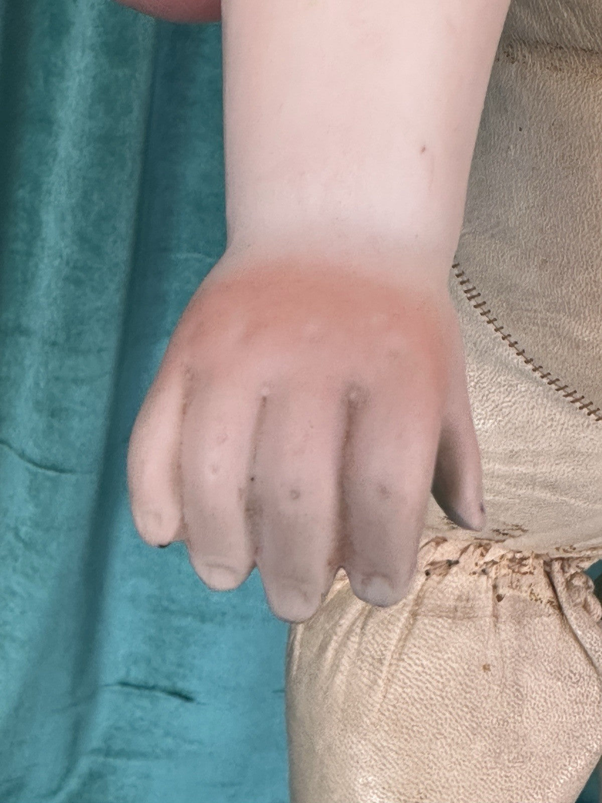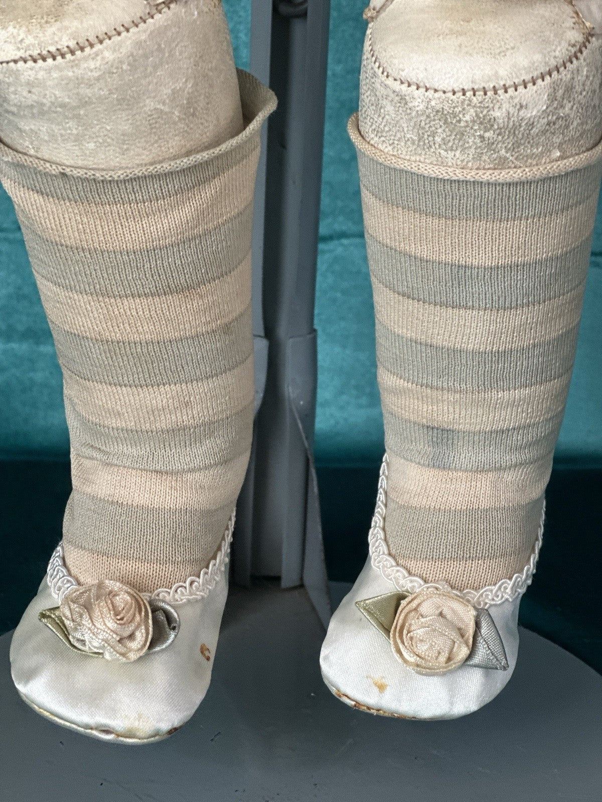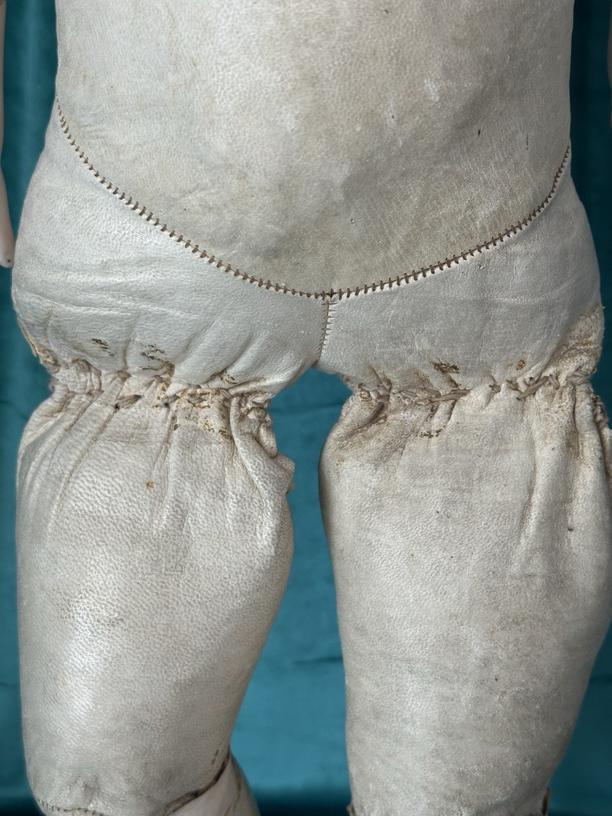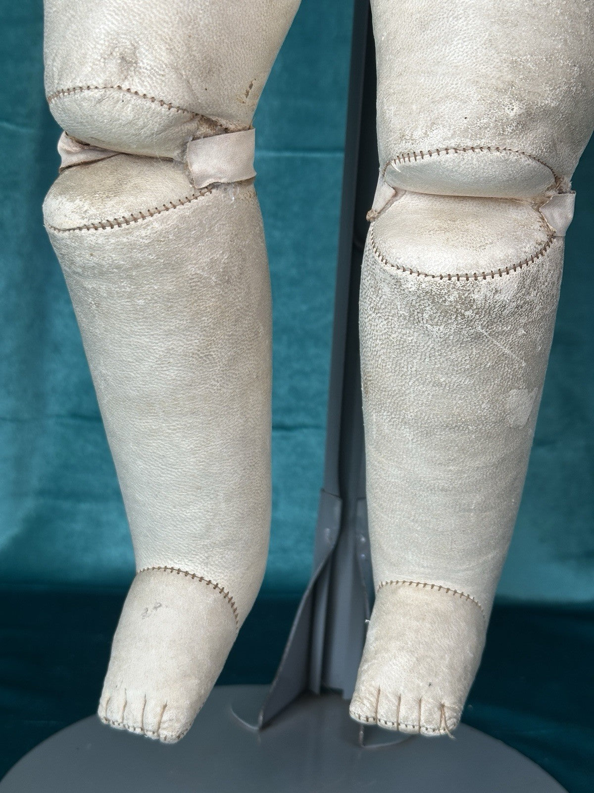 Leather body shows some wear, but is nicely preserved considering the age. Few patched areas/ see photos. The doll is coming with beautiful outfit- mixture of antique, vintage and new clothes. Stains and holes are present. Please refer to the pictures for more details. No stand is included.
