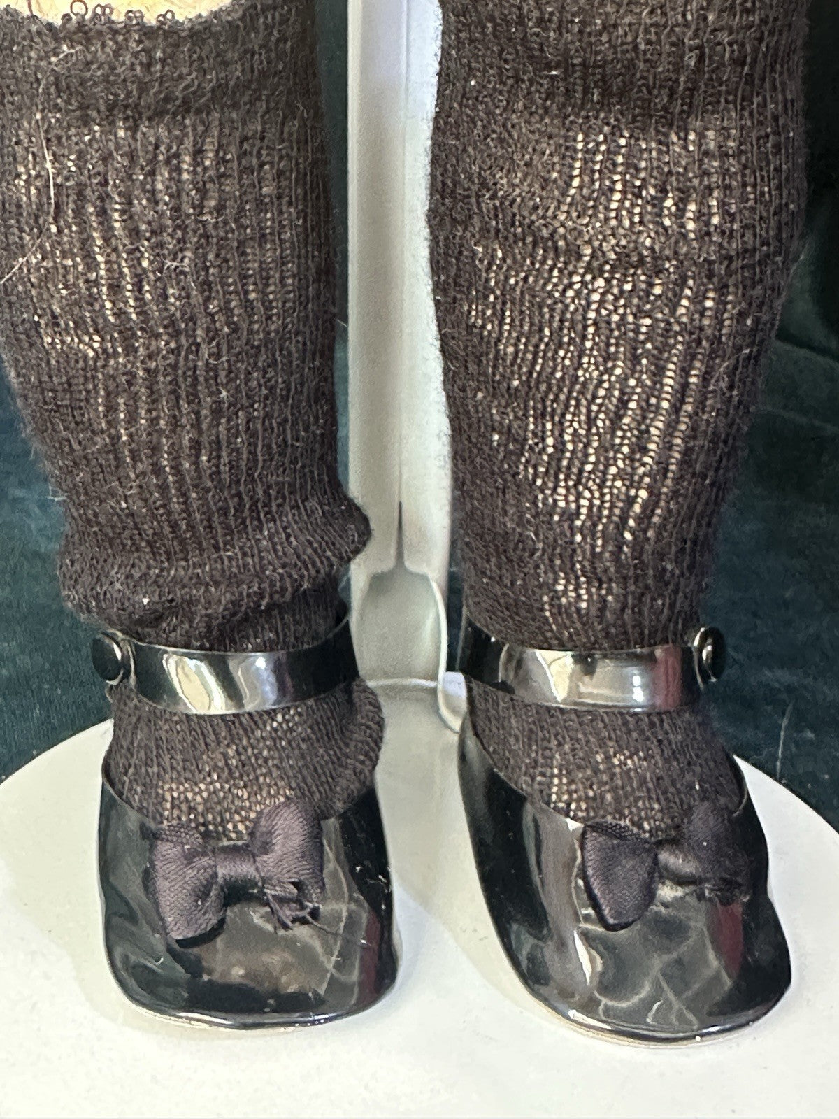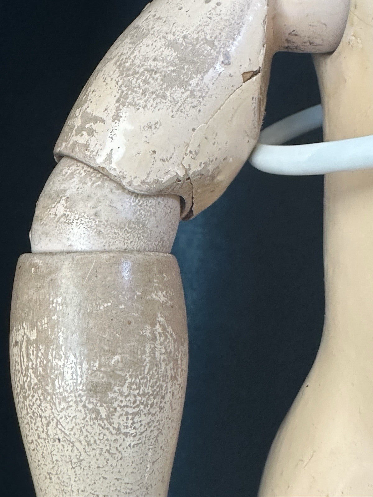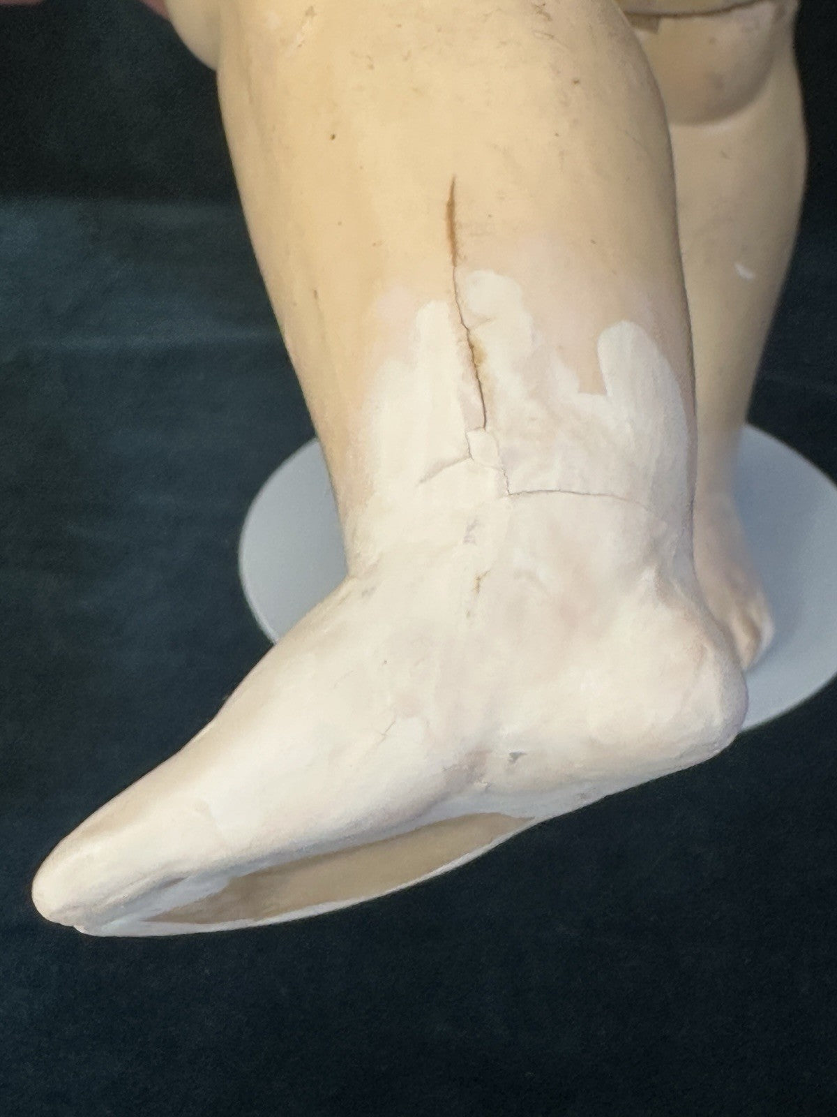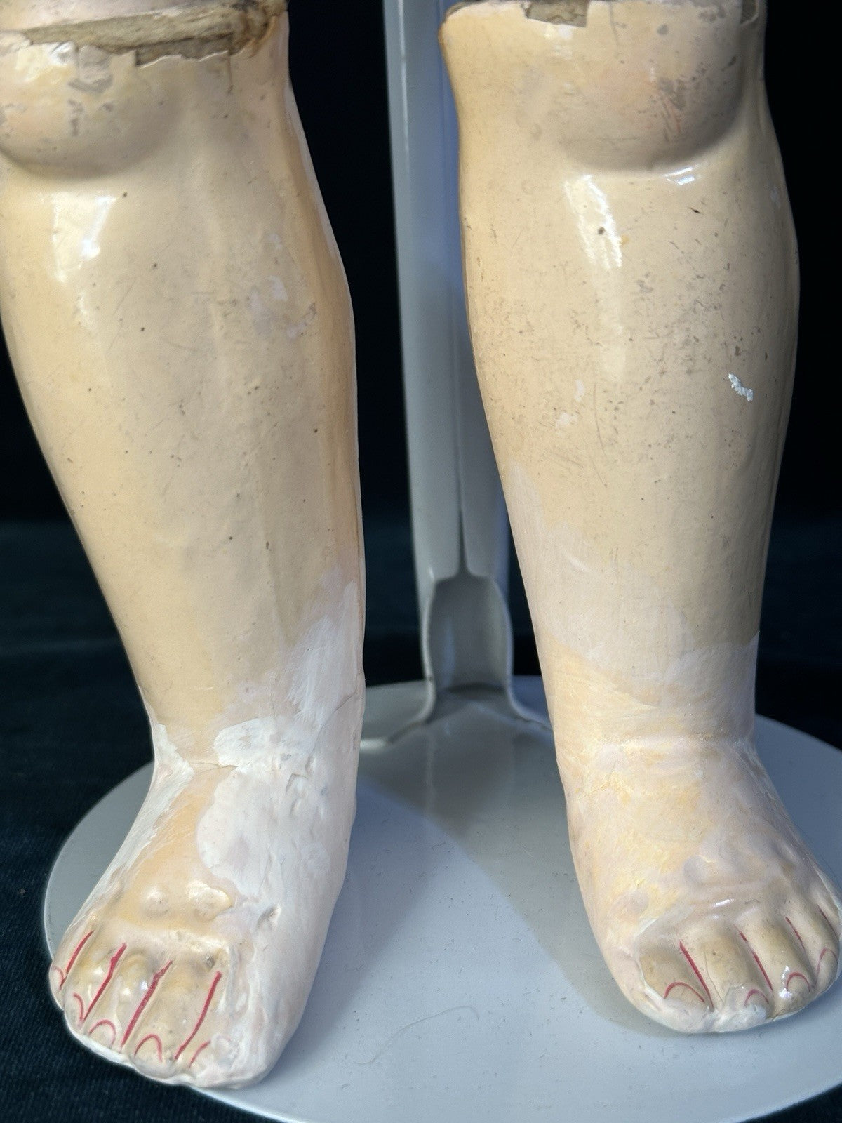 Composition body. Stringing is not very tight . Has a few rough areas - see photos. One foot is repaired (?). Crazing, cracking, scratches are present to her composition body. Please look at the photos as they are part of description.