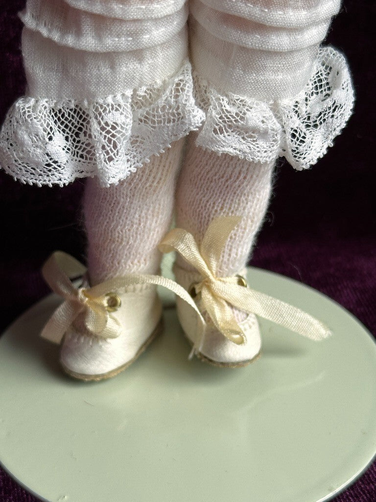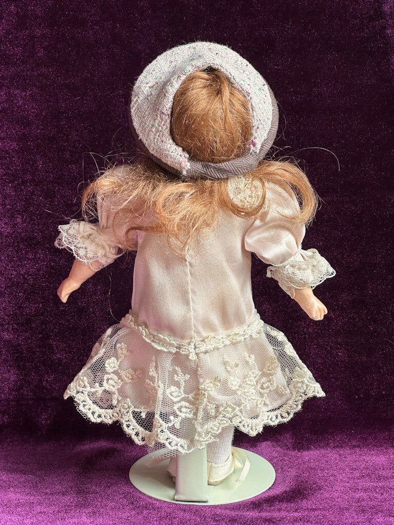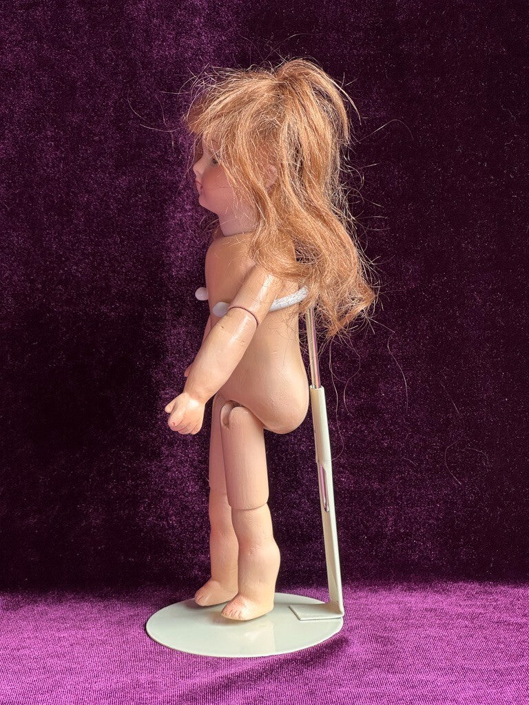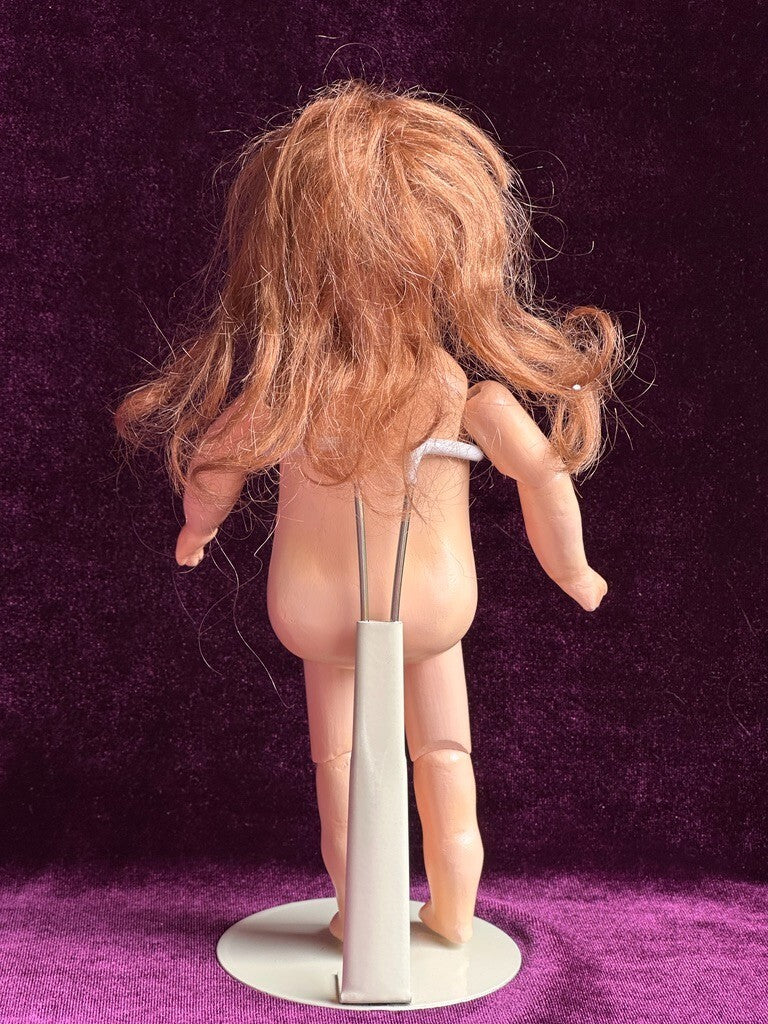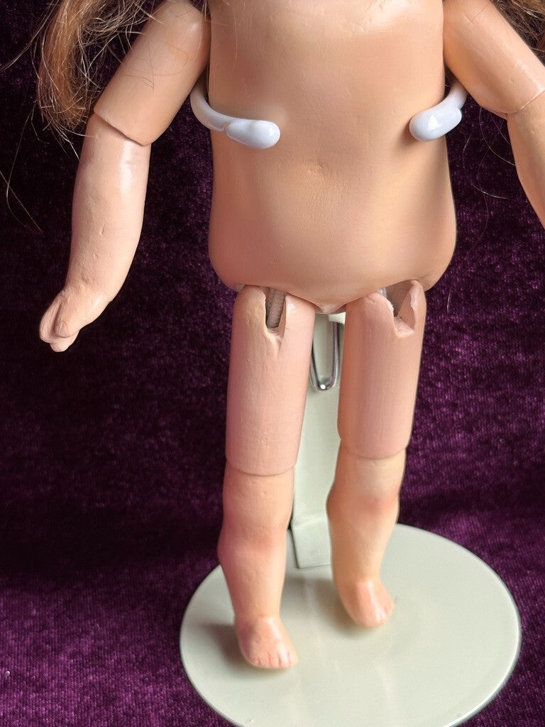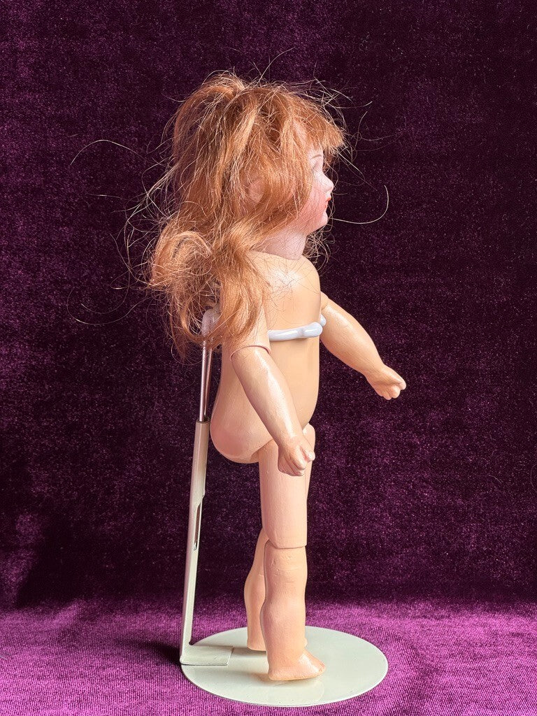 The doll has a unique composition body for this type, with good stringing. She is dressed as shown. Please refer to the pictures for more details. No stand to the doll.
