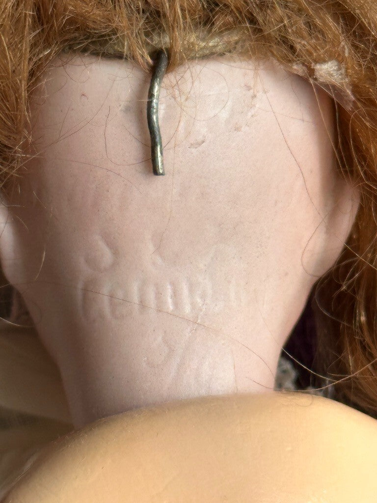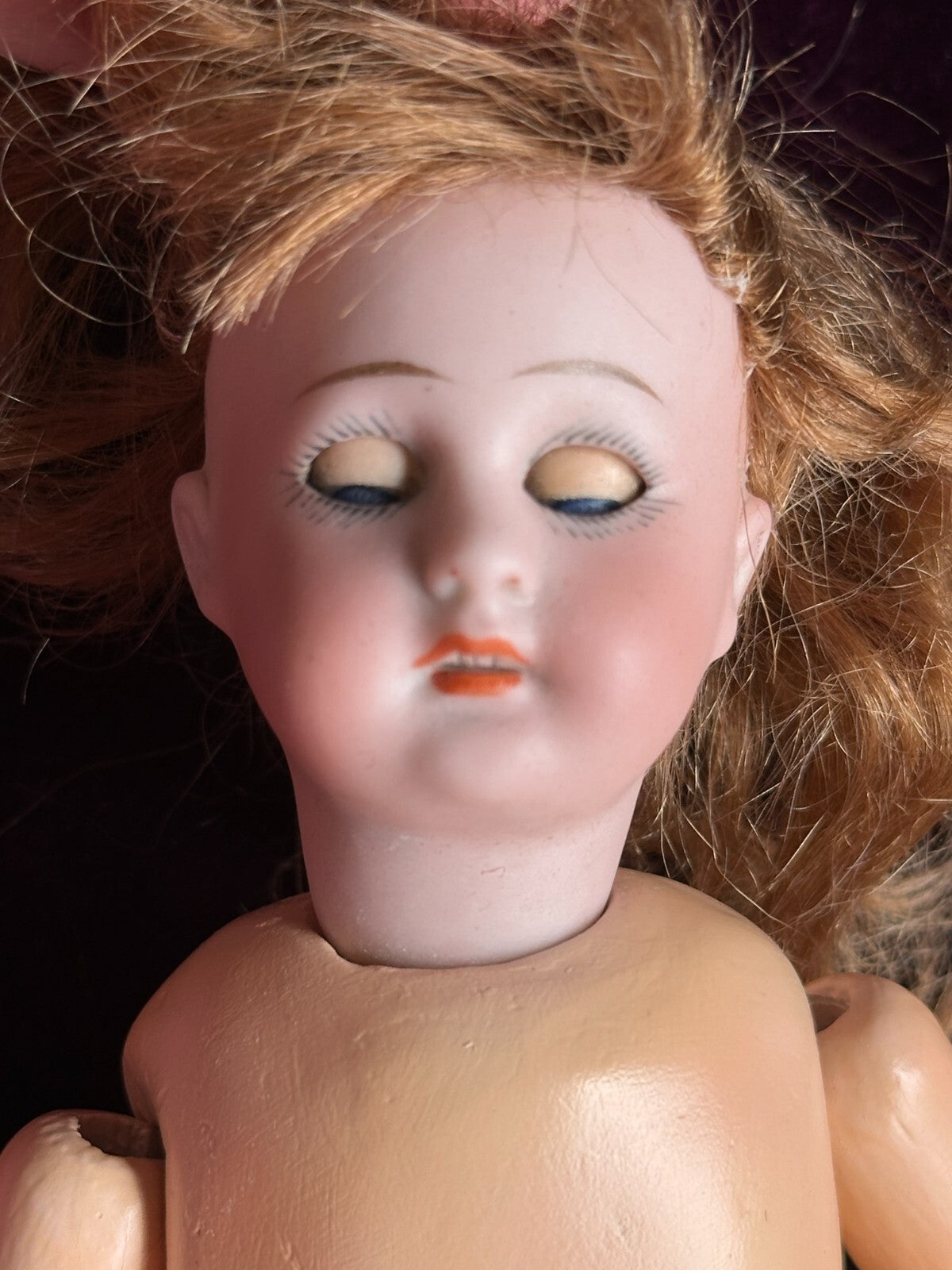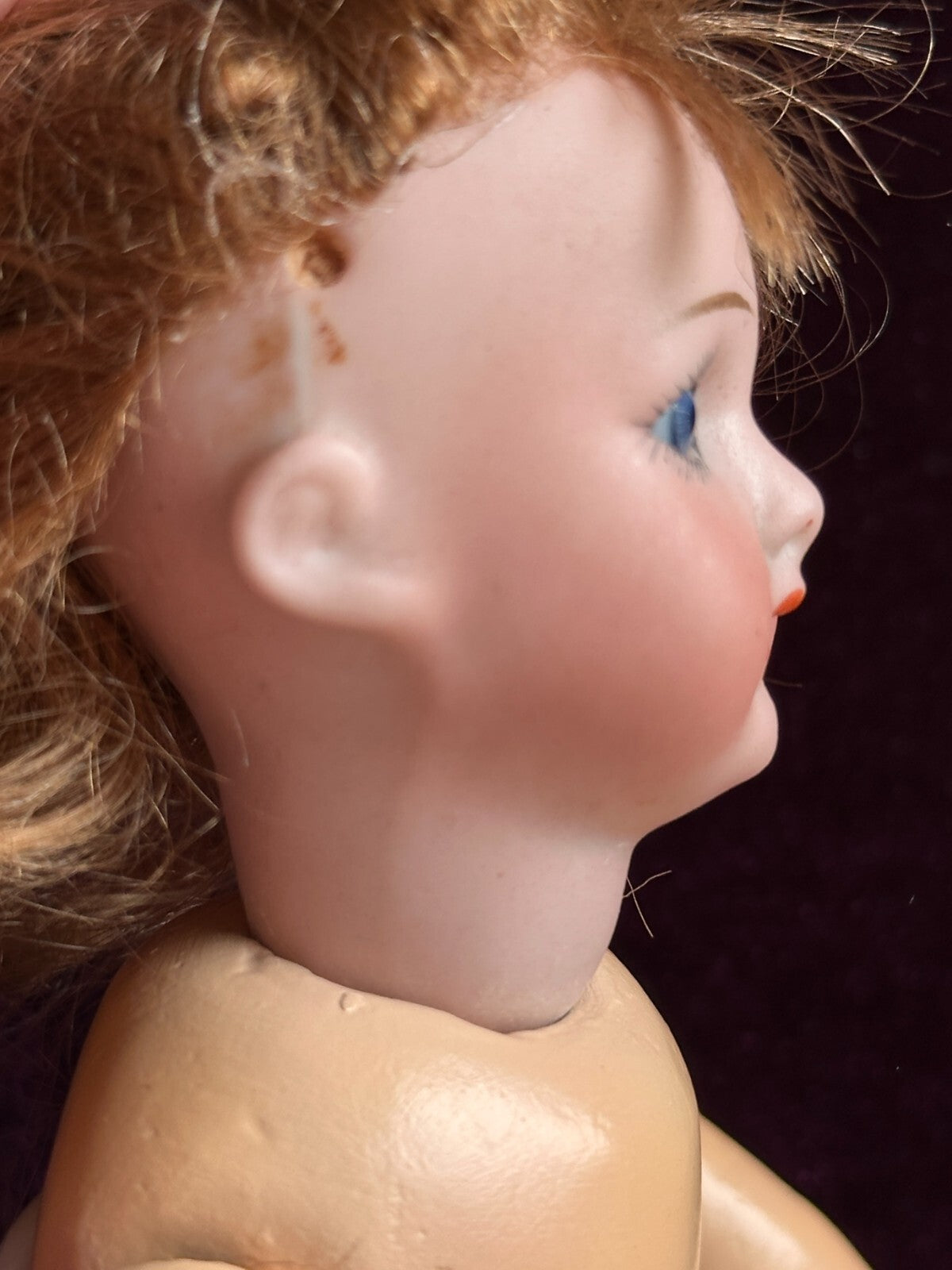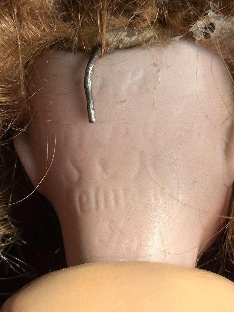 Adorable little doll with working sleepy eyes. The bisque is in good condition with no damage. The pate and wig are glued on. The mold number is not readable.