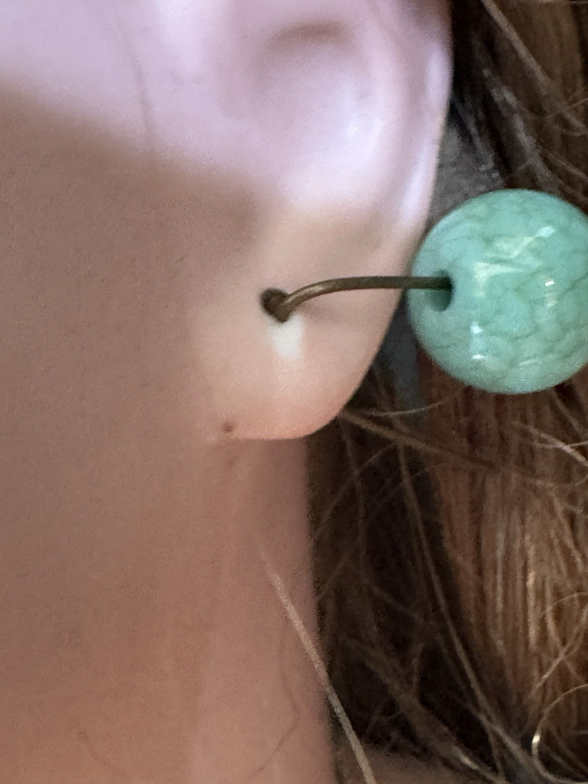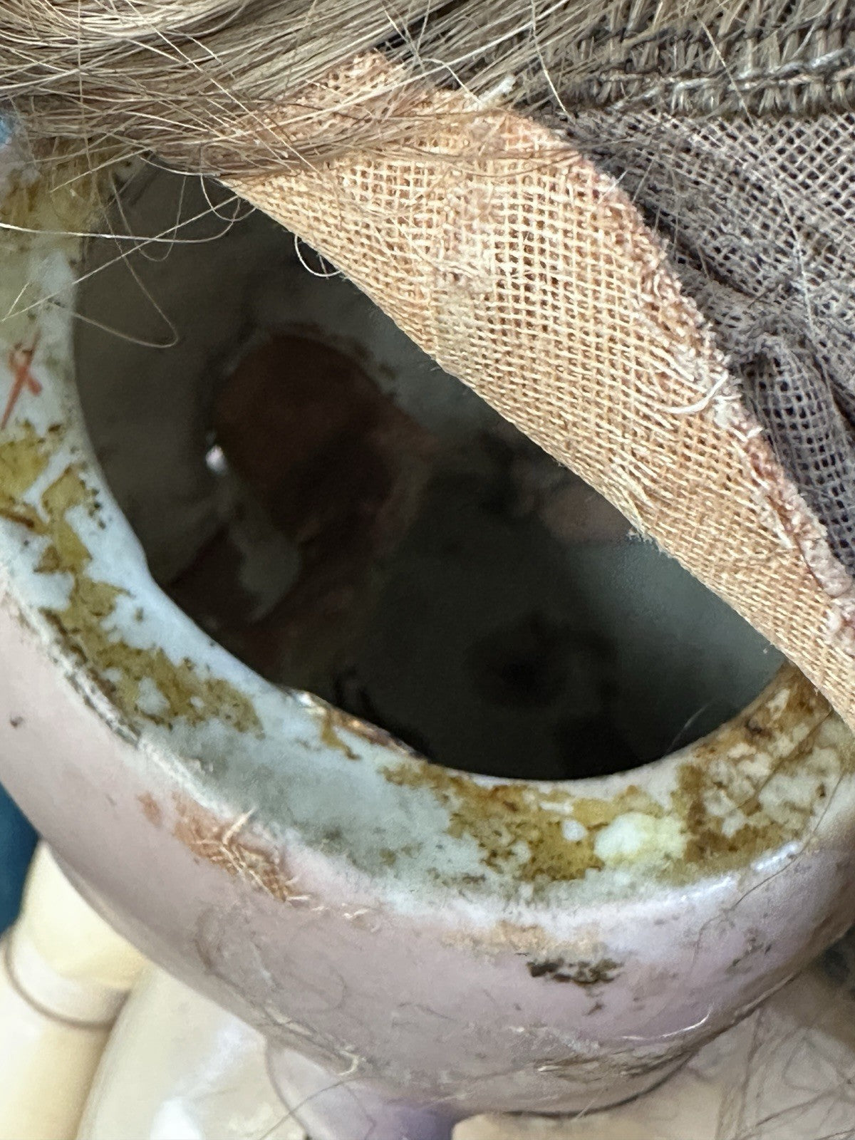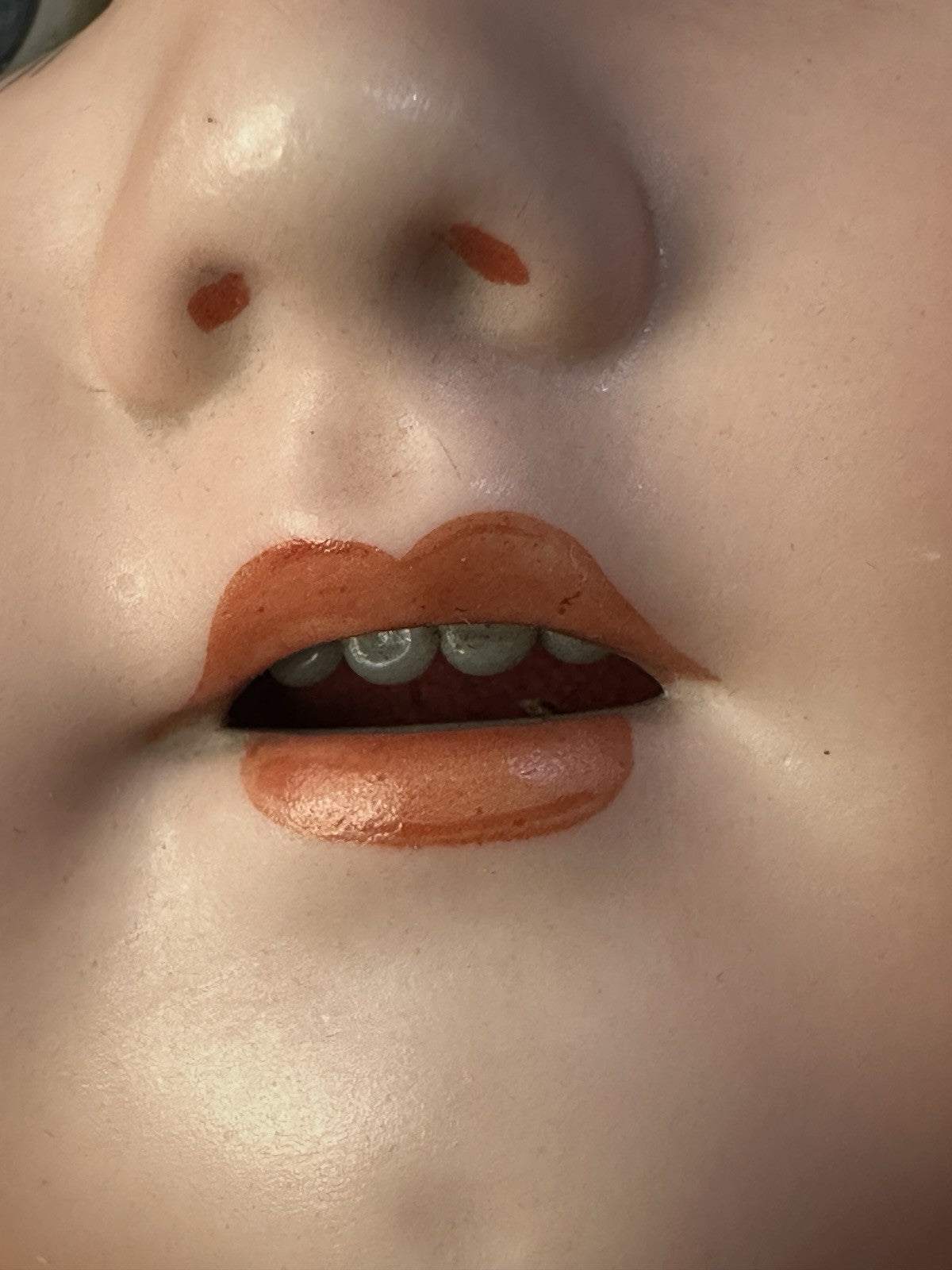 Bisque socket head, blue glass sleepy eyes. No visible damage to the bisque head. Painted lower and upper lashes. Open mouth with teeth. Pierced ears with new earrings. Some chipped areas around piercings hole is present. Human hair wig; partially attached to her head.