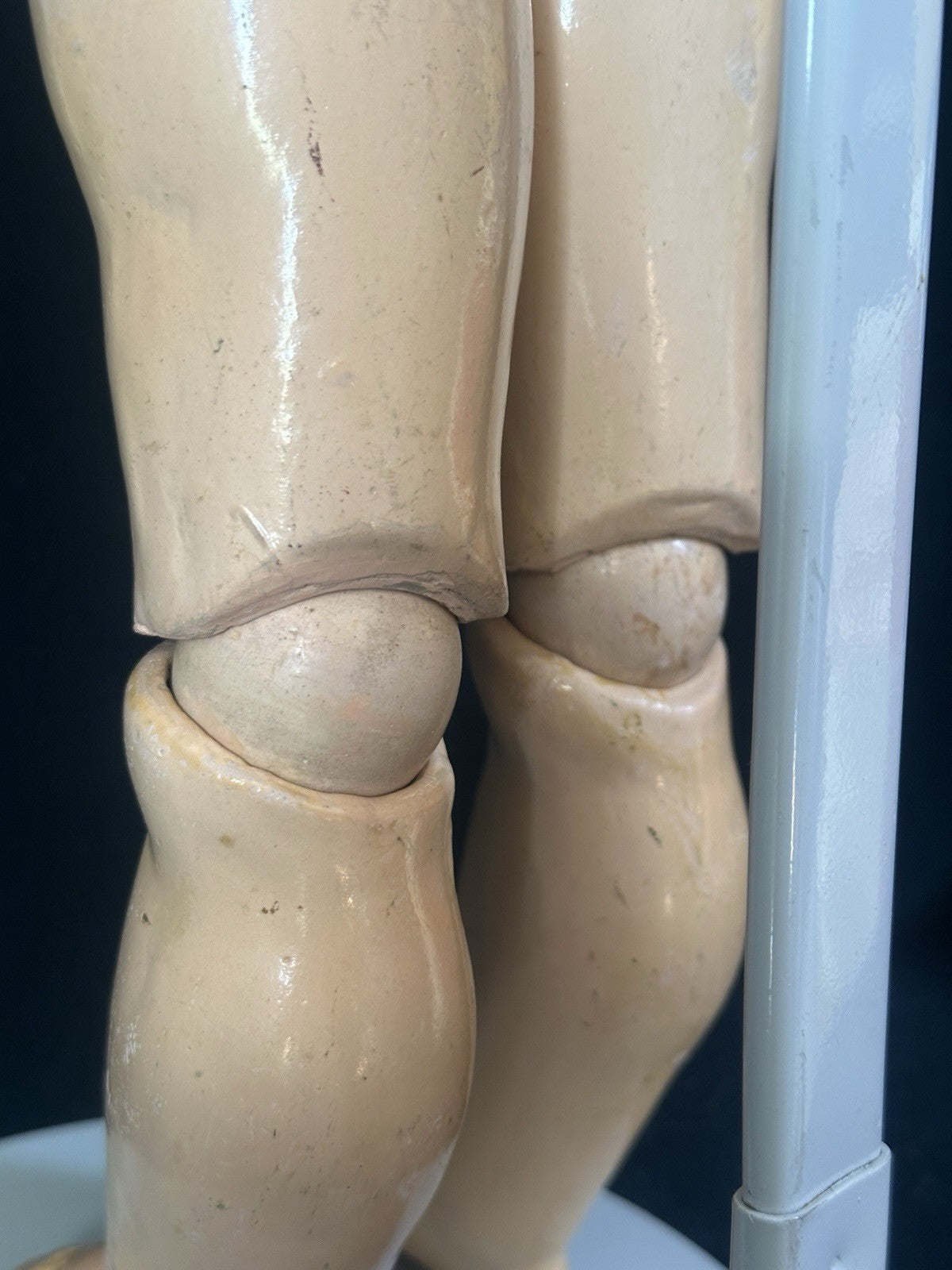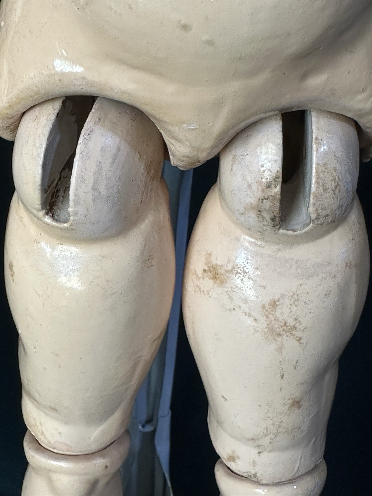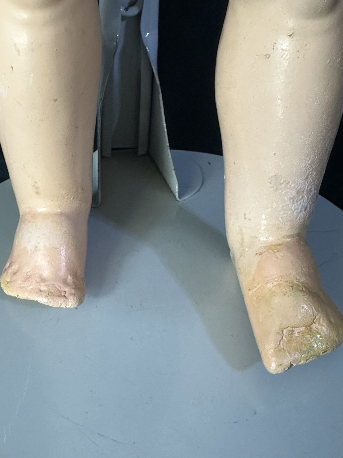 Composition body. Stamped. Stringing is ok but not very tight. Has a few rough areas - see photos. Crazing, cracking, scratches are present to her composition body. Please look at the photos as they are part of description.
