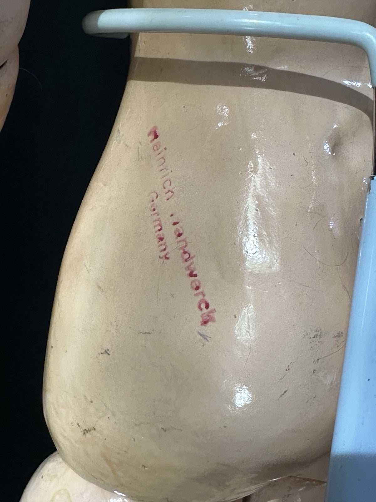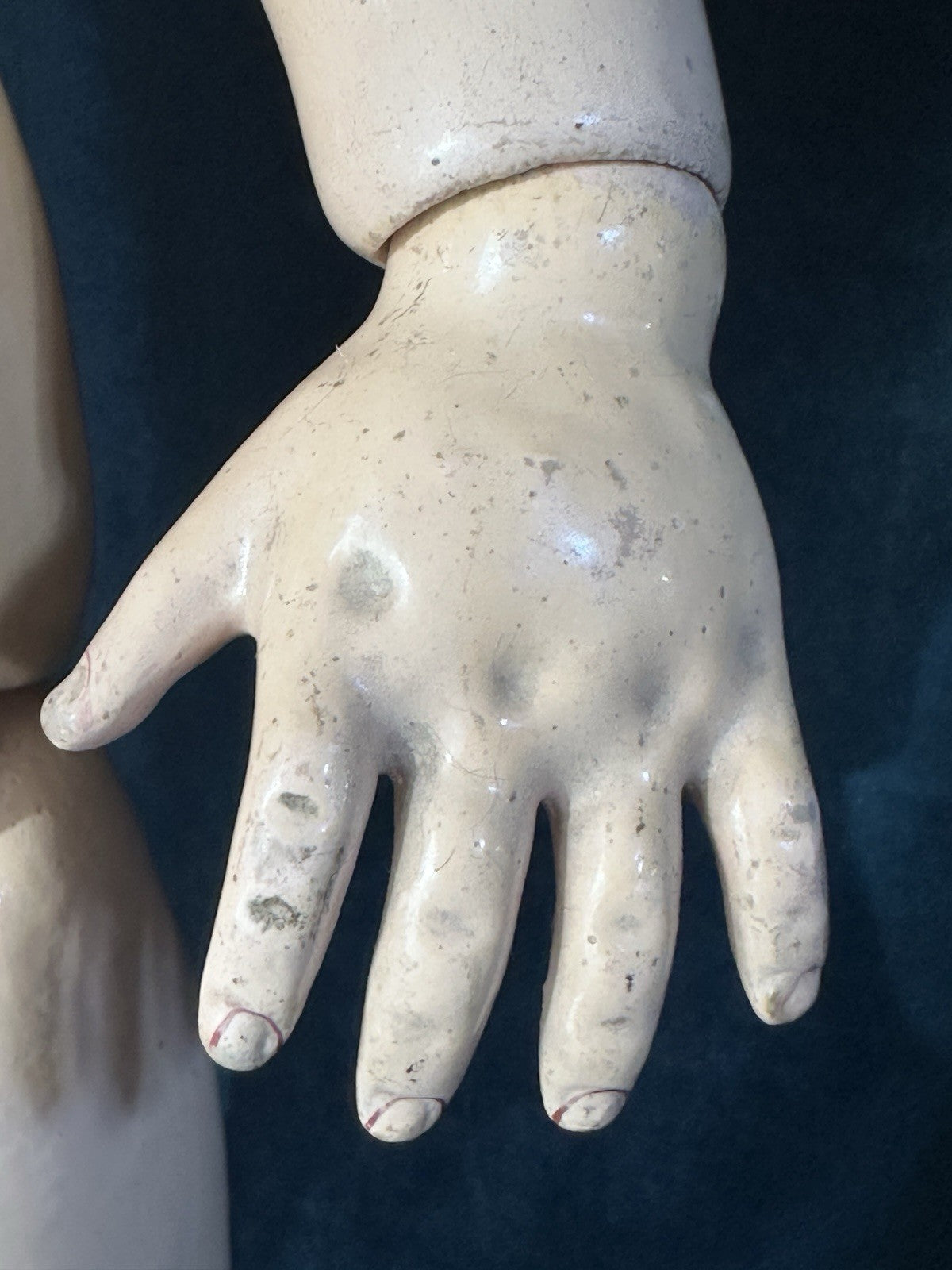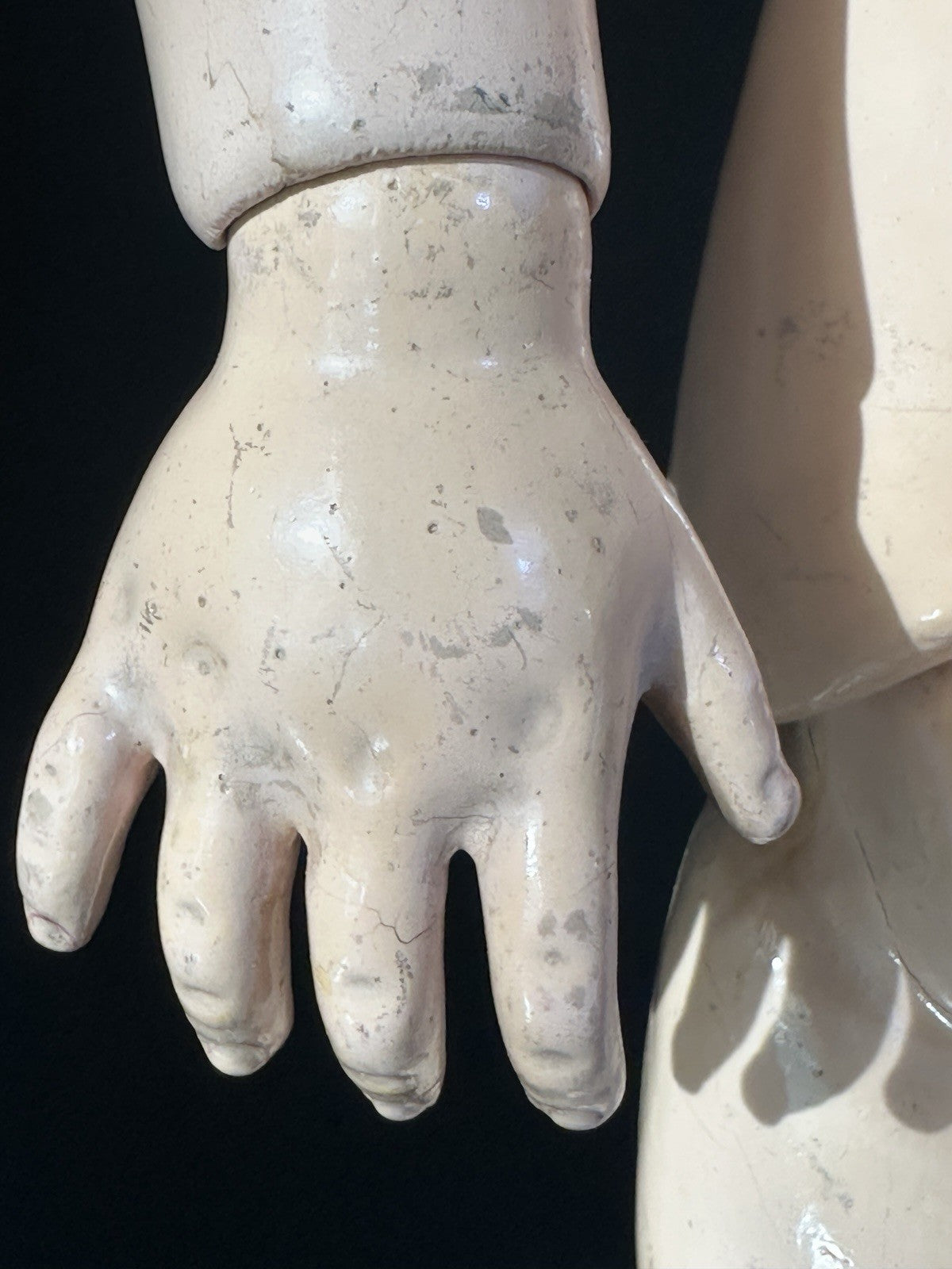 Composition body. Stamped. Stringing is ok but not very tight. Has a few rough areas - see photos. Crazing, cracking, scratches are present to her composition body. Please look at the photos as they are part of description.