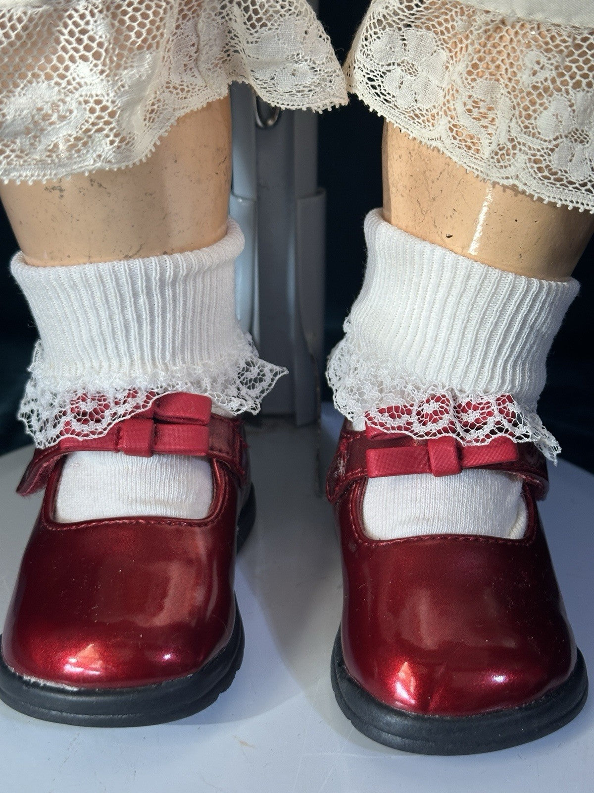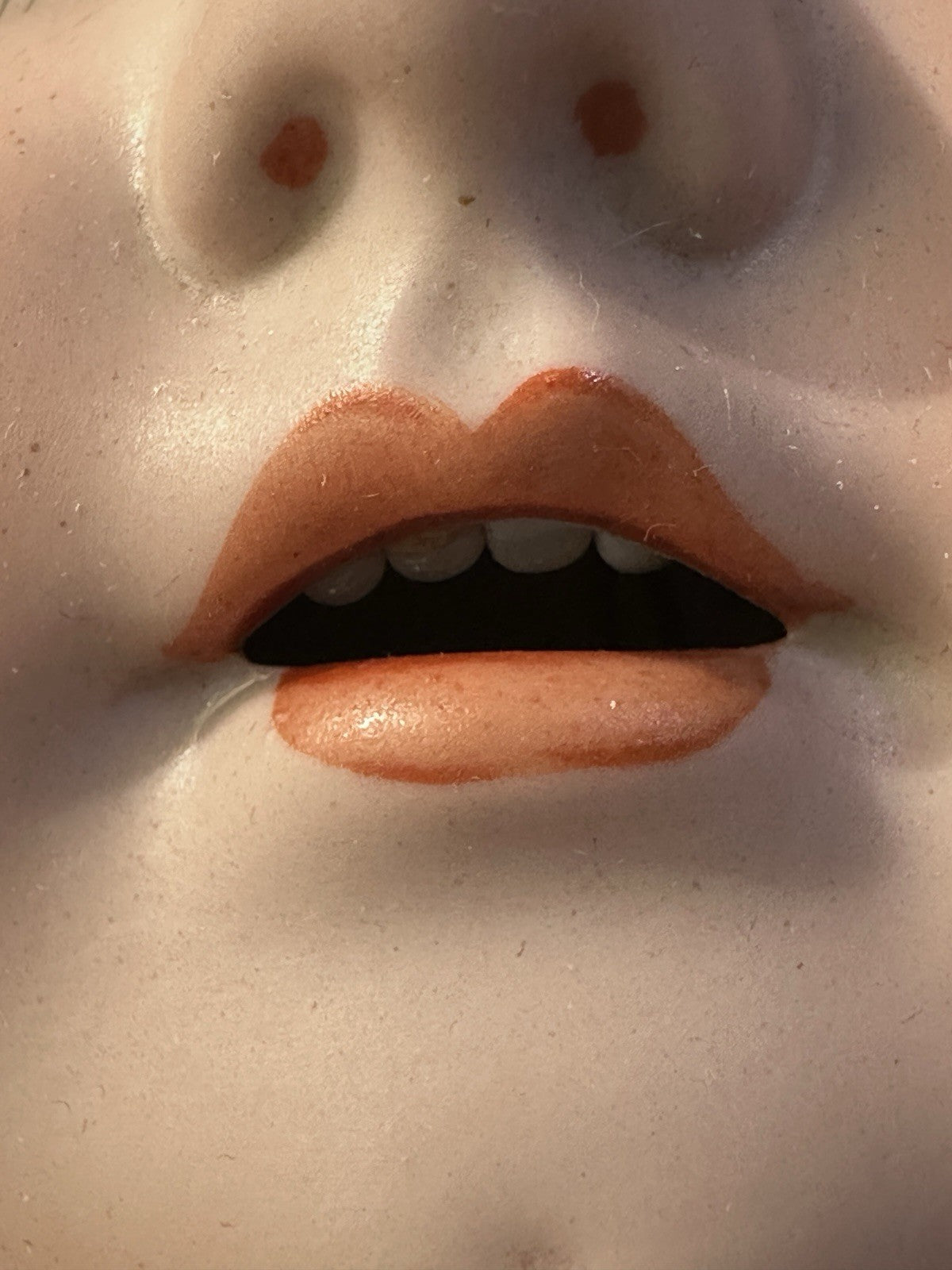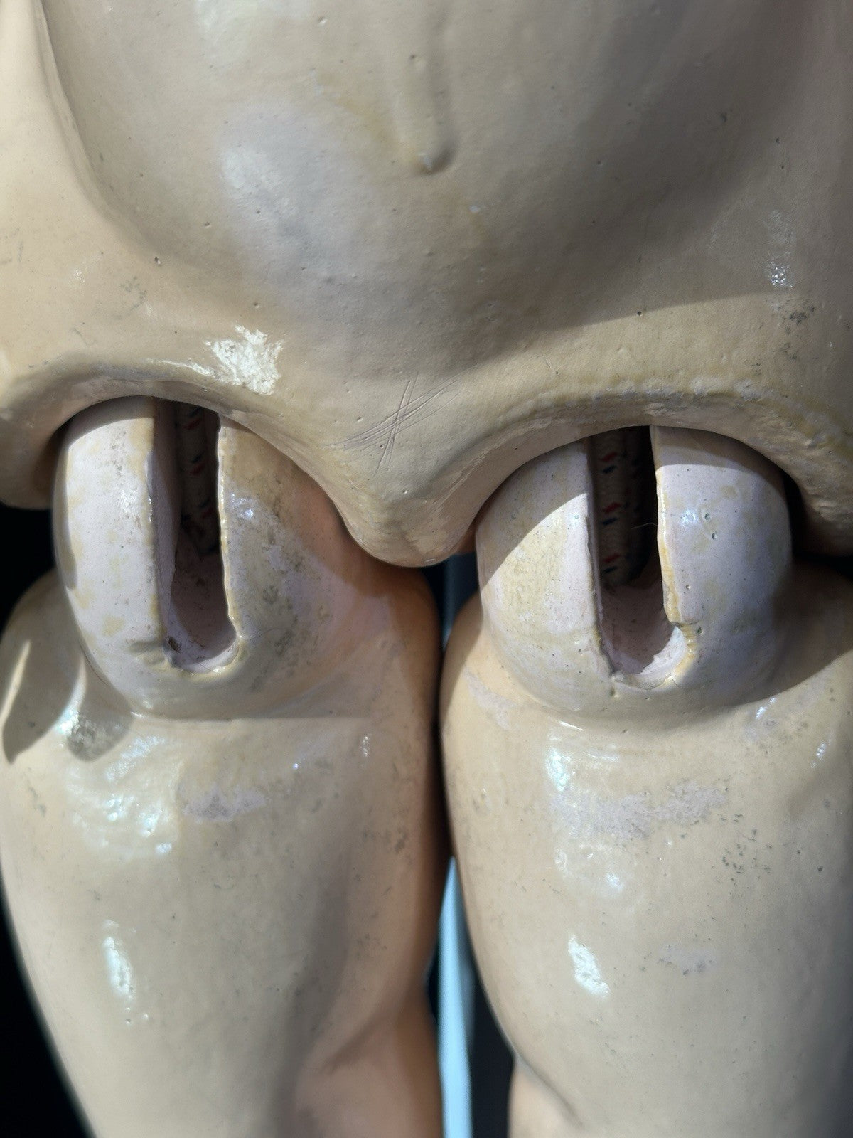 Composition body. Stamped. Stringing is ok but not very tight. Has a few rough areas - see photos. Crazing, cracking, scratches are present to her composition body. Please look at the photos as they are part of description.