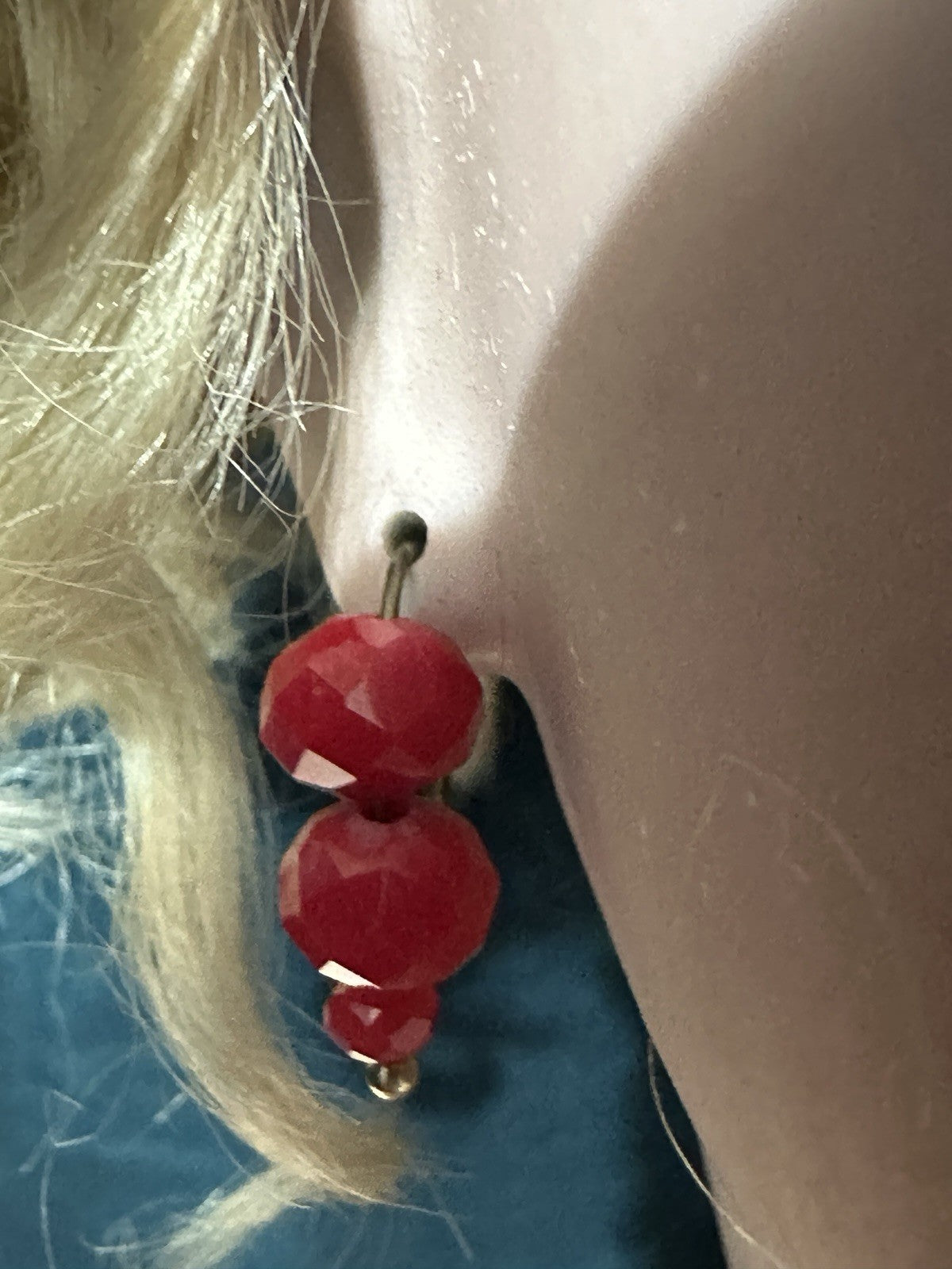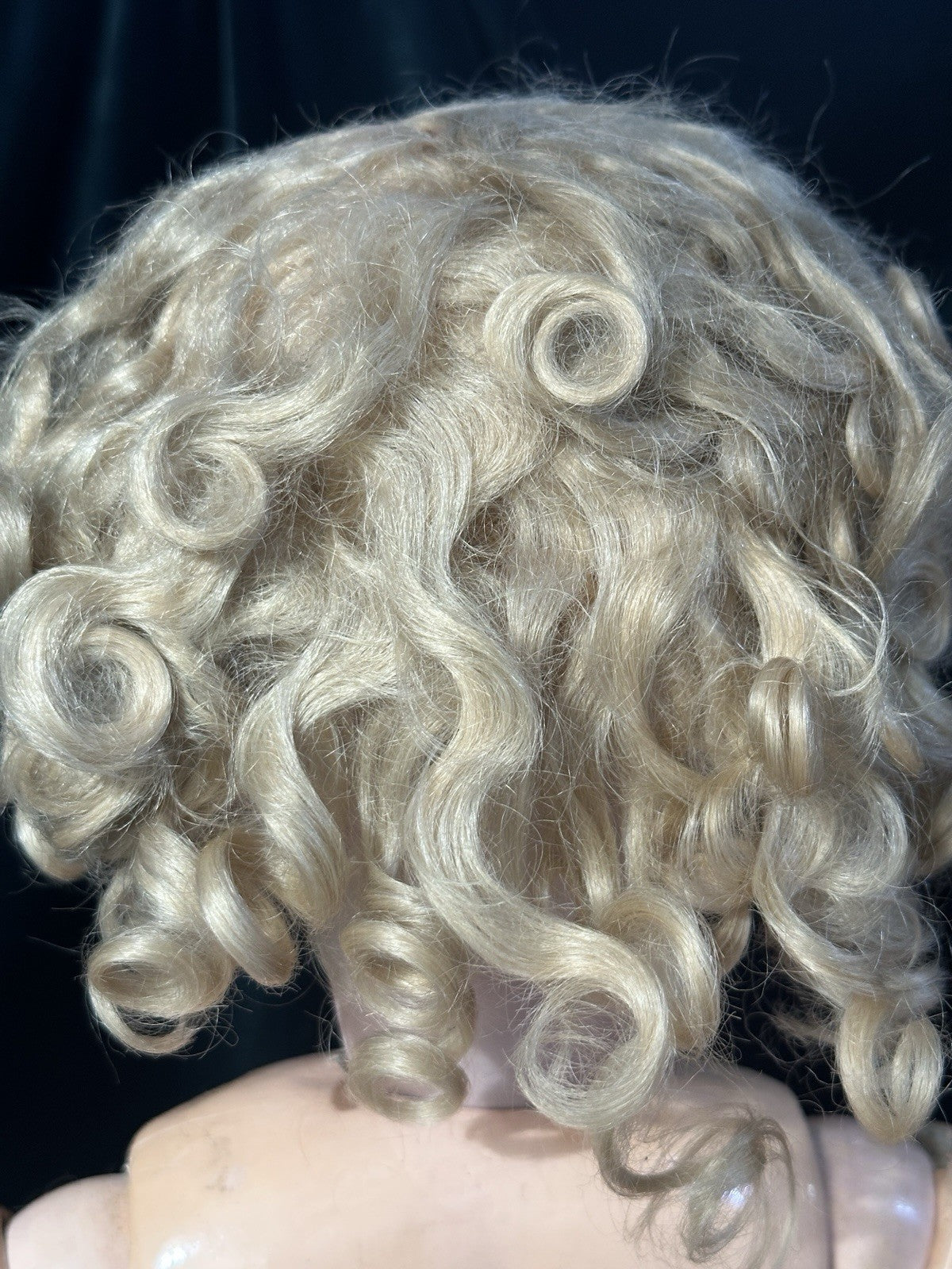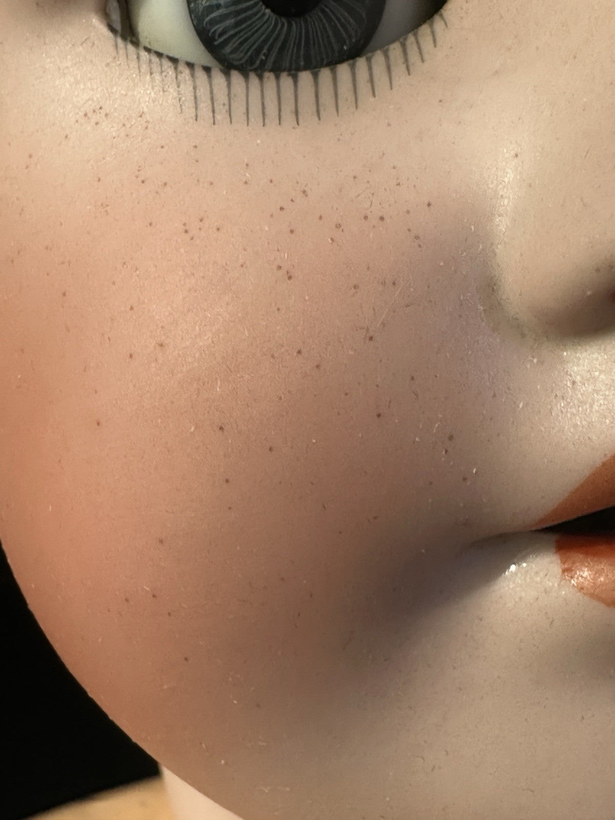 Bisque socket head, blue glass sleepy eyes. No visible damage to the bisque head. Painted lower and missing upper lashes. Open mouth with teeth. Pierced ears with new earrings. Some chipped areas around piercings hole is present. Original hair wig; partially attached to her head. Glue residue is present around the rim of the head. Some black specks to both cheeks - see photos.