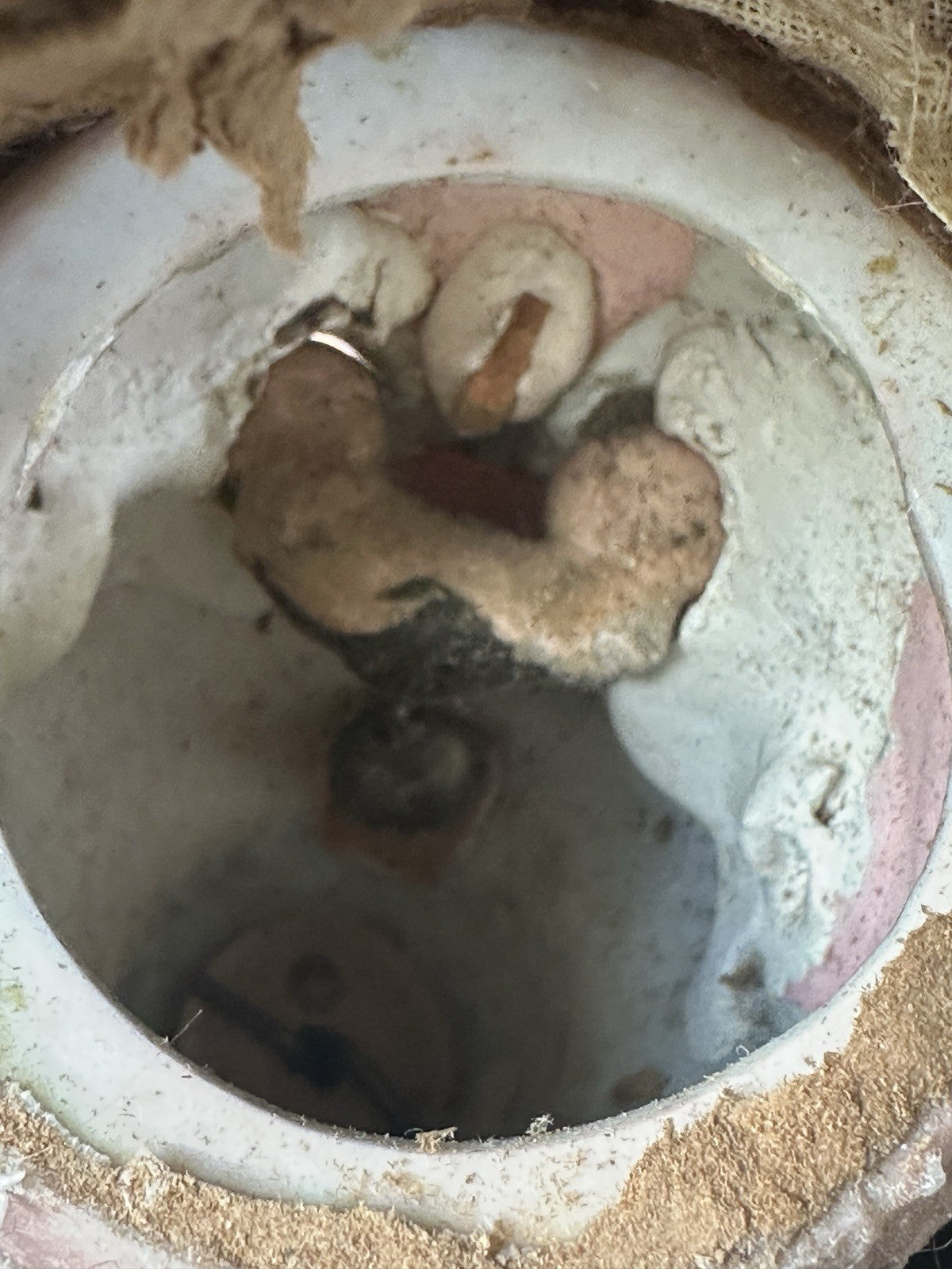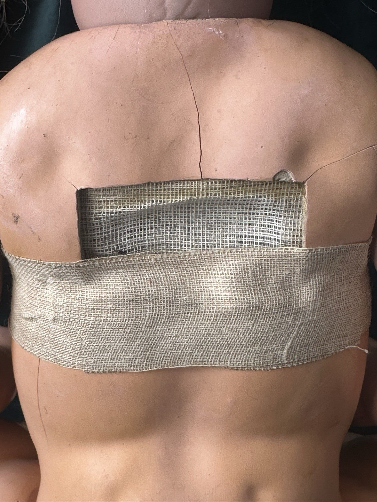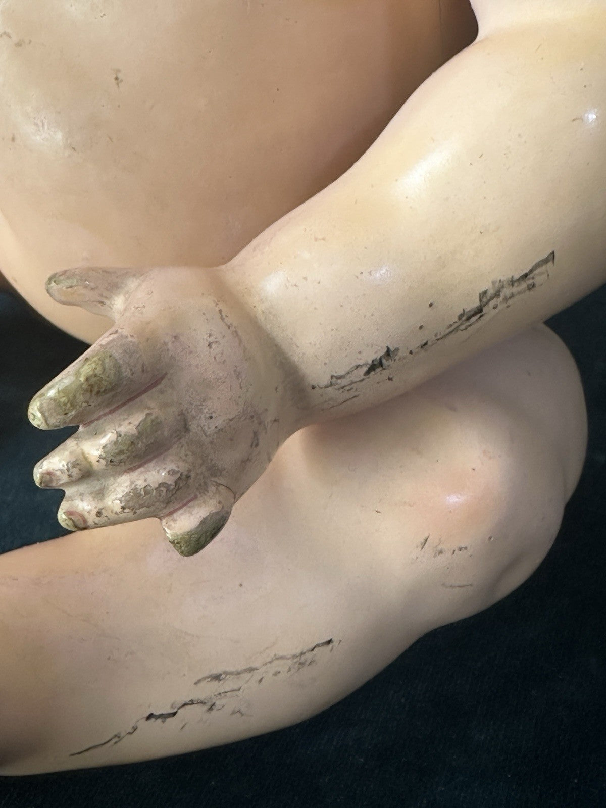 Composition body. Has a few rough areas - see photos. Cryer is not working. Crazing, cracking, scratches are present to his composition body. Stringing is ok.