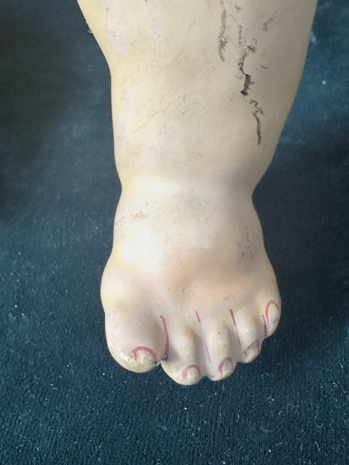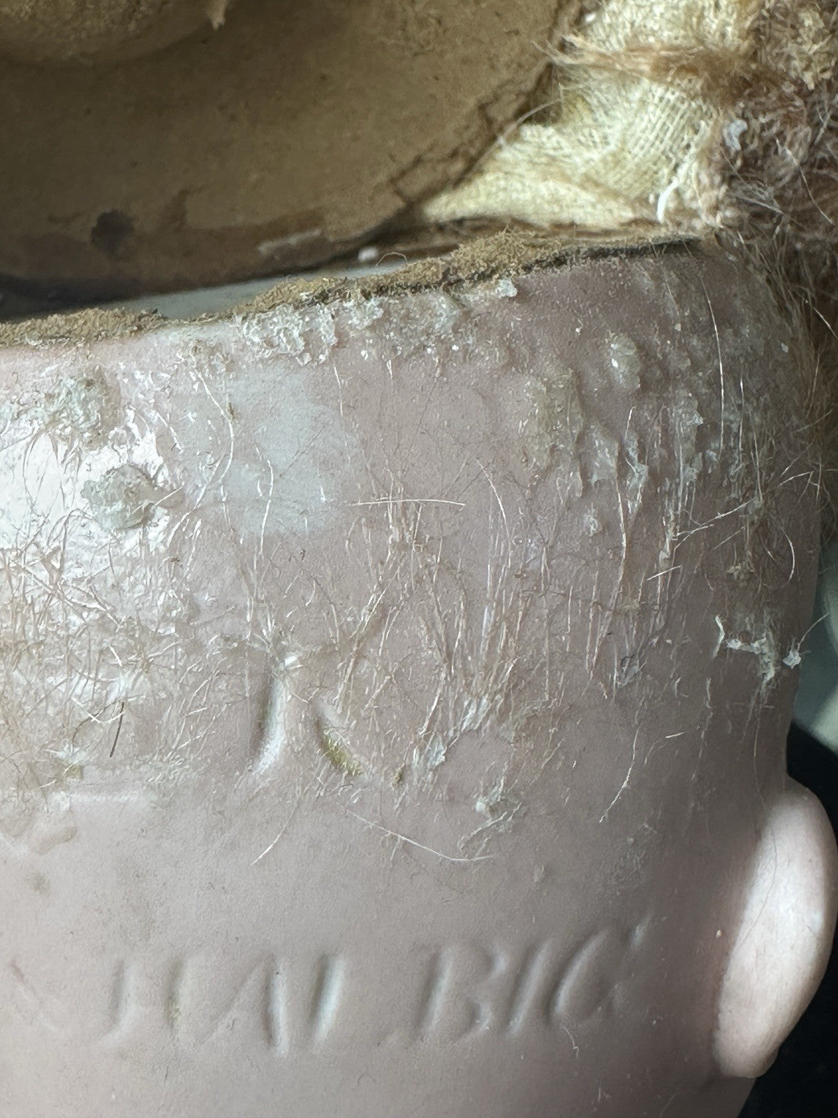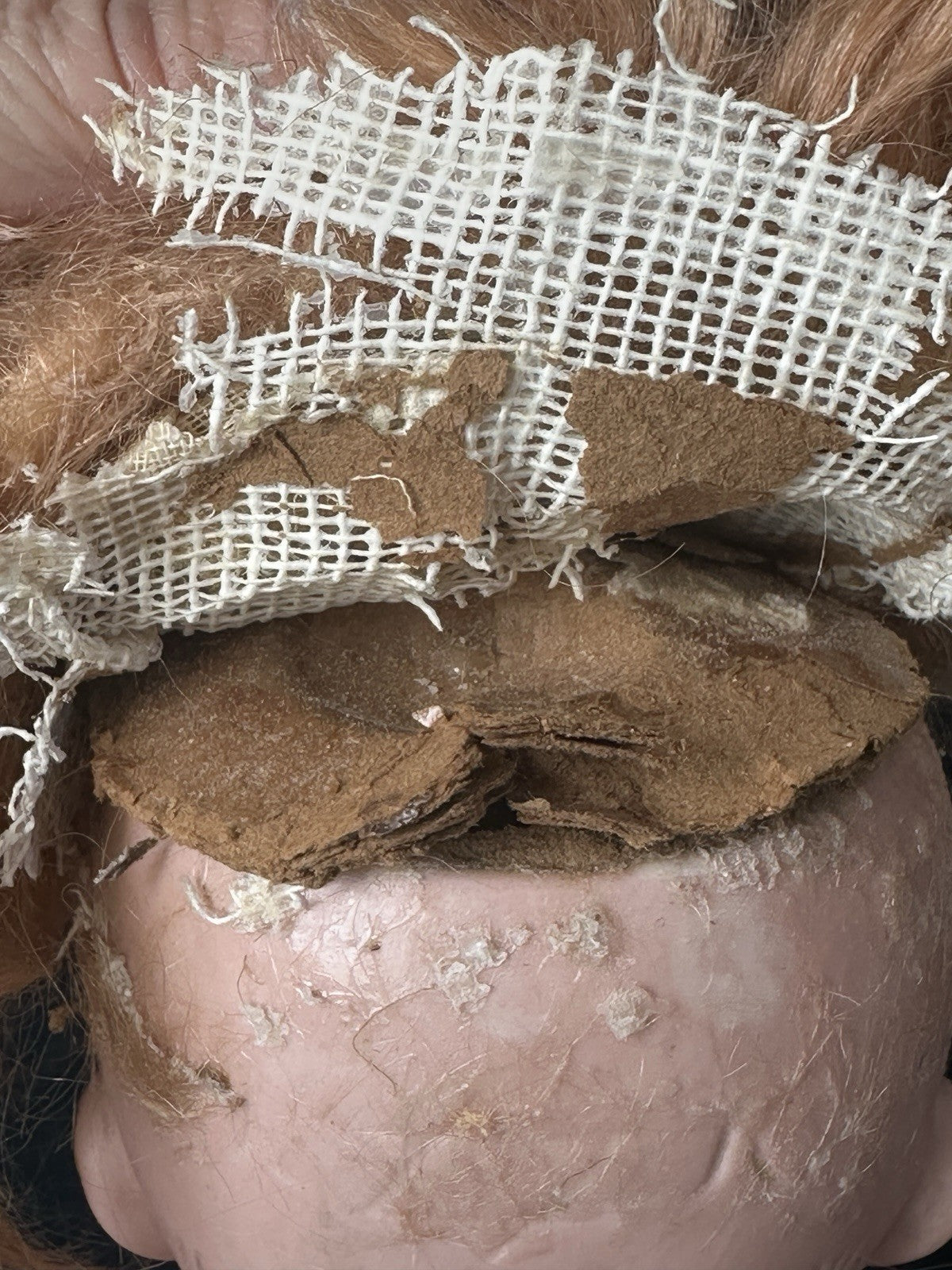 Bisque socket head, blue glass sleepy eyes. Eye pupils seem to be different. Heavy glue residue around the rim. Painted lower and upper lashes. Open mouth with teeth. We are not sure if wig is antique.
