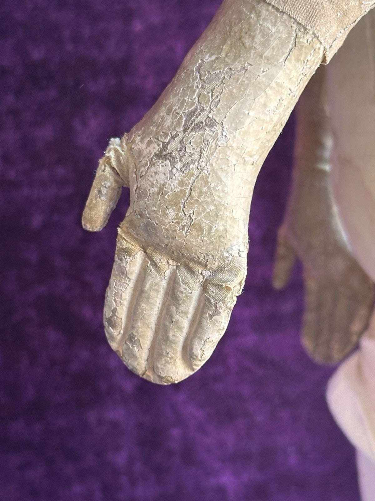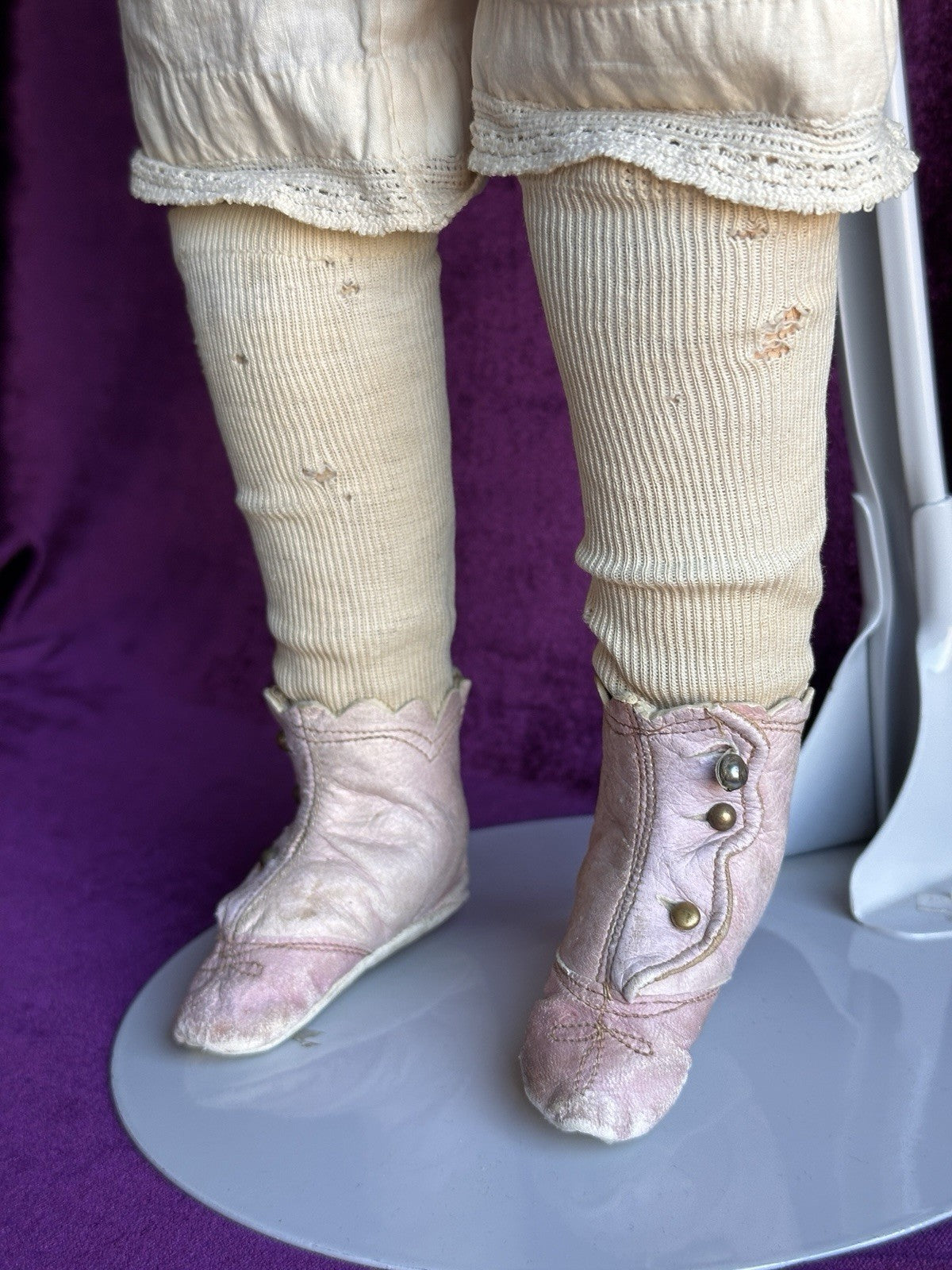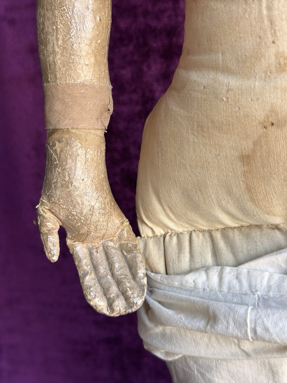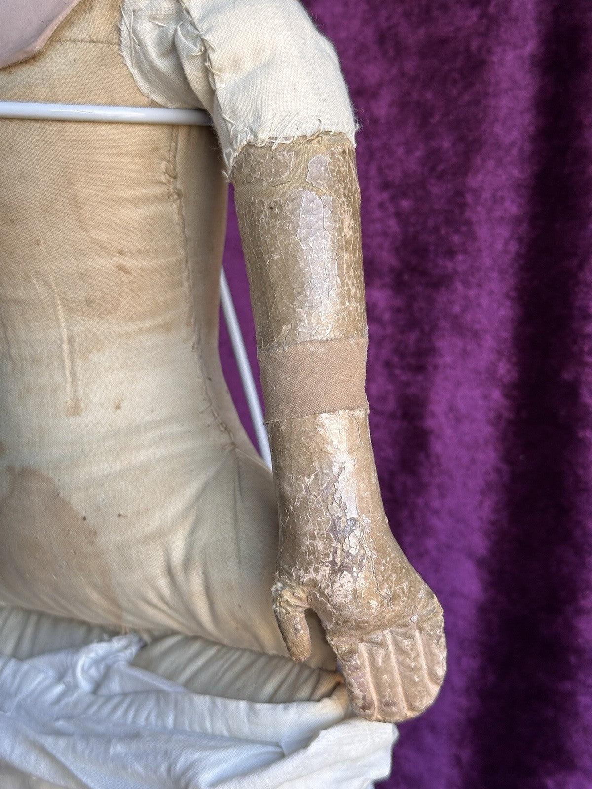 Very beautiful and large doll! The shoulder head has some repaint, but overall the doll looks good. Some cracking and paint flaws to the doll. The upper part of the arms is replaced. The lower arms are painted. Repair to the right arms. Original torso shows typical wear, including stains. The doll is coming dressed as shown. Her clothes are antique and show typical wear. All the flaws are shown on the photos. The doll is coming with antique mirror. Please refer to the pictures for more details. No stand is included.