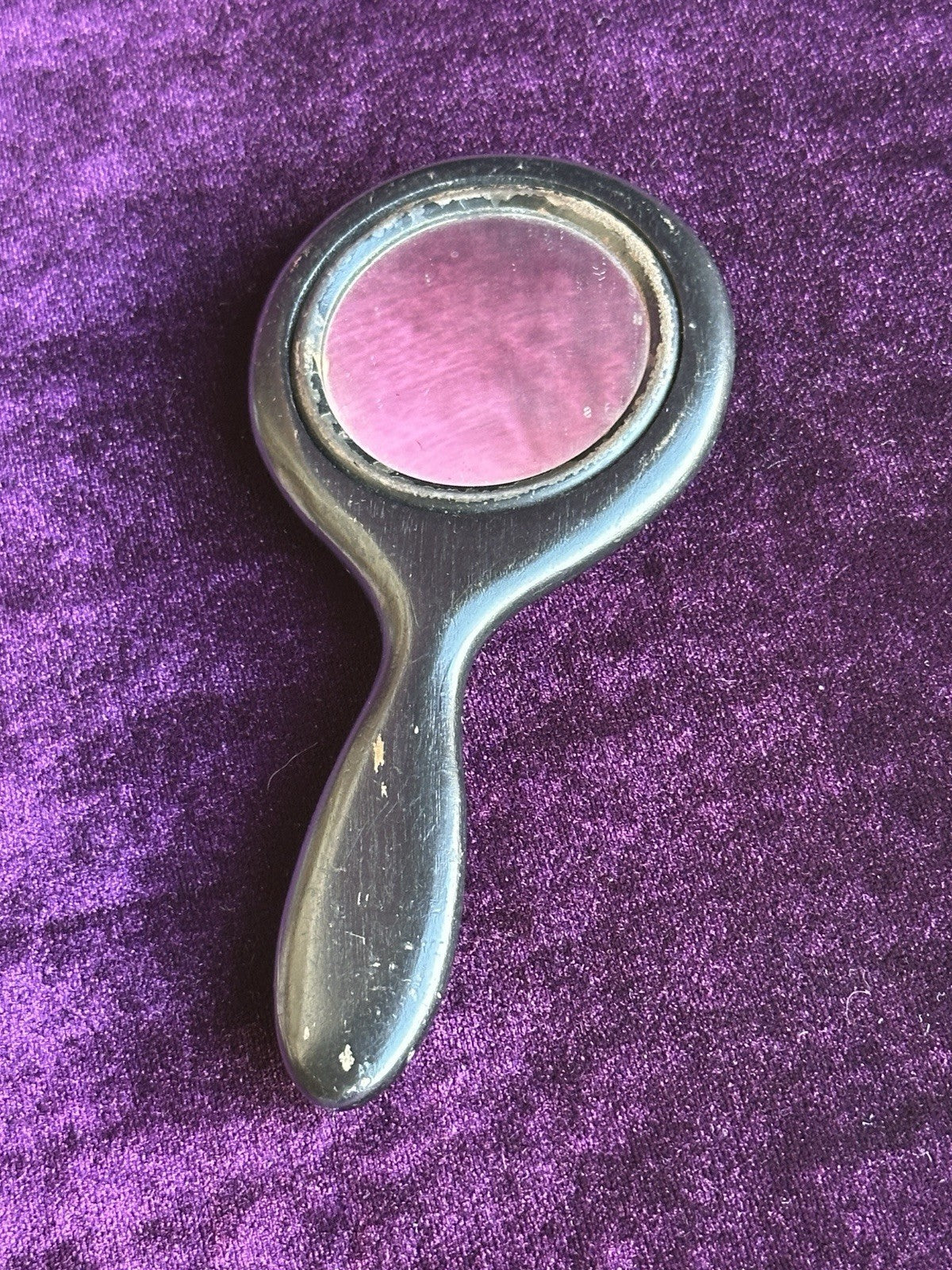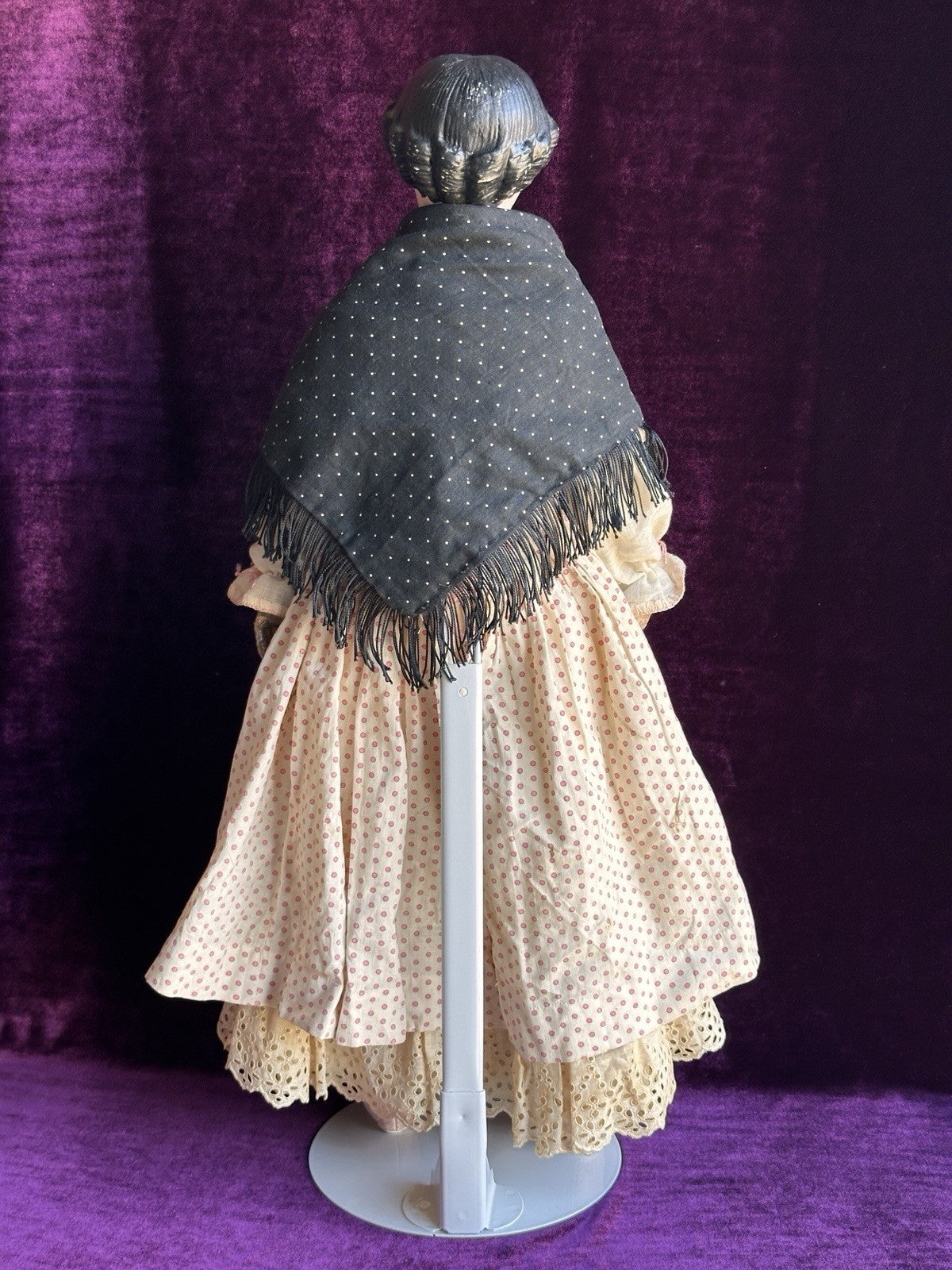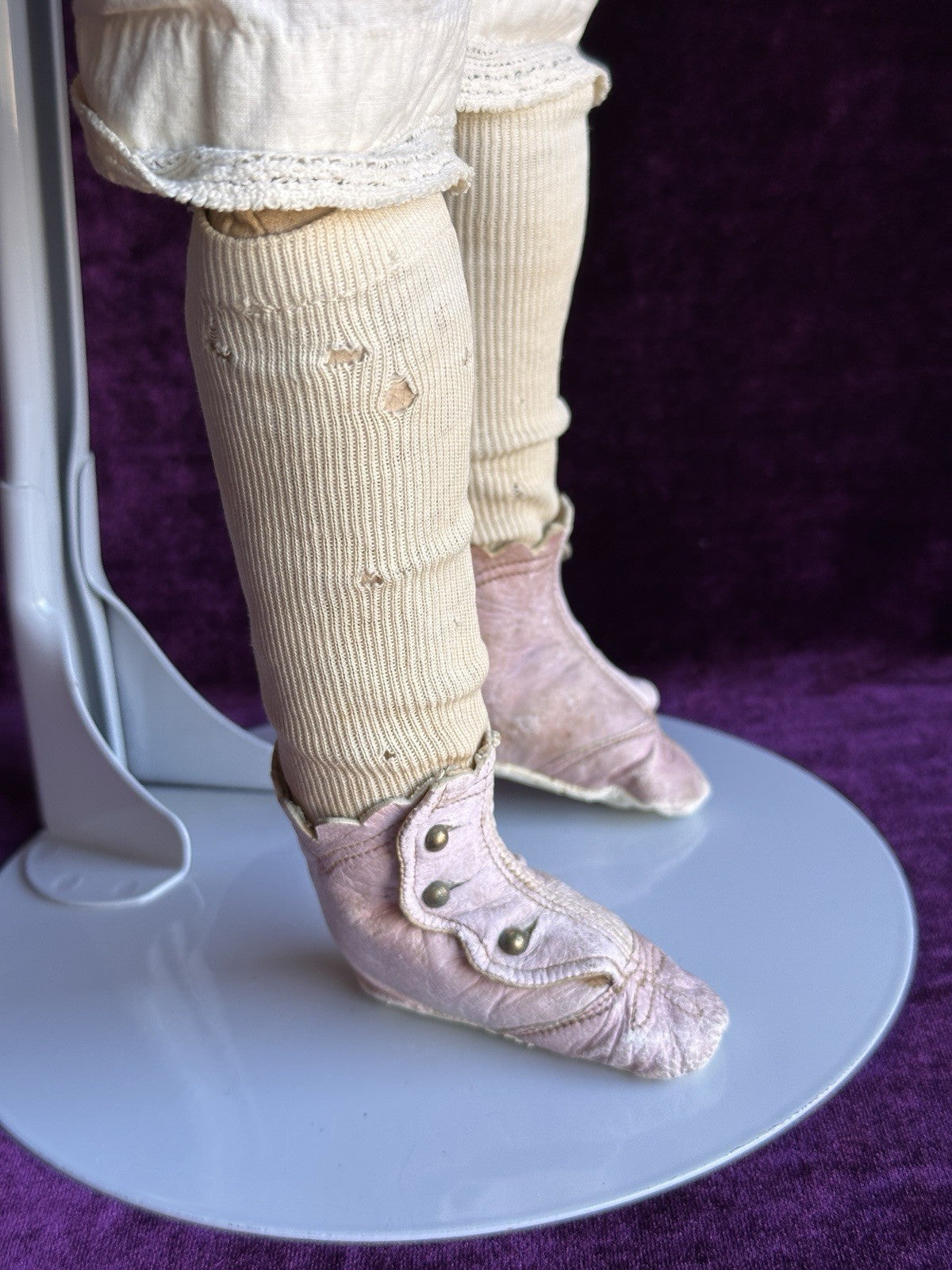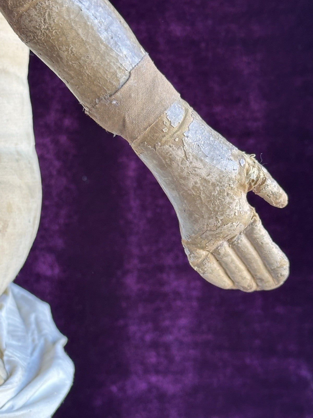 Very beautiful and large doll! The shoulder head has some repaint, but overall the doll looks good. Some cracking and paint flaws to the doll. The upper part of the arms is replaced. The lower arms are painted. Repair to the right arms. Original torso shows typical wear, including stains. The doll is coming dressed as shown. Her clothes are antique and show typical wear. All the flaws are shown on the photos. The doll is coming with antique mirror. Please refer to the pictures for more details. No stand is included.