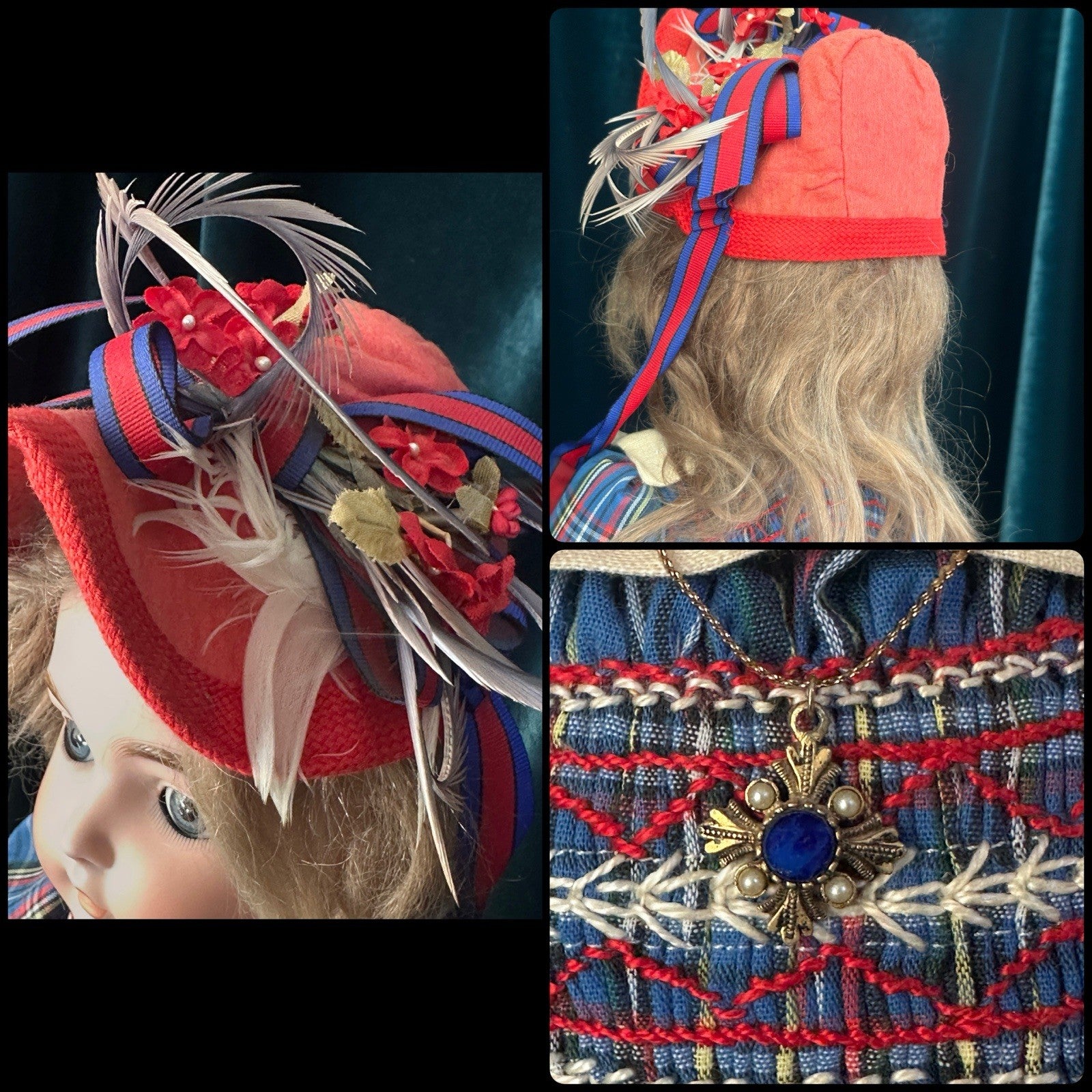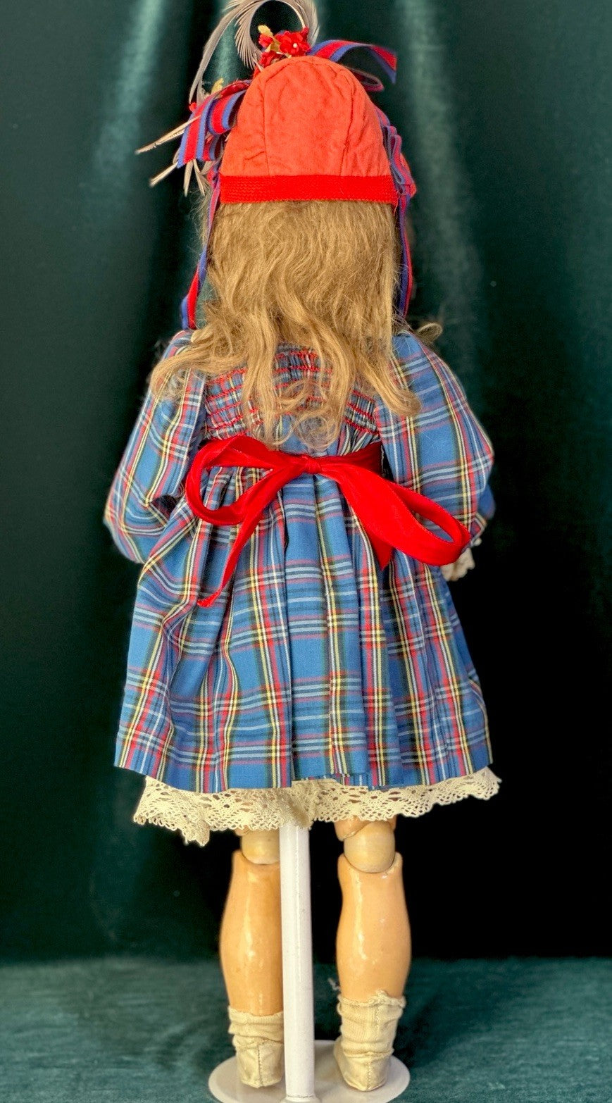 Cute outfit but is small for this doll. Dress is most likely vintage or antique. Stand is not included.