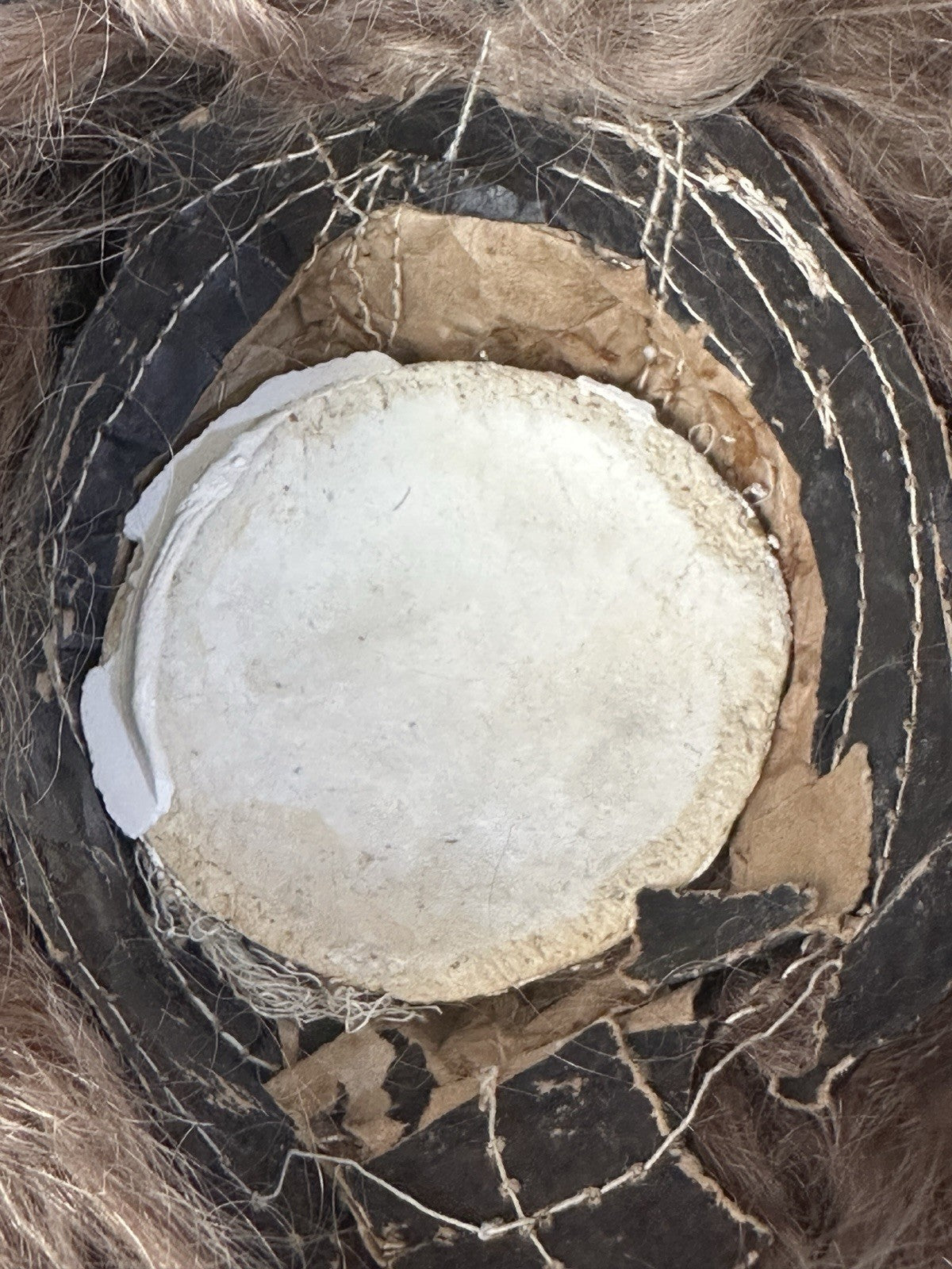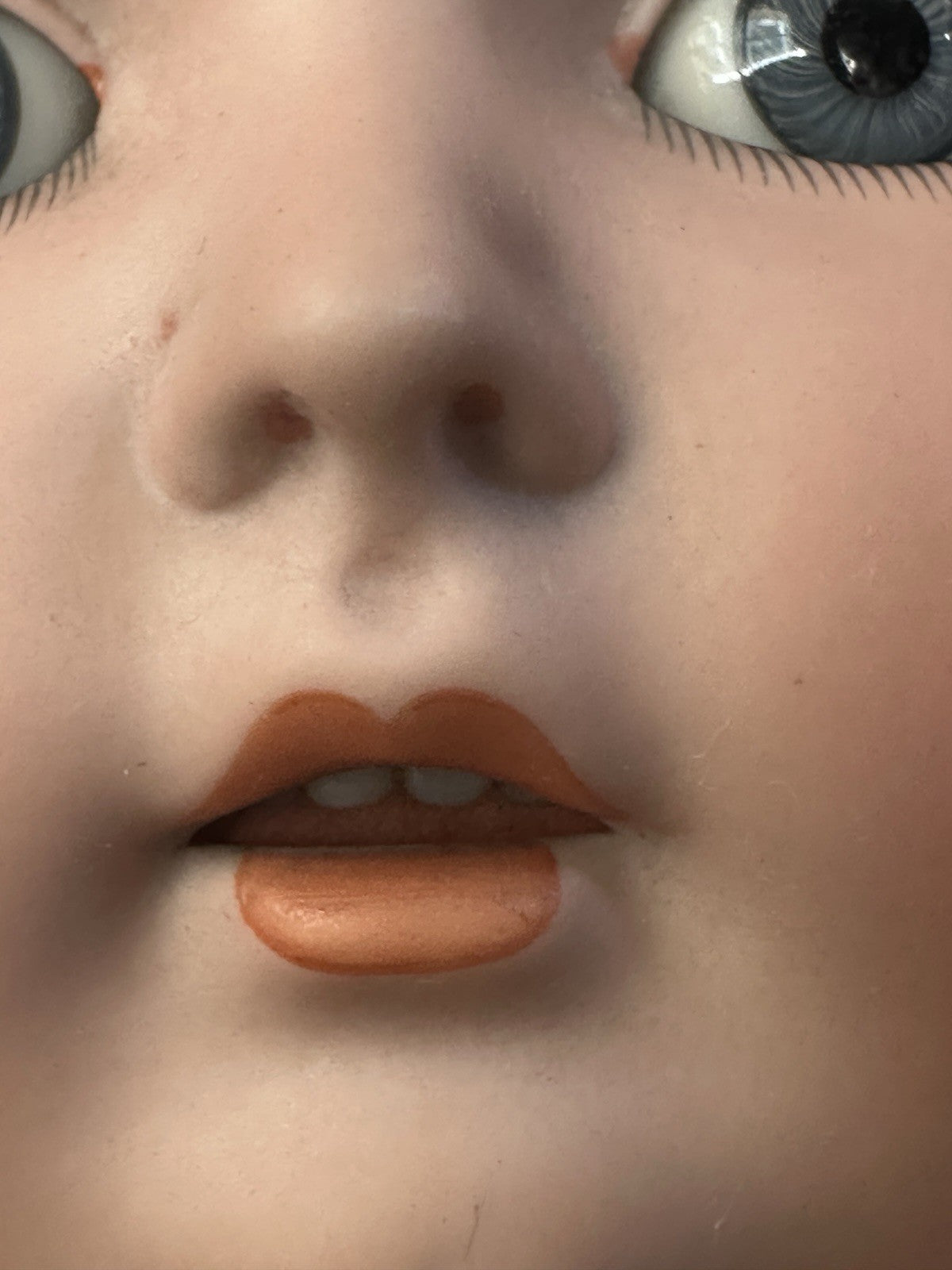 Bisque head; no visible damage. Marked on the back of her head. Sleepy blue glass eyes. Missing upper lashes; missing some paint to her eyelids.