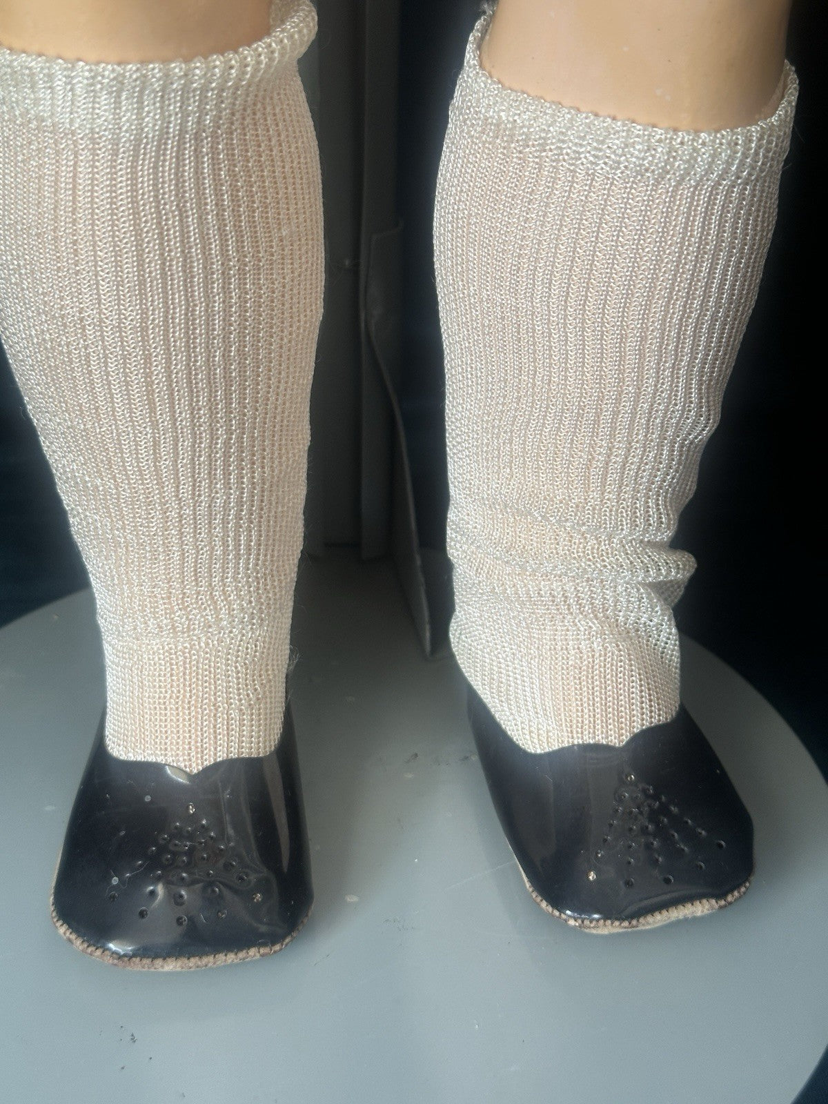Her body is all composition; stamped. Stringing is ok but not very tight; she cant strike s pose. Some crazing/cracking, shabby areas are present- please see all photos as they are part of the description.