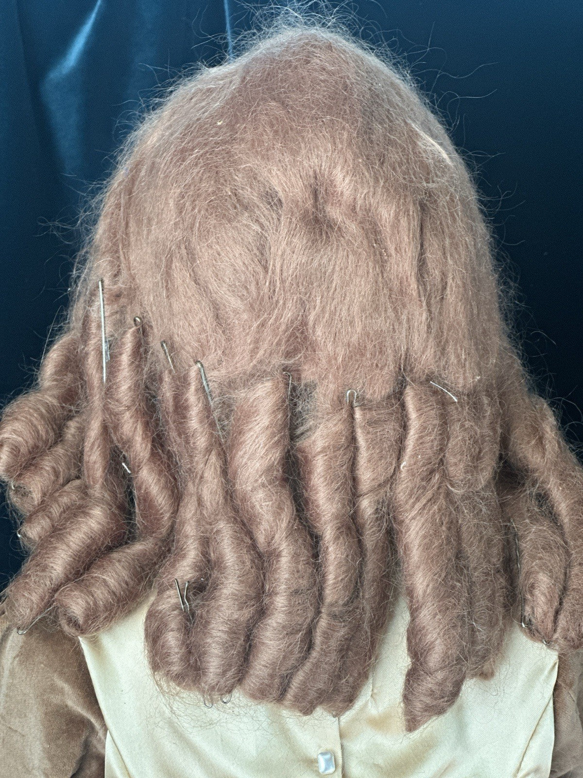 Bisque head; no visible damage. Original sealed pate. Marked on the back of her head. Sleepy blue glass eyes. Wig is new; not attached to her head.