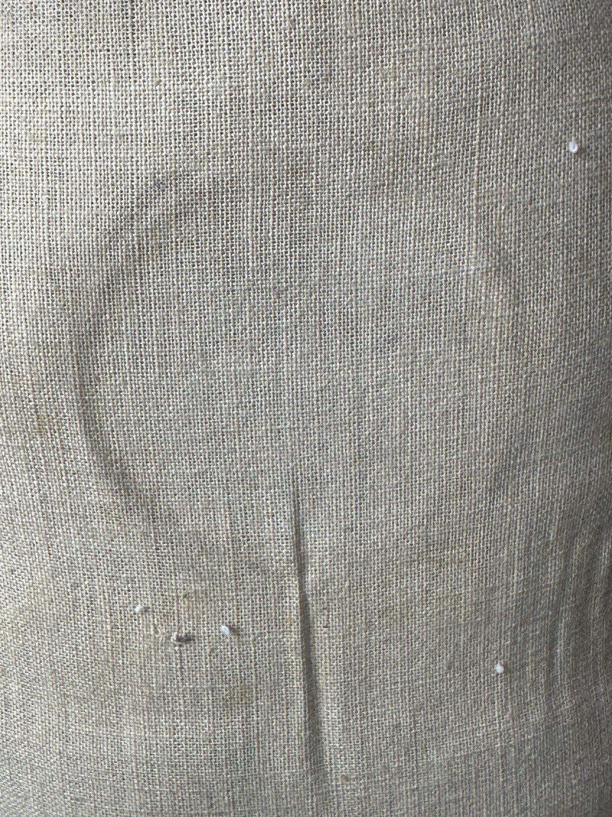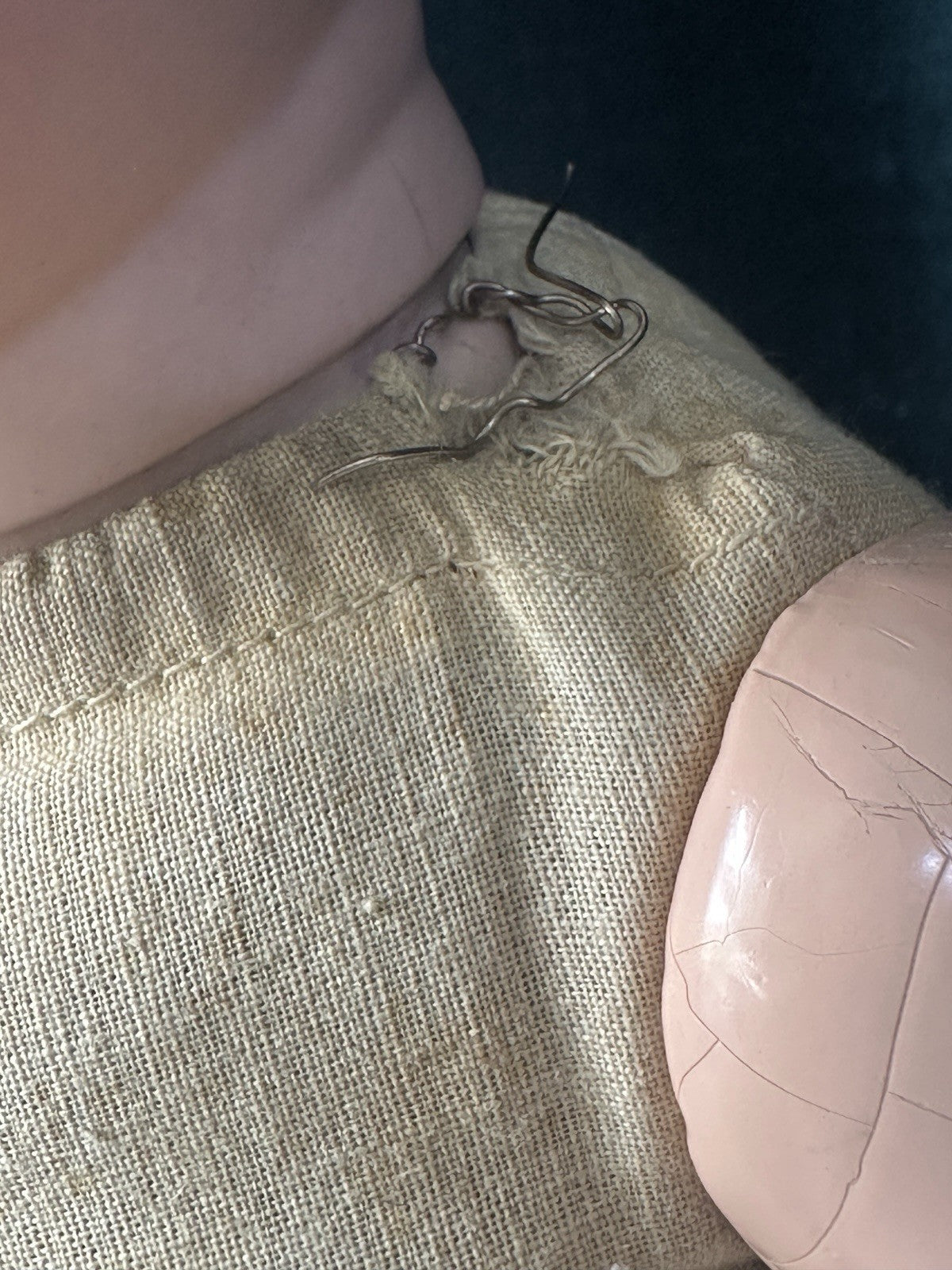 Created by Kestner; Century baby character doll. She is about 18" tall considering bent knees. Solid domed bisque head with flanged neck,painted baby hair, brown glass eyes - stuck and not closing all the way down, painted lashes,closed mouth . She has a muslin baby body and legs and composition arms. Some crazing is present to her composition arms. Cryer is not working. She is wearing a new and vintage clothes. Stains and holes are present to all parts of her outfit. Toy id not included.