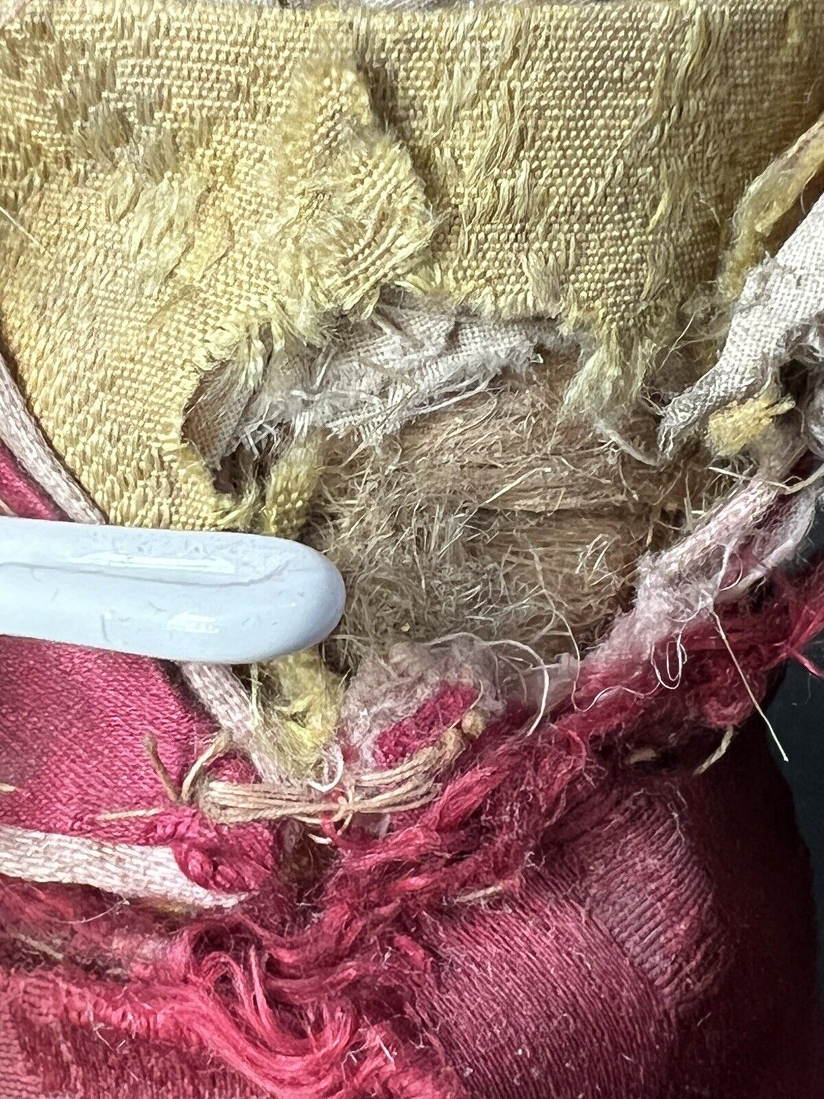 The head set with glass eyes. Flaky paint, peeling areas, scratches and cracks are present. Figure is dressed in the original silk and cotton clothing ; all clothes are in poor condition.