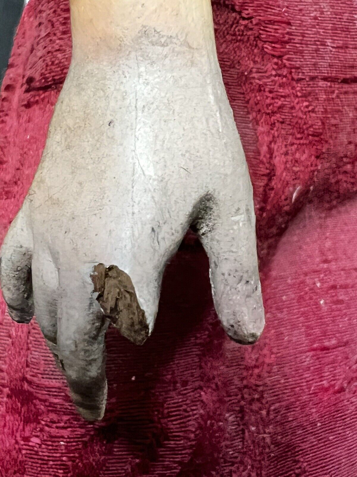 This figure is about 14 1/2" tall ; doesn't have a a wooden base. Created with the finest details including realistic glass eyes and natural materials. His head and legs are made of a polychrome terracotta (often made from painted over ceramic). Hands made of wood; mussing finger (see photo). The rest of the body seems to be pressed hay. Right arm is flaccid (might be broken inside under the clothes).
