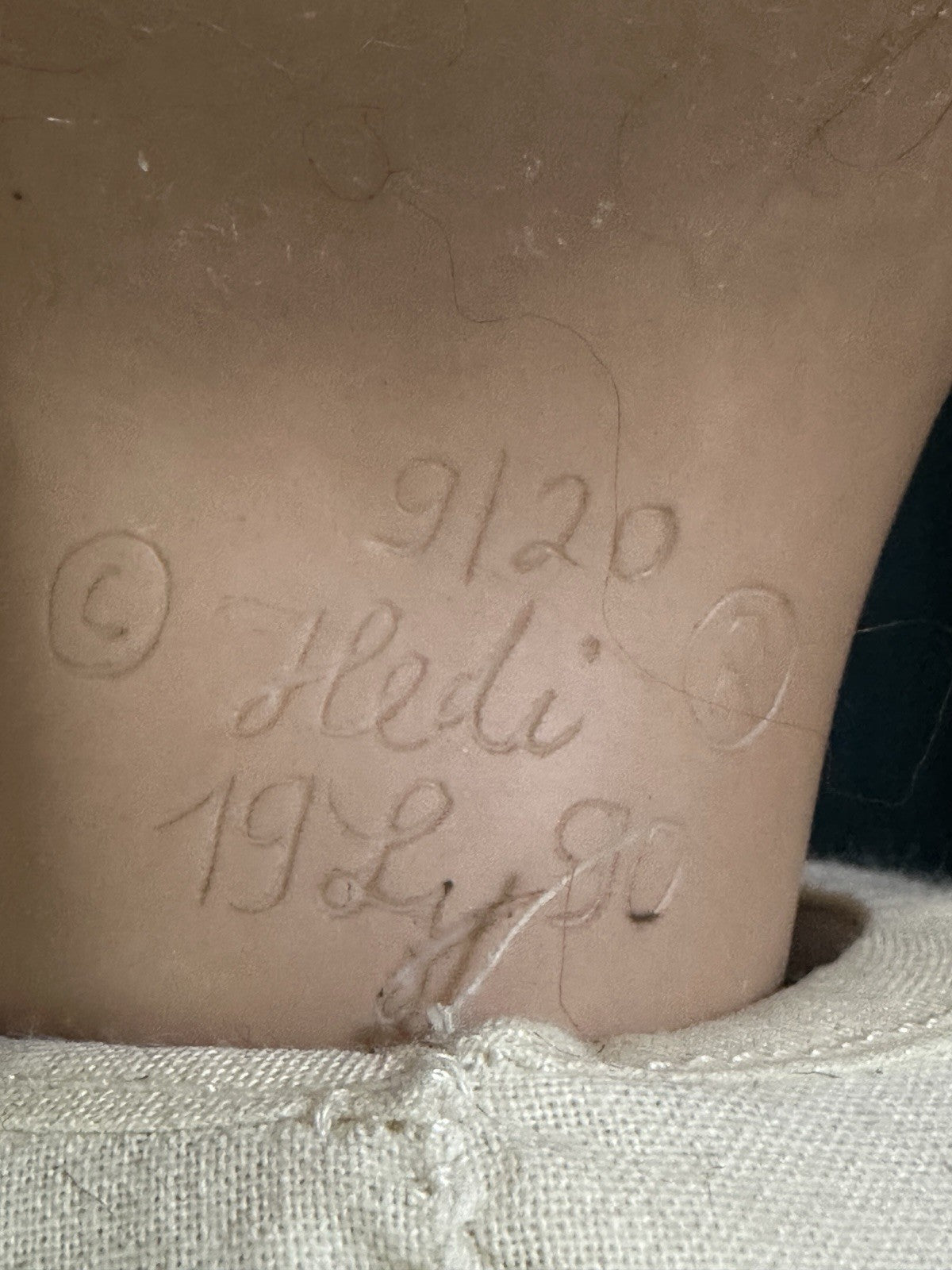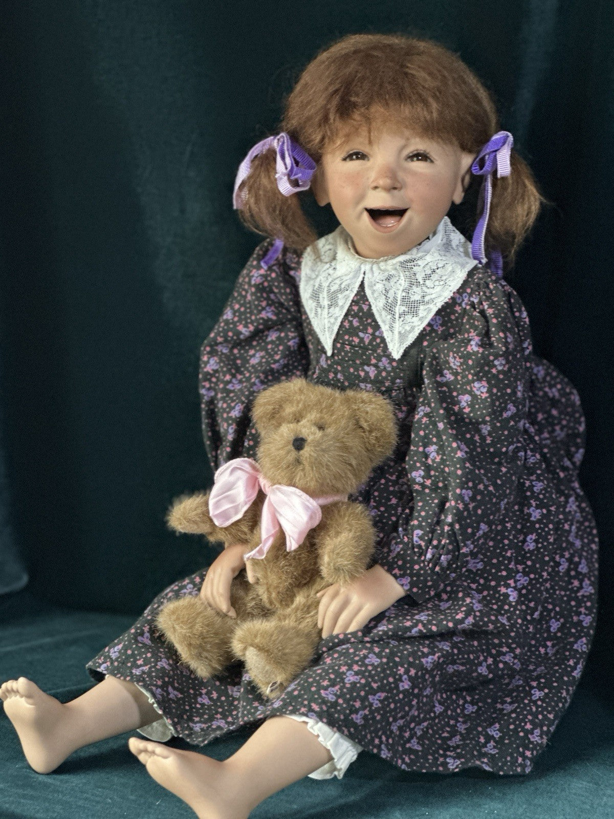 Rare limited edition doll by German Artist Grossle-Schmidt. She is one of the limited edition of 20 dolls only!!!Her name is Heidi and she is about 24" tall. Signed on the back of her body and marked on her head- see photos. Hand painted realistic face features. She has porcelain head and partial arms and legs. The rest of her body is stuffed cloth. Her outfit seems to be original but is not tagged. Teddy bear is not original to this doll and is not included. Stand is not included as well