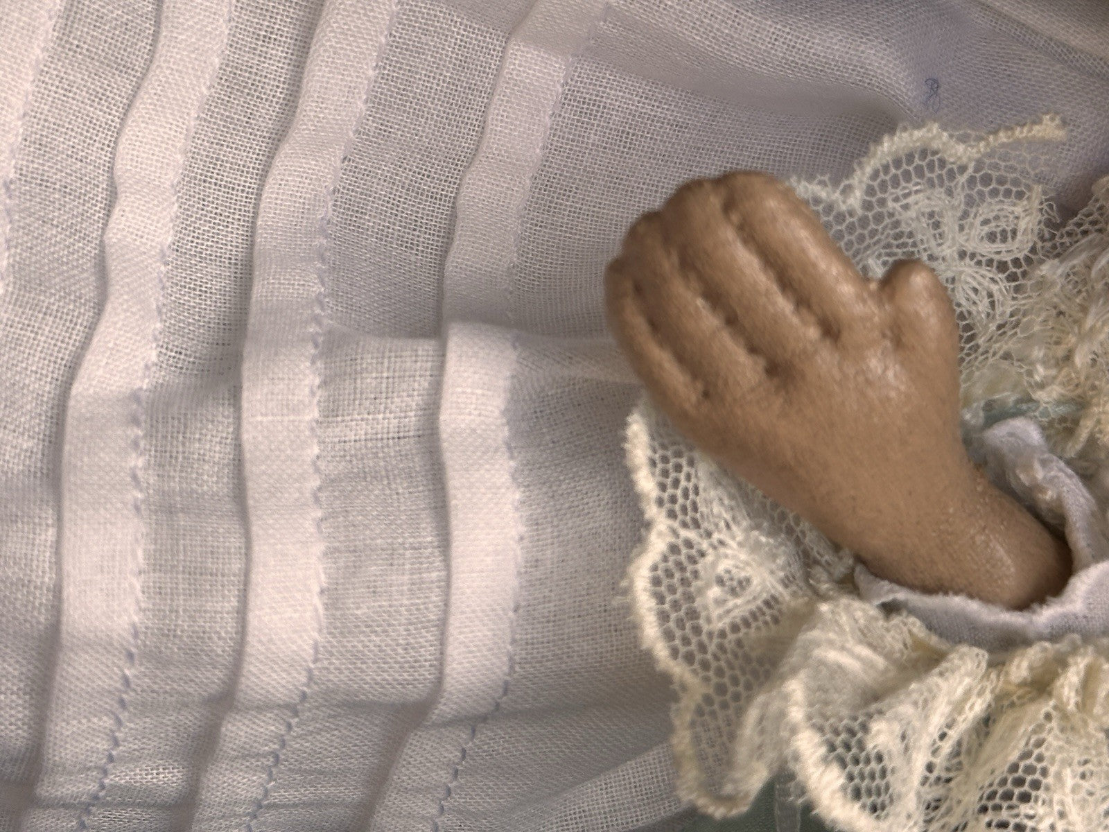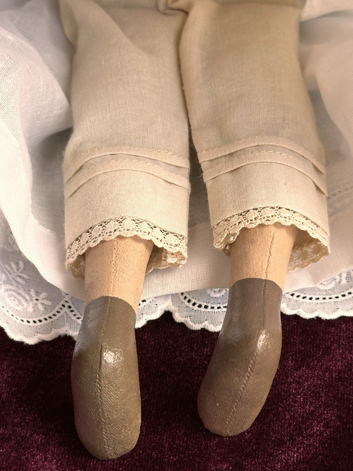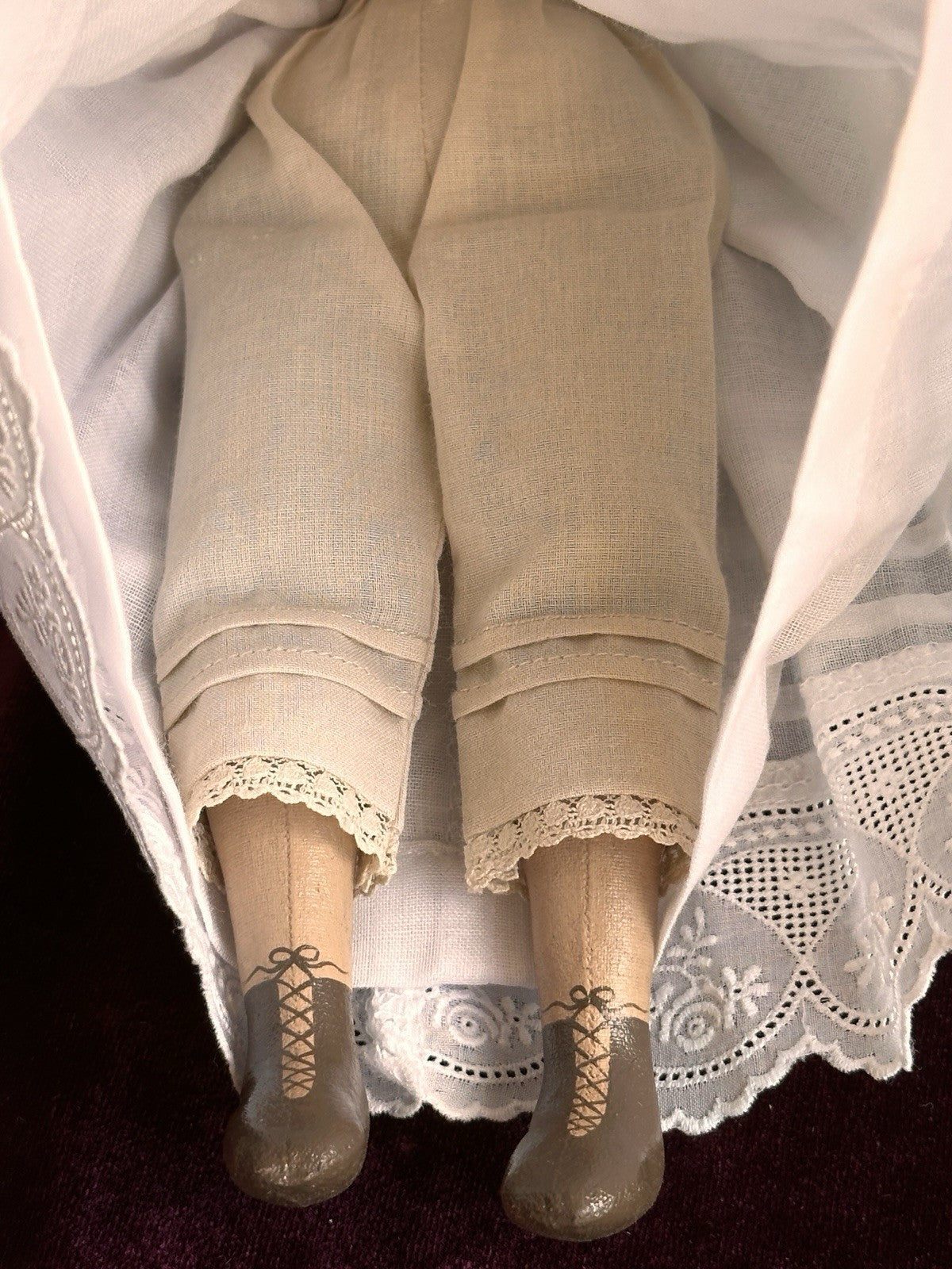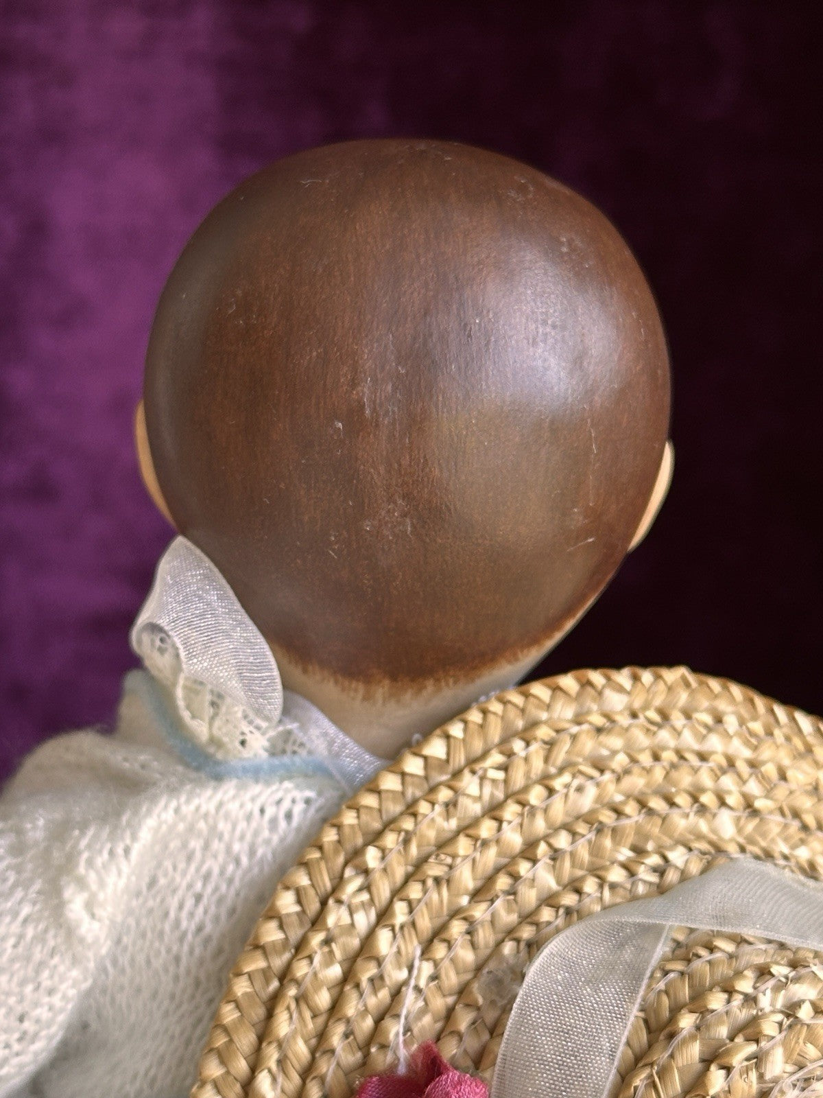 This very cute doll is in great condition. She is signed and dated by the artist. The head is made of some hard material, possibly papier-mâché, and the rest of the doll is cloth. The doll has no damage and no wear was found. She looks like she is dressed in original clothes, which are also clean and in great condition. There are small pieces of wax inside the hat, possibly put there to hold the hat in place. There might be some wax residues on the head. No box or certificate to the doll.
