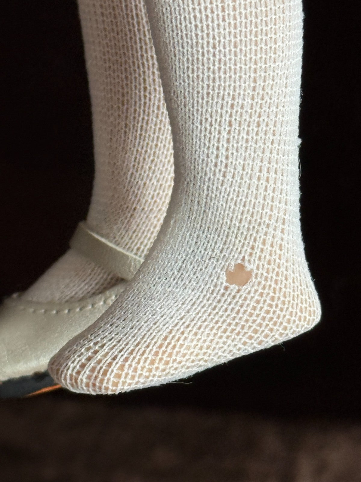 She has been redressed. There is a hole to one of the stockings. The shoes are original to the doll. No stand or box are included.