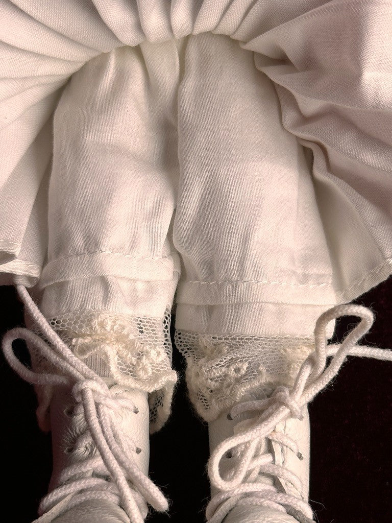 Adorable little dolly that is beautifully dressed. Her original clothes are not including the coat and the hat. These are beautiful additions to her look. The shoes are also not original to the doll. They are leather and well made. The doll is in great condition. She has no damage, no wear. She is clean and ready to be displayed. No box or certificate are included.