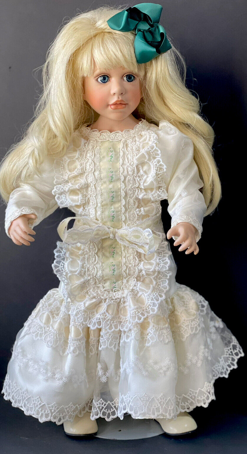 She is approximately 24" tall. Head, shoulder plate and partial arms and legs are made of porcelain . The rest of her body is stuffed cloth with armature inside.