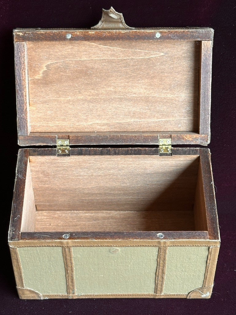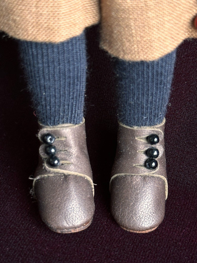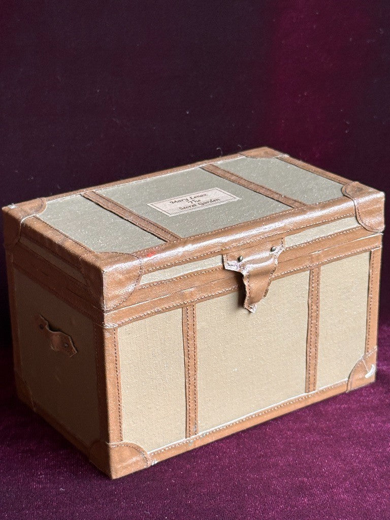The doll is in great condition with only light wear. Some parts of the doll are made of papier-mâché, while others are cloth. The doll is all original and comes with the trunk, which shows light wear.