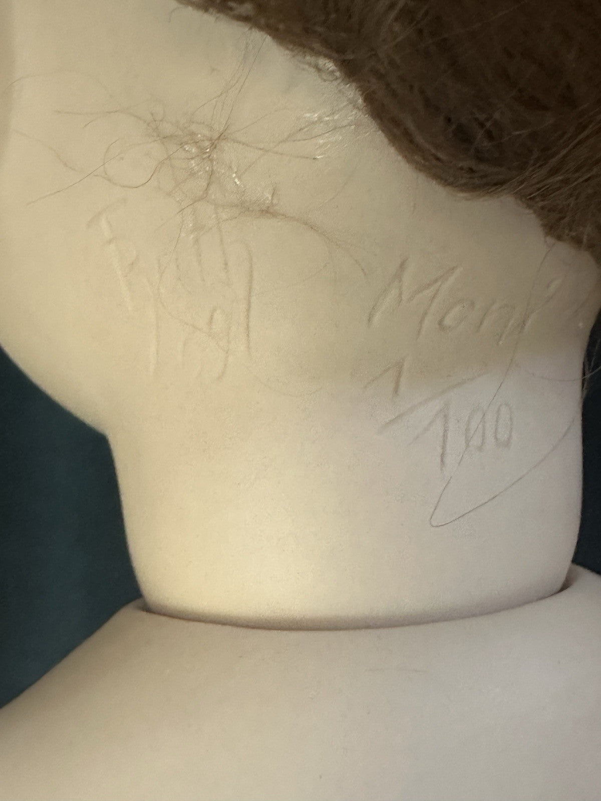 Hard to find Artist porcelain doll by Ruth Treffeisen. She is a first doll from a limited edition of 100 dolls worldwide!!!! Her name is Moni. She has porcelain swivel head, shoulder plate, partial arms and legs below the knees. The rest of her body is stuffed cloth. Beautiful face painting; her hair feels like human hair. Signed and numbered on her neck and signed by artist on her back. Comes in a simple (not signed) box and with her COA.