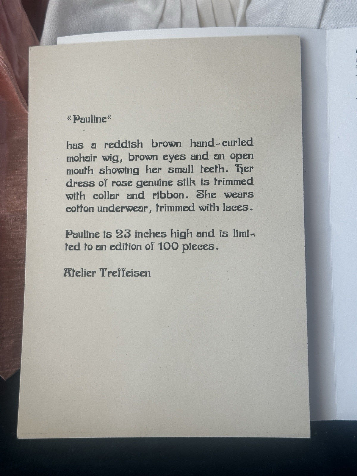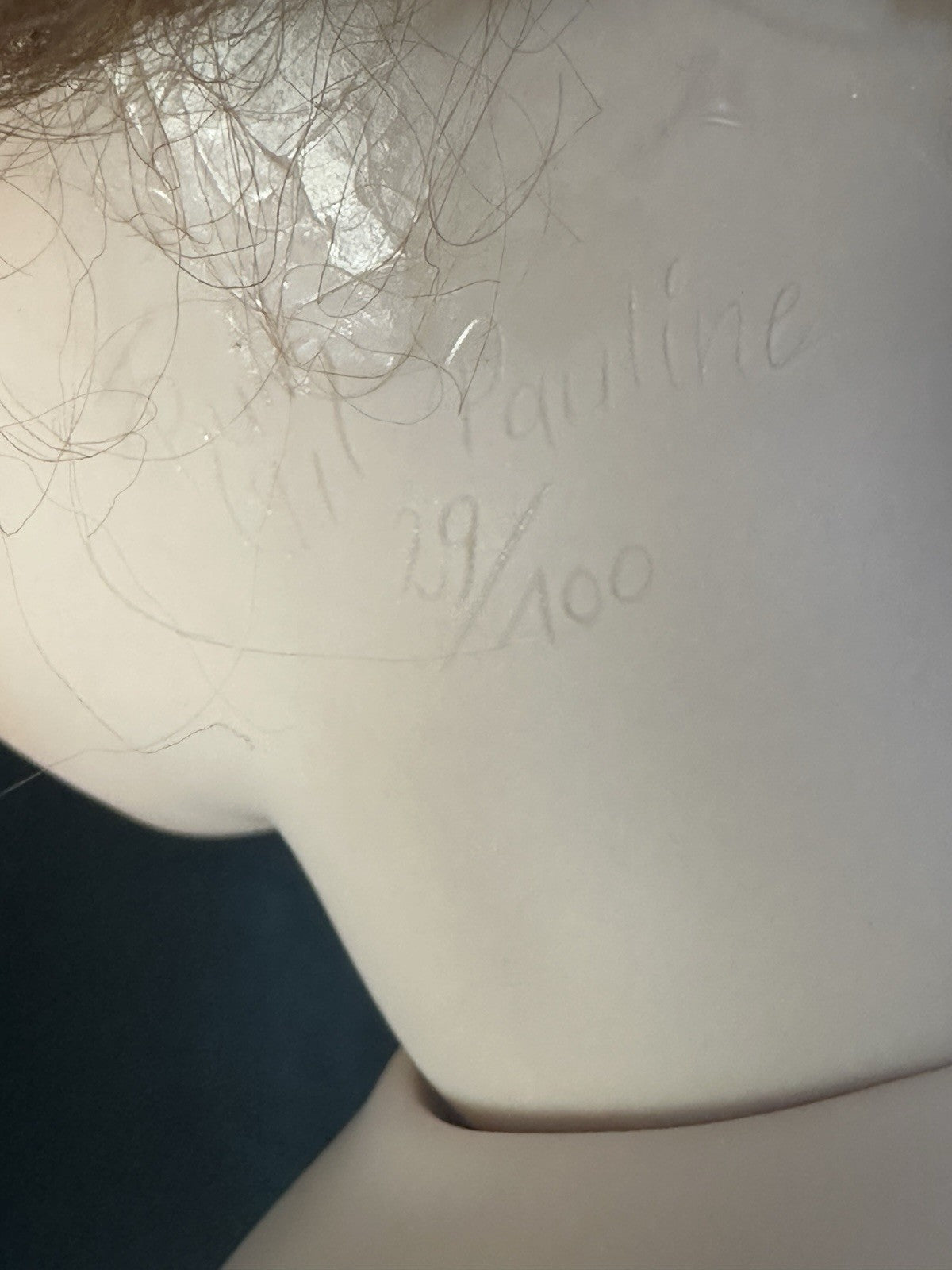 Hard to find Artist porcelain doll by Ruth Treffeisen. She is a limited edition of 100 dolls worldwide!!!! Her name is Pauline . She has porcelain swivel head, shoulder plate, partial arms and legs below the knees. The rest of her body is stuffed cloth. Beautiful face painting; her hair feels like human hair. Signed and numbered on her neck. Comes in a simple (not signed) box and with her COA.