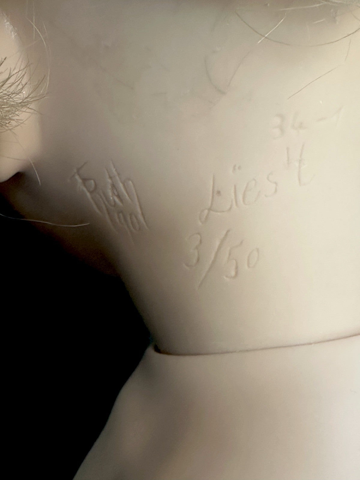 Hard to find Artist porcelain doll by Ruth Treffeisen. She is a limited edition of 50 dolls worldwide!!!! Her name is Lies'l. She has porcelain swivel head, shoulder plate, partial arms and legs below the knees. The rest of her body is stuffed cloth. Beautiful face painting; her hair feels like human hair. Signed and numbered on her neck. Comes in a simple (not signed) box and with her COA. Small stain to her cloth body - see photo.