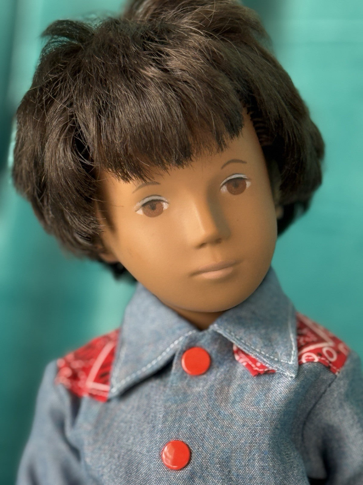 Collectible England Vinyl Brunette Boy Doll; Redressed/Denim Top