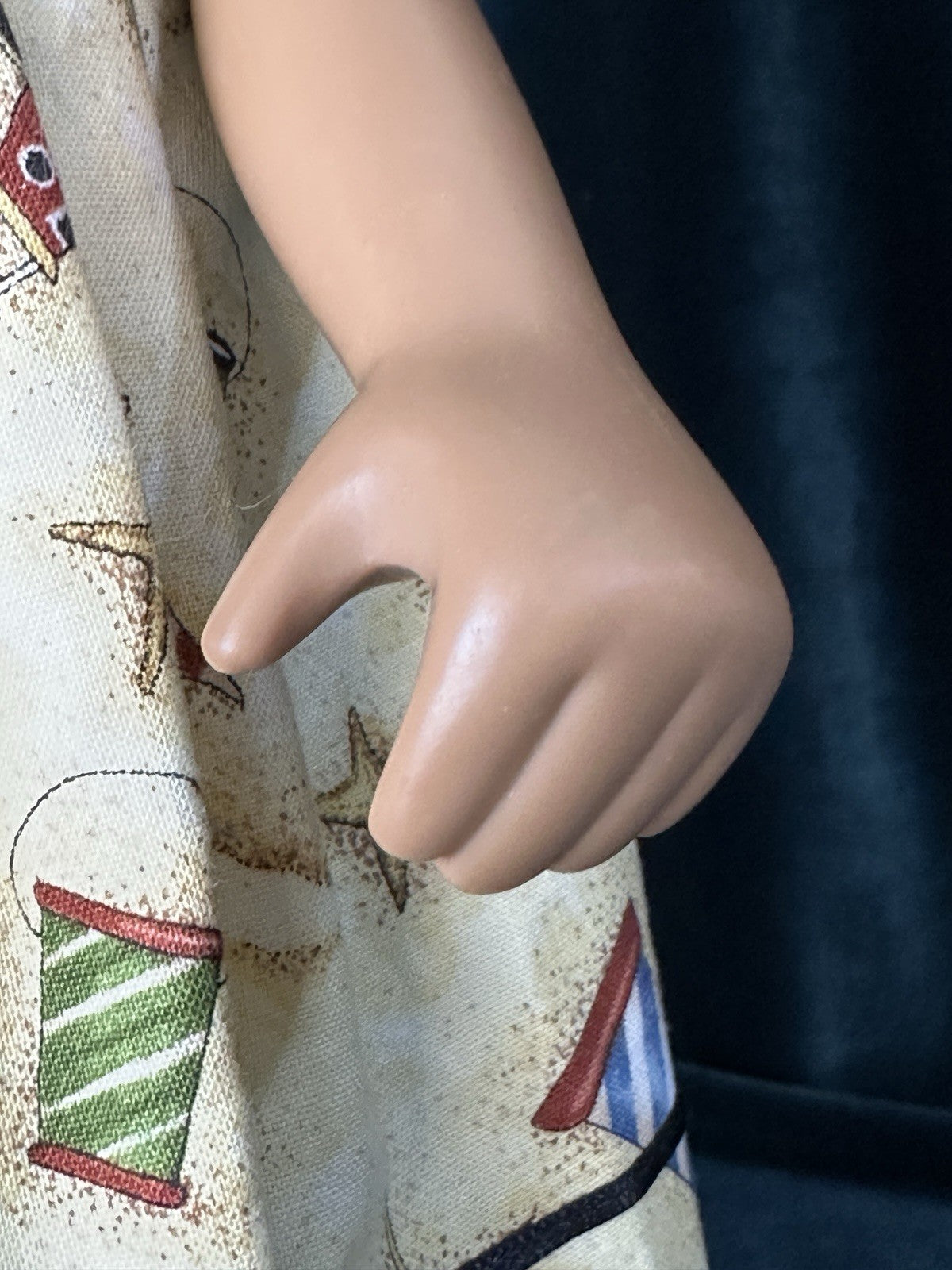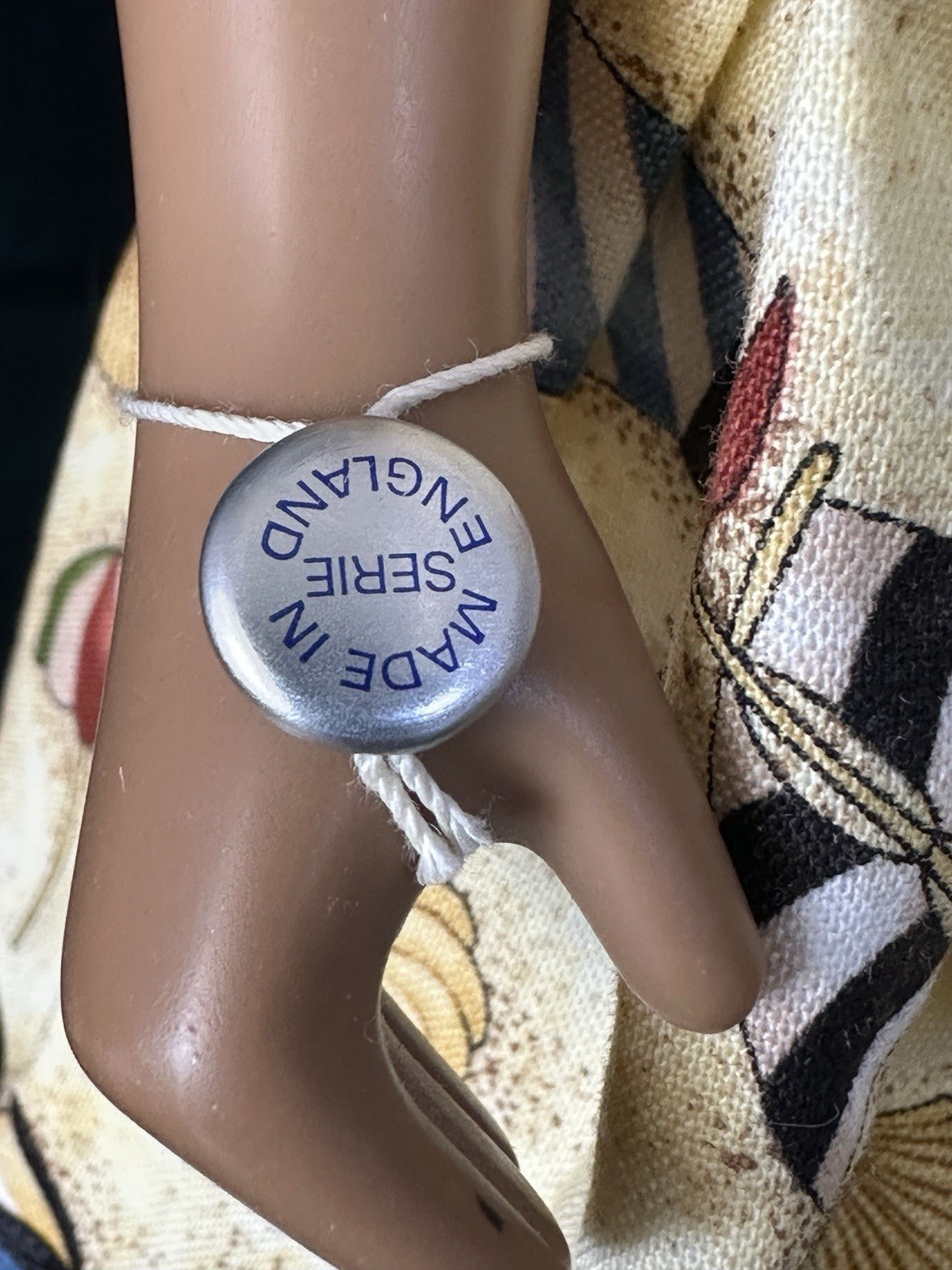 She is all made of hard vinyl material. Movable extremities. We didn't undress the doll to inspect her body. Her outfit is most likely not original. Comes with tag; no box. Toy is not included.