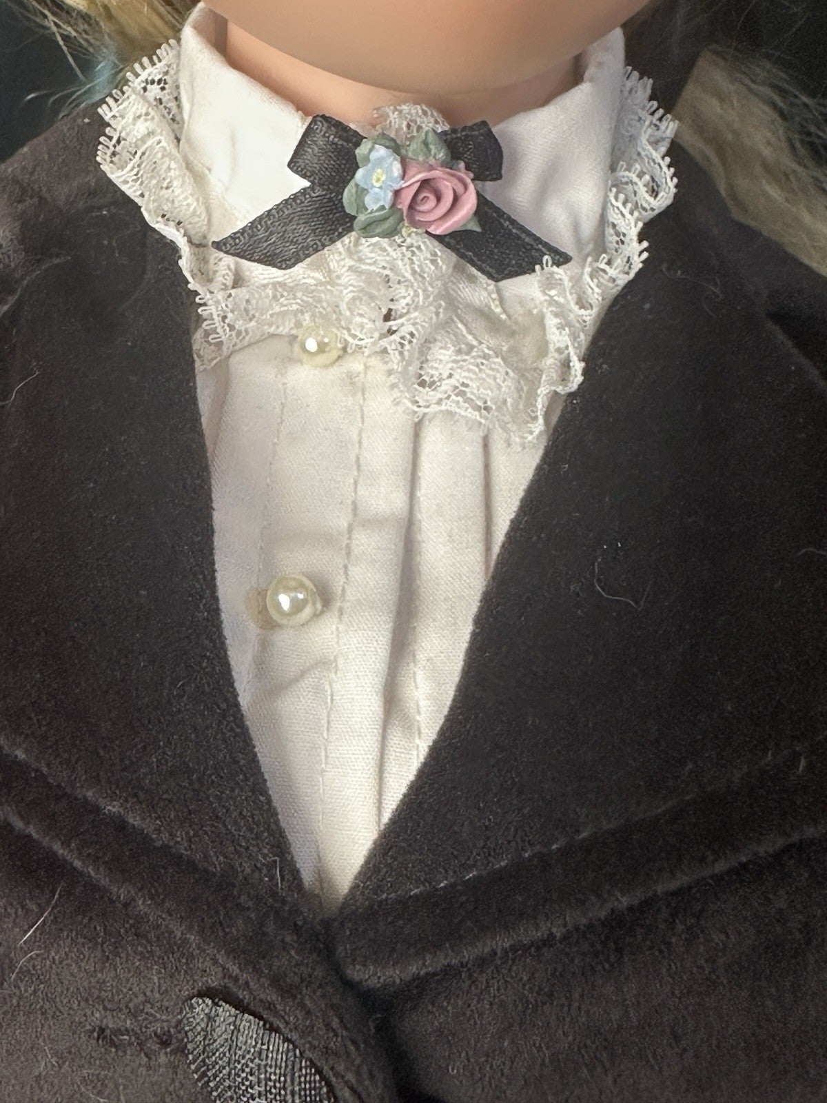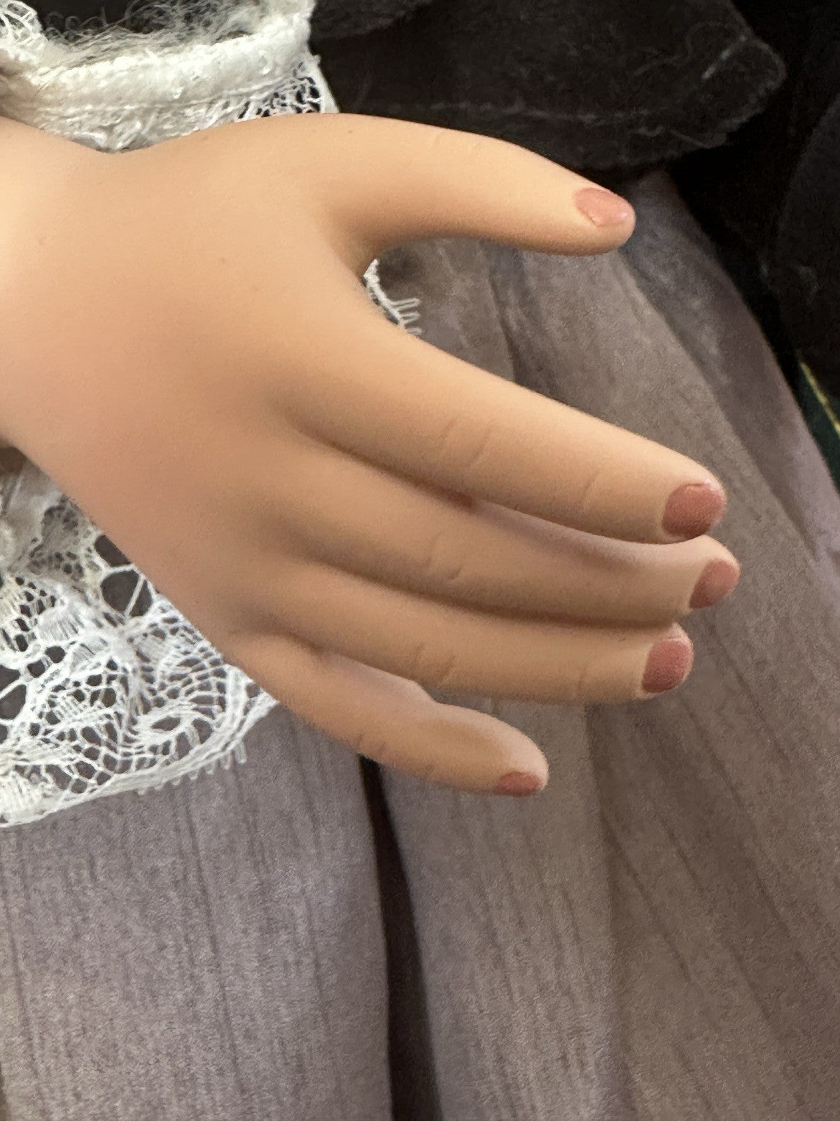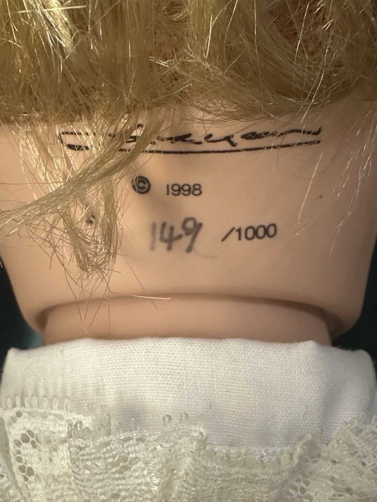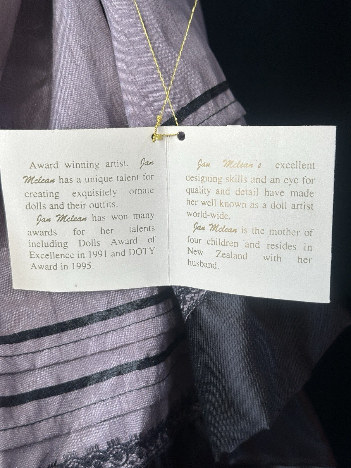 Gorgeous doll by Jan Mclean!! Her name is Patricia; she was created for Exclusively Yours collection. She is approximately 30" tall. She has porcelain head and partial extremities. The rest of her body is stuffed cloth. Has to be displayed in a standing position only. Her outfit is original. Missing one of the heels to her shoes. No box/COA. Comes with her tag. Might be missing some accessories. Stand is not included