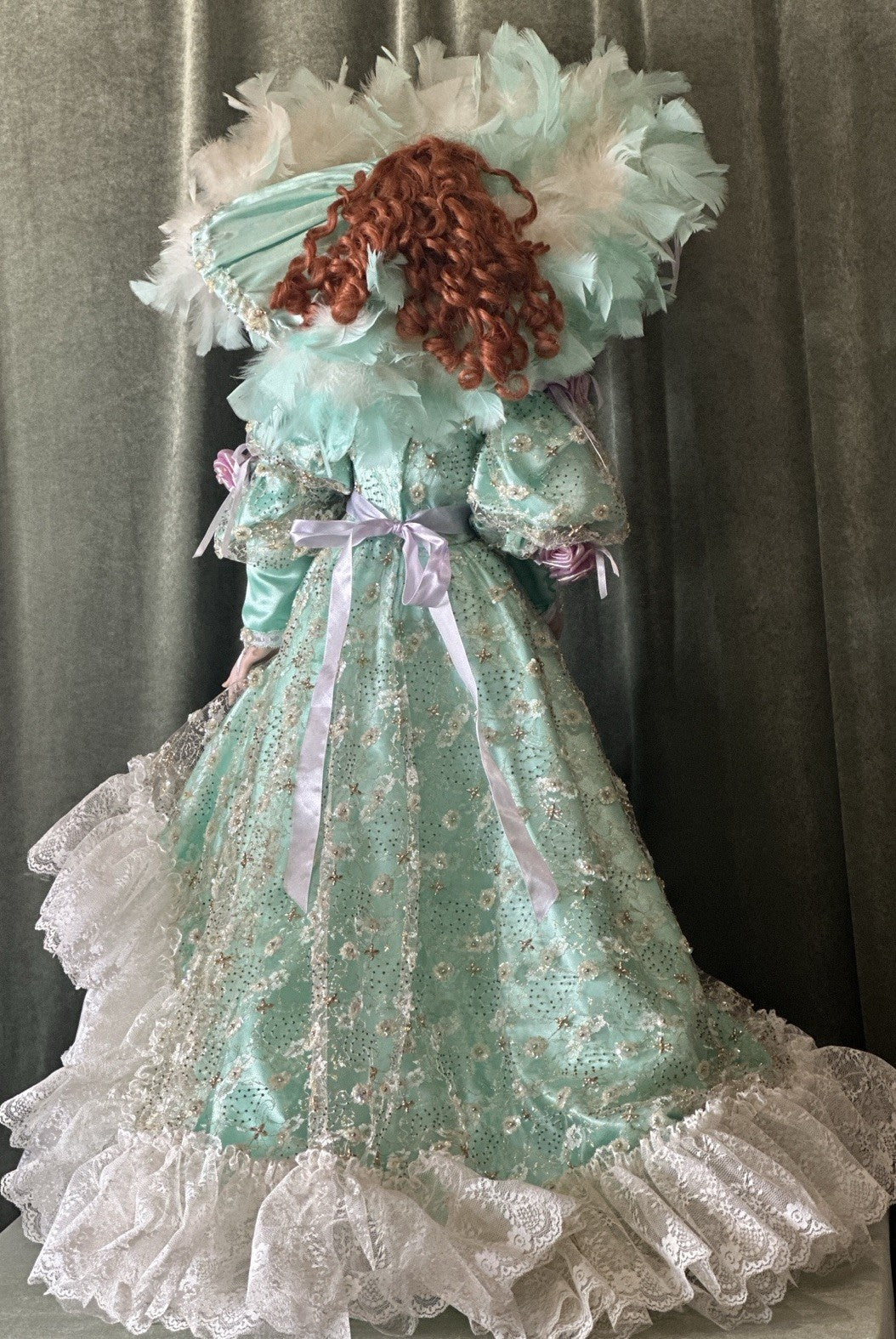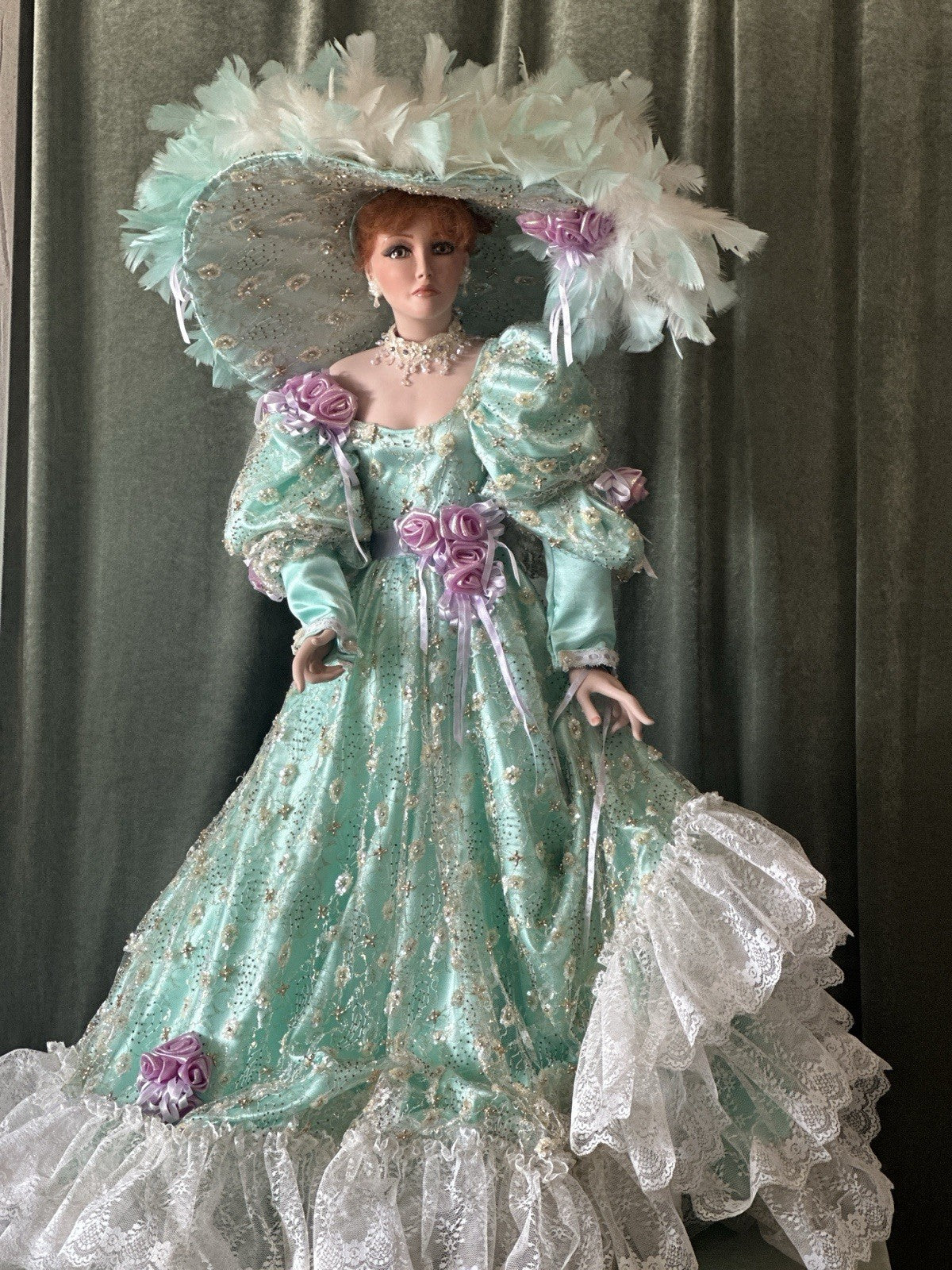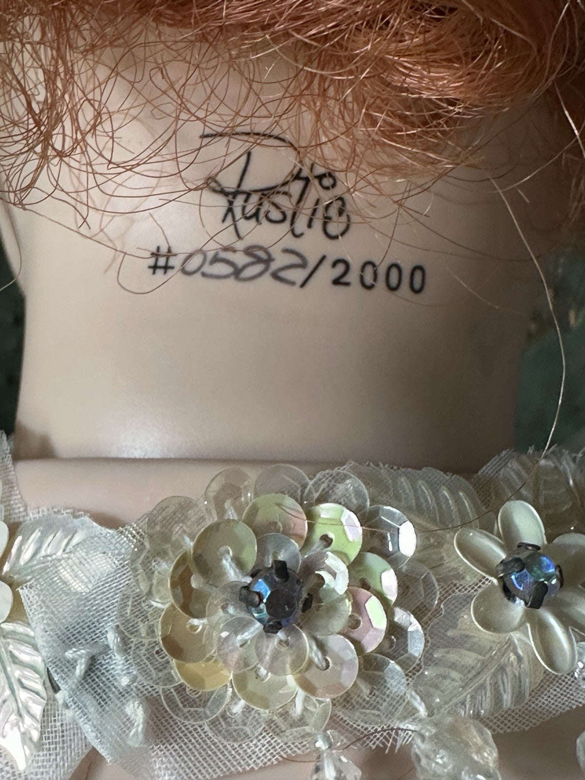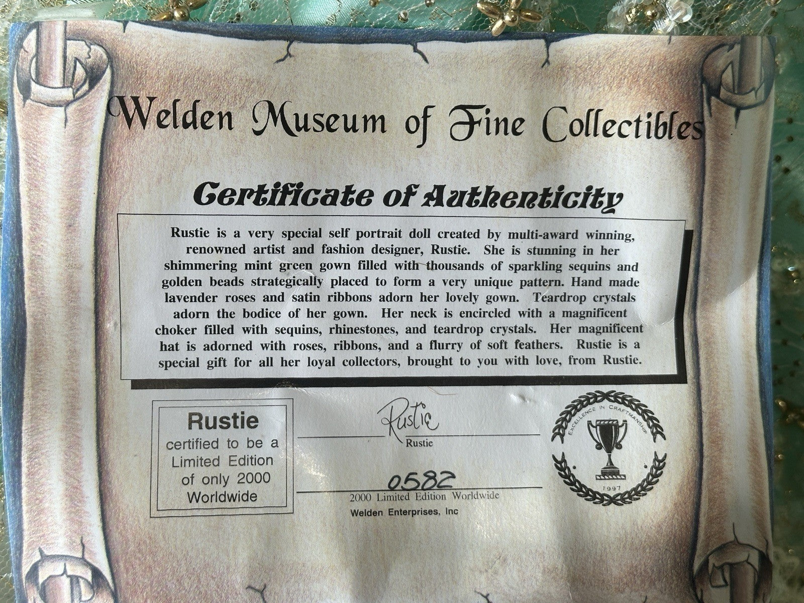 Beautiful large doll by Rustie !!! Doll is approximately 42" tall. Her name is Rustie and she is a limited edition of 2000 dolls. Has to be displayed in a standing position only. Comes with a stand that is inserted in her body. She has porcelain head and breast plate, partial arms and legs. The rest of her body is stuffed cloth with armature inside. Beautiful face paint; stationary green eyes; real upper lashes; missing lashes to one of her eyes. Original outfit. We didn't remove her outfit. Stockings are glued to her legs/not removable. No box. Comes with her COA. We are not sure if missing any accessories.