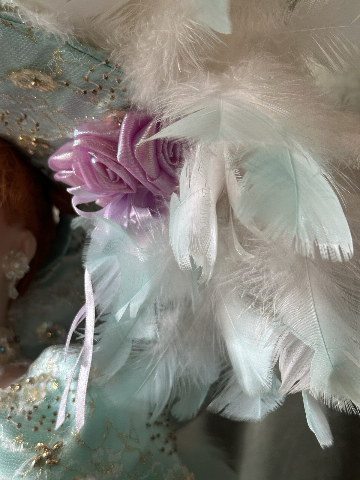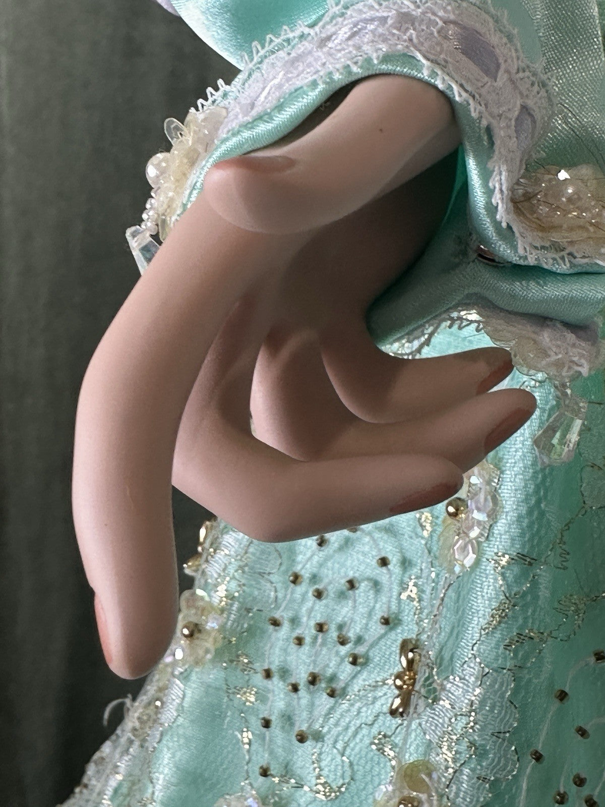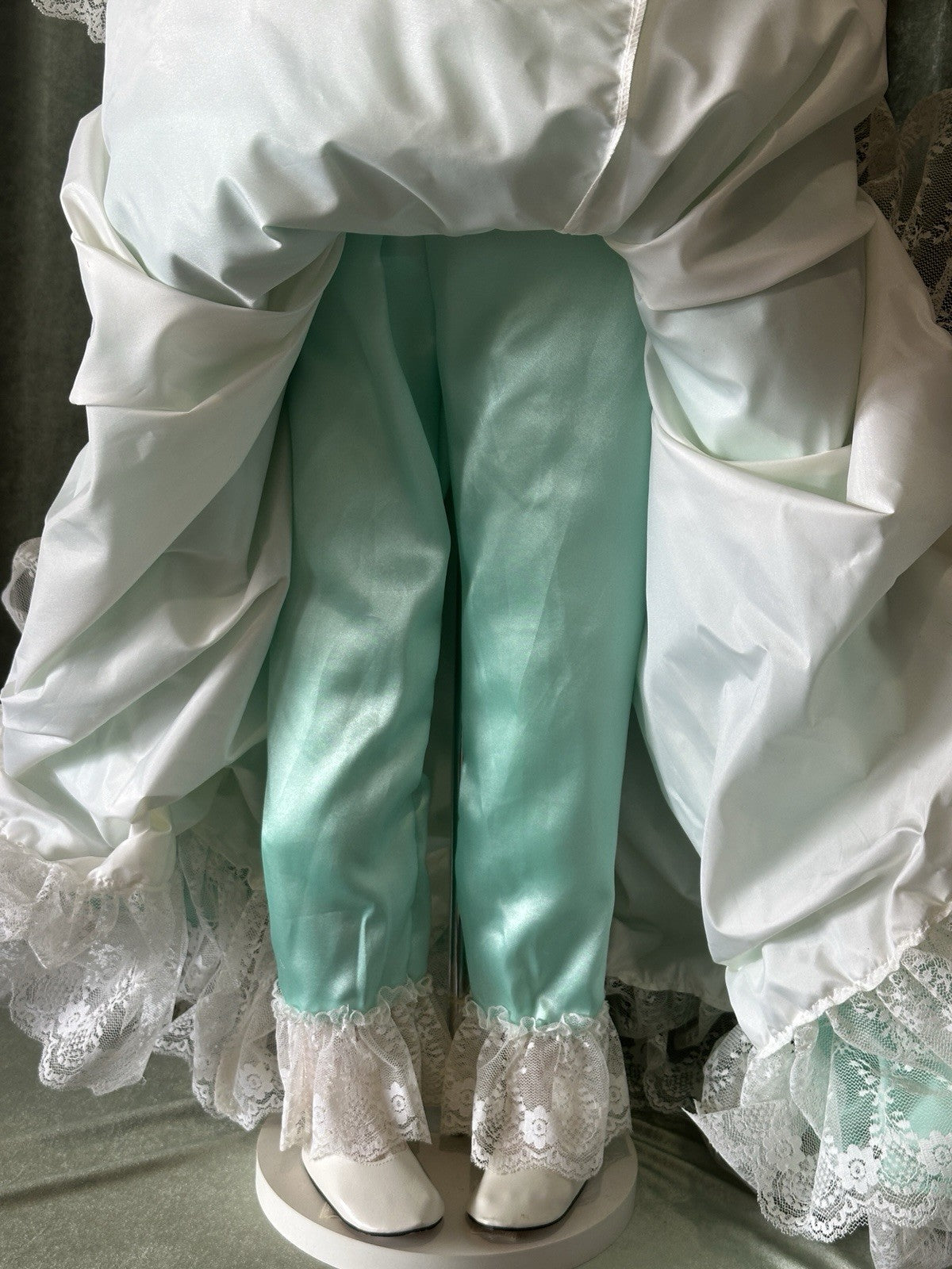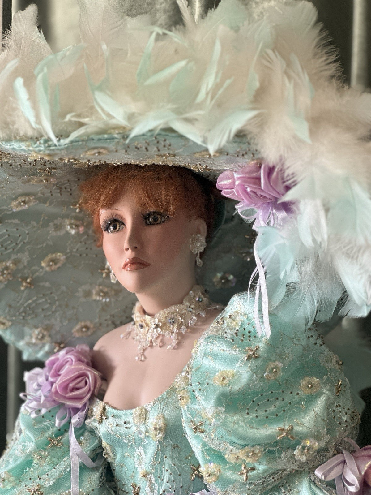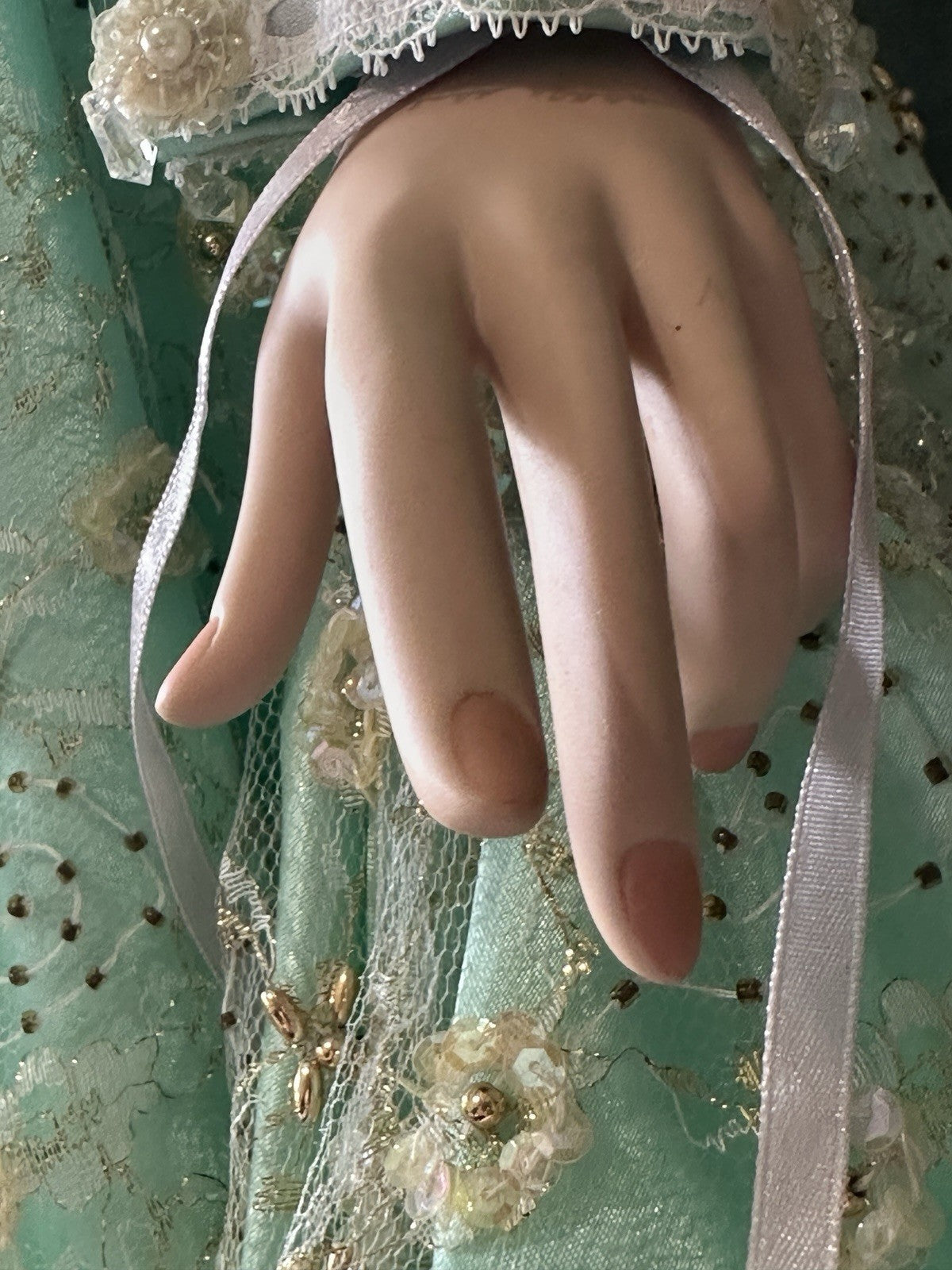 Beautiful large doll by Rustie !!! Doll is approximately 42" tall. Her name is Rustie and she is a limited edition of 2000 dolls. Has to be displayed in a standing position only. Comes with a stand that is inserted in her body. She has porcelain head and breast plate, partial arms and legs. The rest of her body is stuffed cloth with armature inside. Beautiful face paint; stationary green eyes; real upper lashes; missing lashes to one of her eyes. Original outfit. We didn't remove her outfit. Stockings are glued to her legs/not removable. No box. Comes with her COA. We are not sure if missing any accessories.