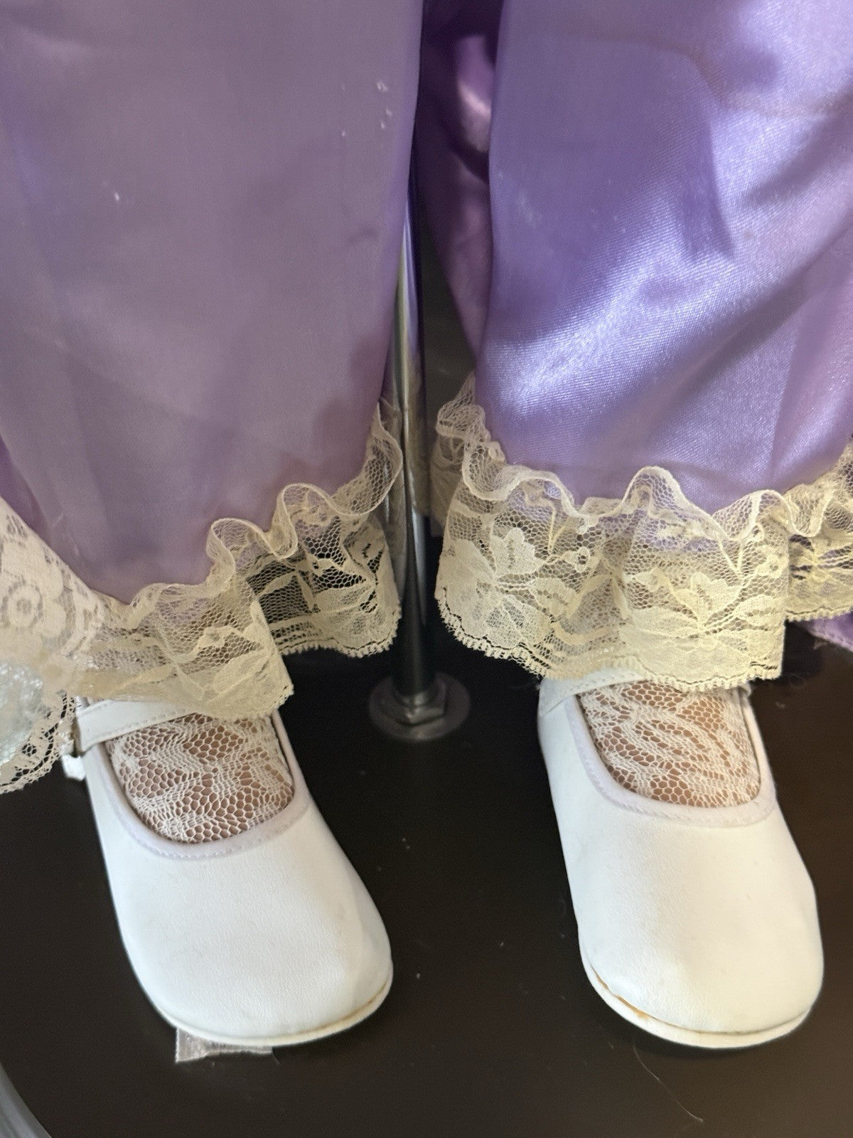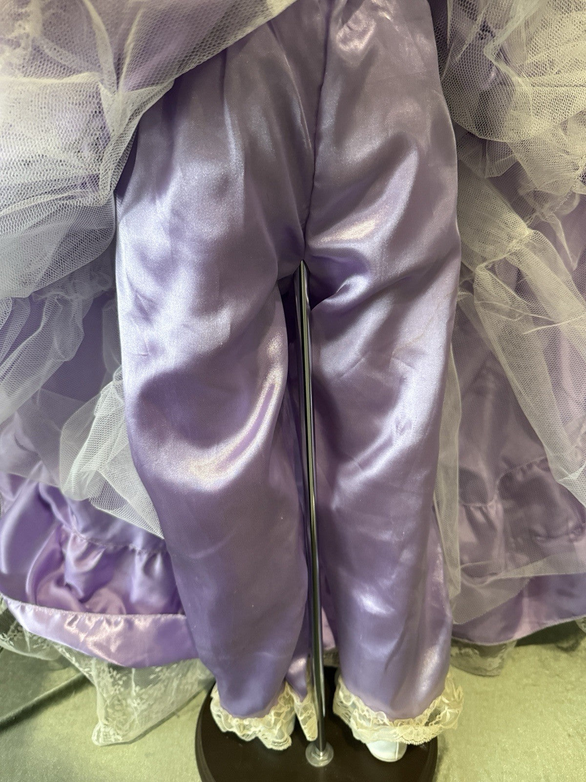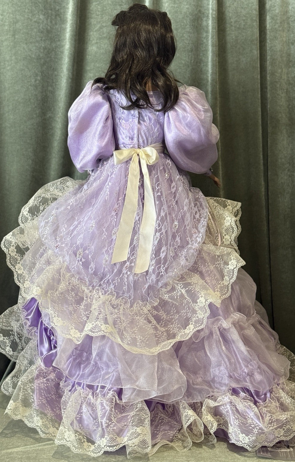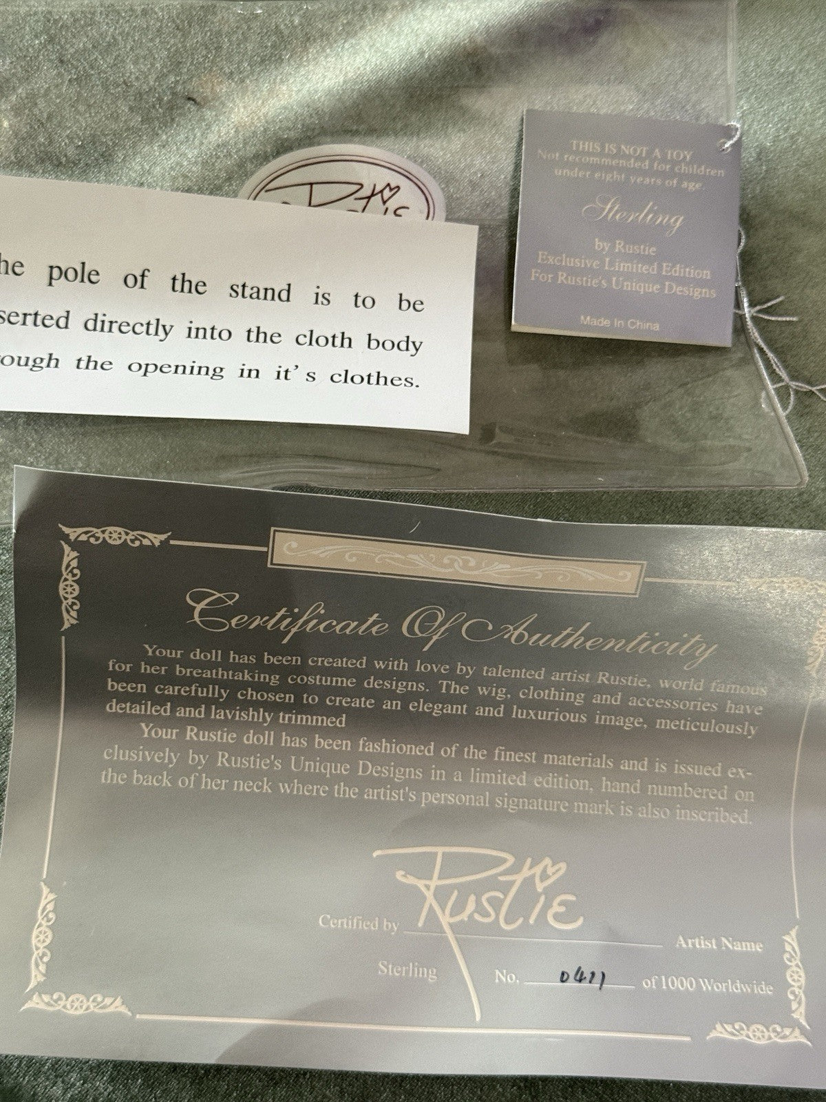 Beautiful large doll by Rustie !!! Doll is approximately 42" tall. Her name is Sterling and she is a limited edition of 1000 dolls. Has to be displayed in a standing position only. Comes with a stand that is inserted into her body. She has porcelain head and breast plate, partial arms and legs. The rest of her body is stuffed cloth with armature inside. Beautiful face paint; stationary brown eyes; real upper and lower lashes. Original outfit. We didn't remove her outfit. Stockings are glued to her legs/not removable. No box. Comes with her COA and tag. Comes with a heart necklace but we are not sure if it's original to this doll; missing some rhinestones. We are not sure if missing any accessories. Please take a closer look at the photos as they are part of the description.