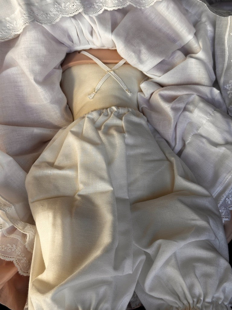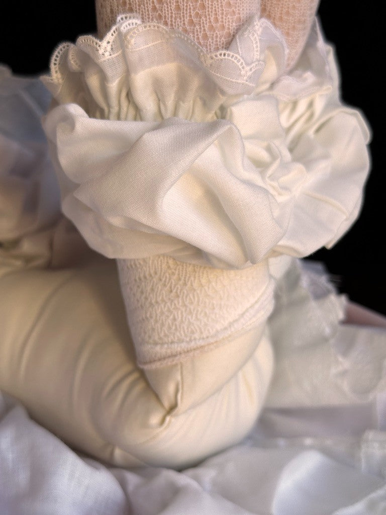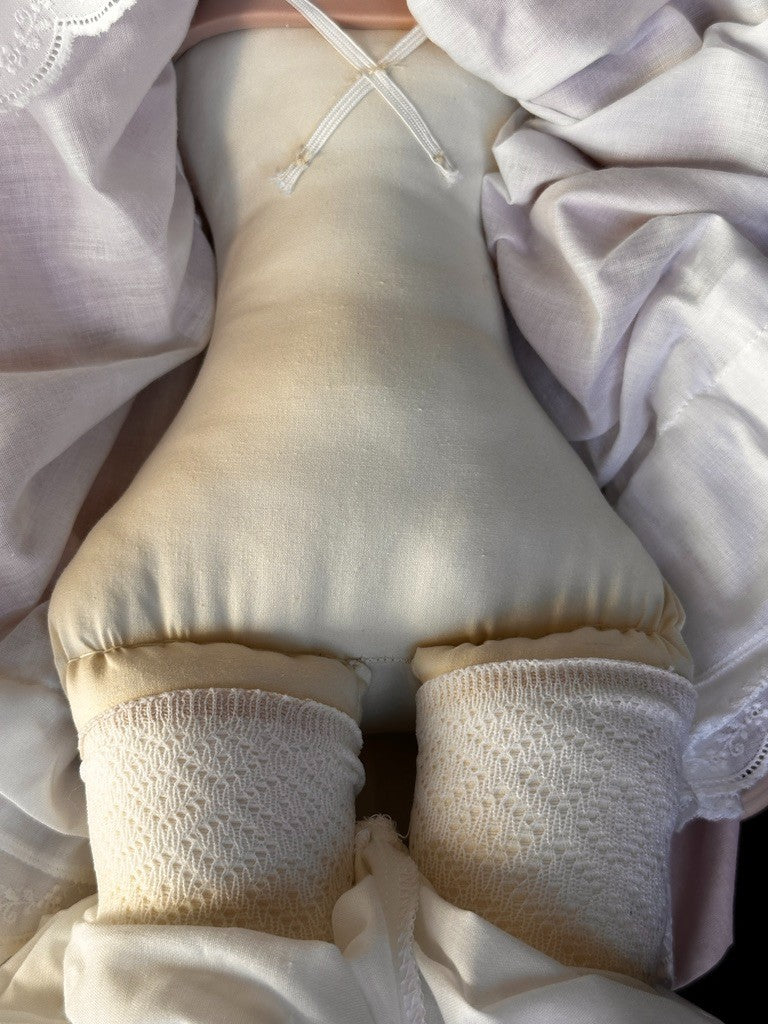 This sweet doll by well-known artist Linda Mason has a porcelain shoulder plate, head, and porcelain lower limbs, with the rest of the body made of cloth. The doll can be displayed either seated or standing. She is all original, signed by the artist, and comes with her original tag.
