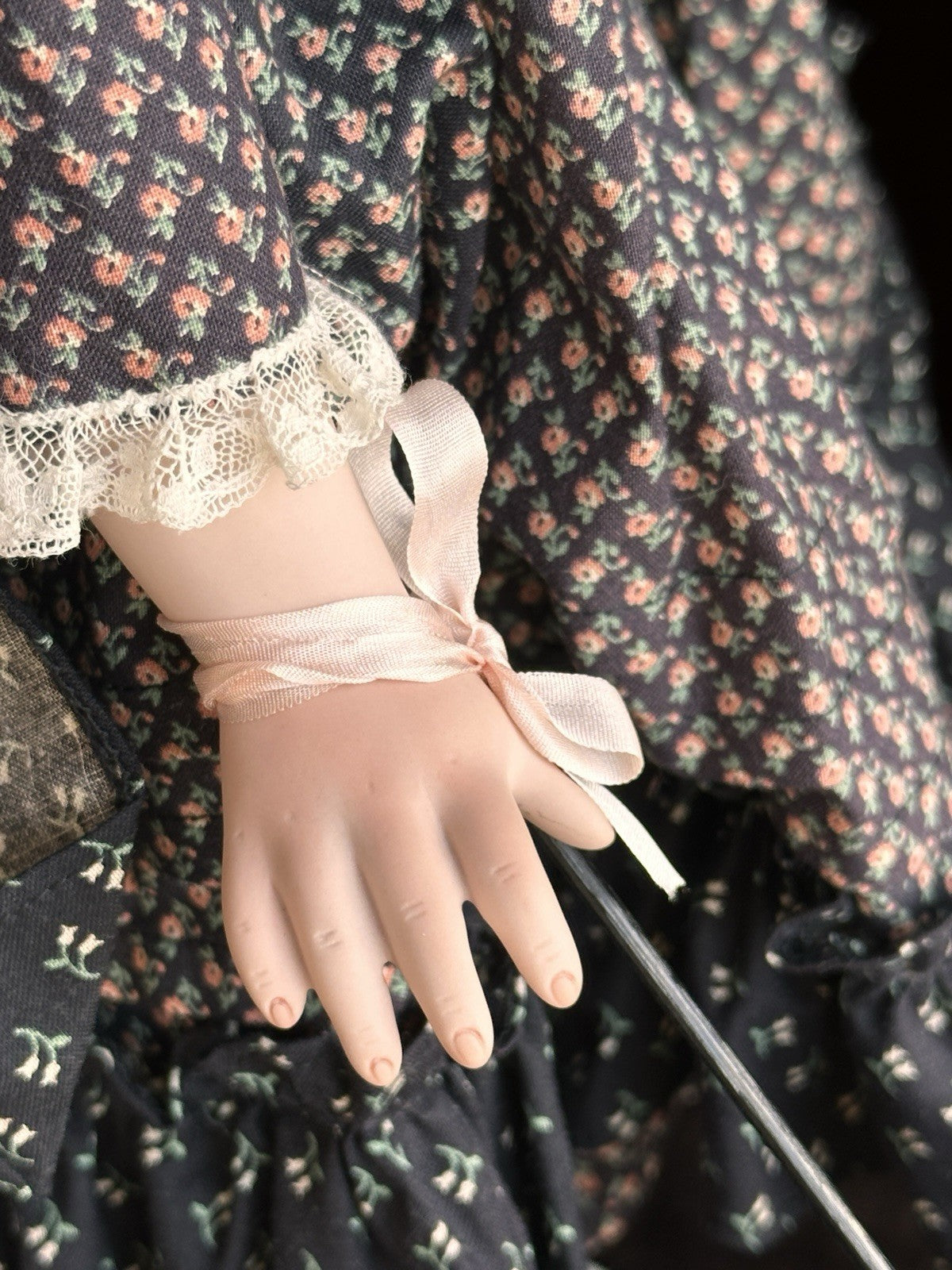 This beautiful doll by well-known artist Linda Mason has a porcelain shoulder plate, head, and porcelain lower limbs, with the rest of the body made of cloth. The doll can be displayed either seated or standing. She is all original, signed by the artist, and comes with her original tag and parasol.