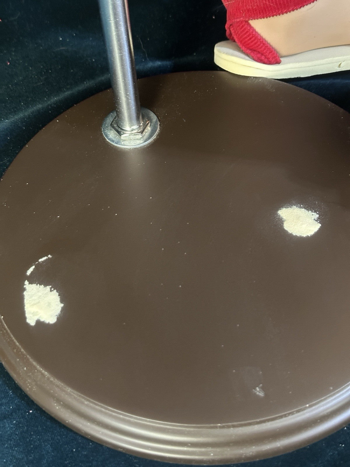 Comes with tag and COA and photo. Also comes with her original crossbody purse and lollipop. No box. Some marks/scratches from her shoes are present to the stand - see photo.
