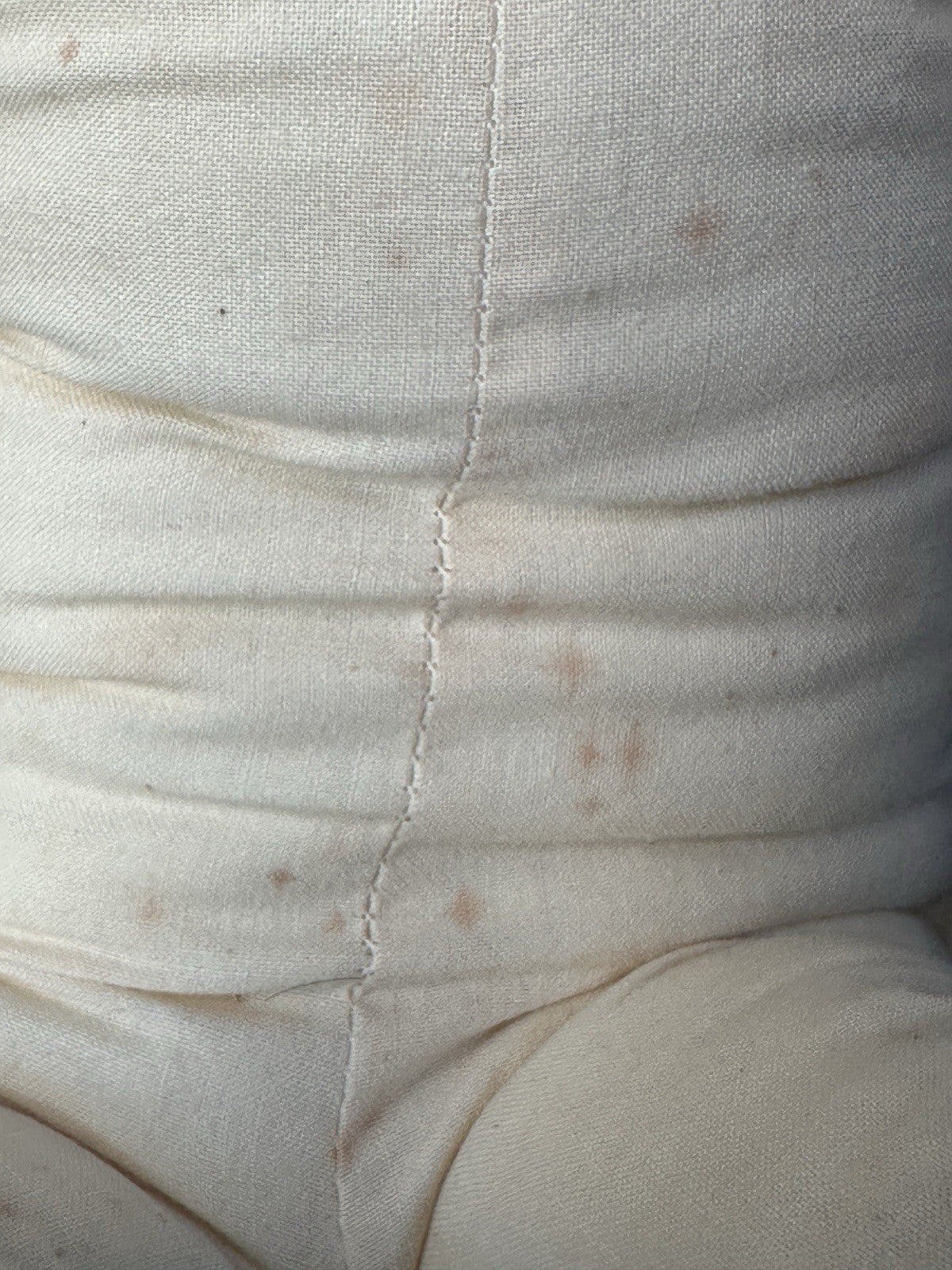 Absolutely adorable baby doll!!! Unbranded. Some numbers to the back of her neck; looks like edition numbers 141/250 (?) but we are not sure about it. We could not find any signature or initials of the artist who created this beautiful doll. She is approximately 21" tall; hard to measure due to bent legs. About 13" inches sitting position. Porcelain head and shoulder plate , partial extremities. The rest of her body is stuffed cloth with armature inside. Some stains are present to her cloth body. Cute outfit; stains are present . Comes with her Teddy bear.