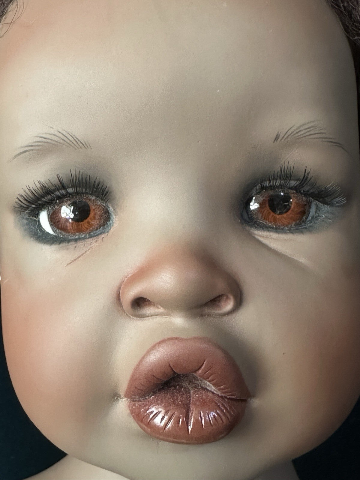 Collectible Porcelain Artist Dark Complexion 21” Baby Doll With Teddy Bear
