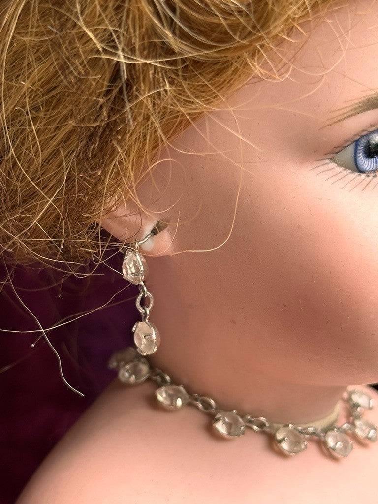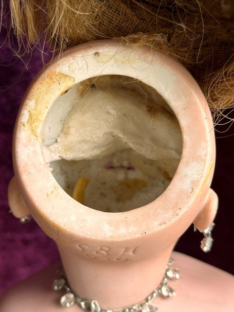 Absolutely gorgeous doll. She has an open mouth, pierced ears, and stationary eyes. The head is in overall good condition, with just a small flake to the right ear. No other flaws to the bisque. The wig looks original and is made of human hair.