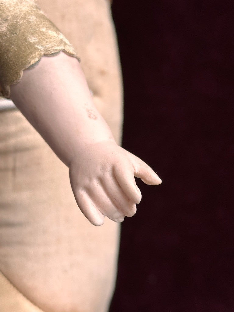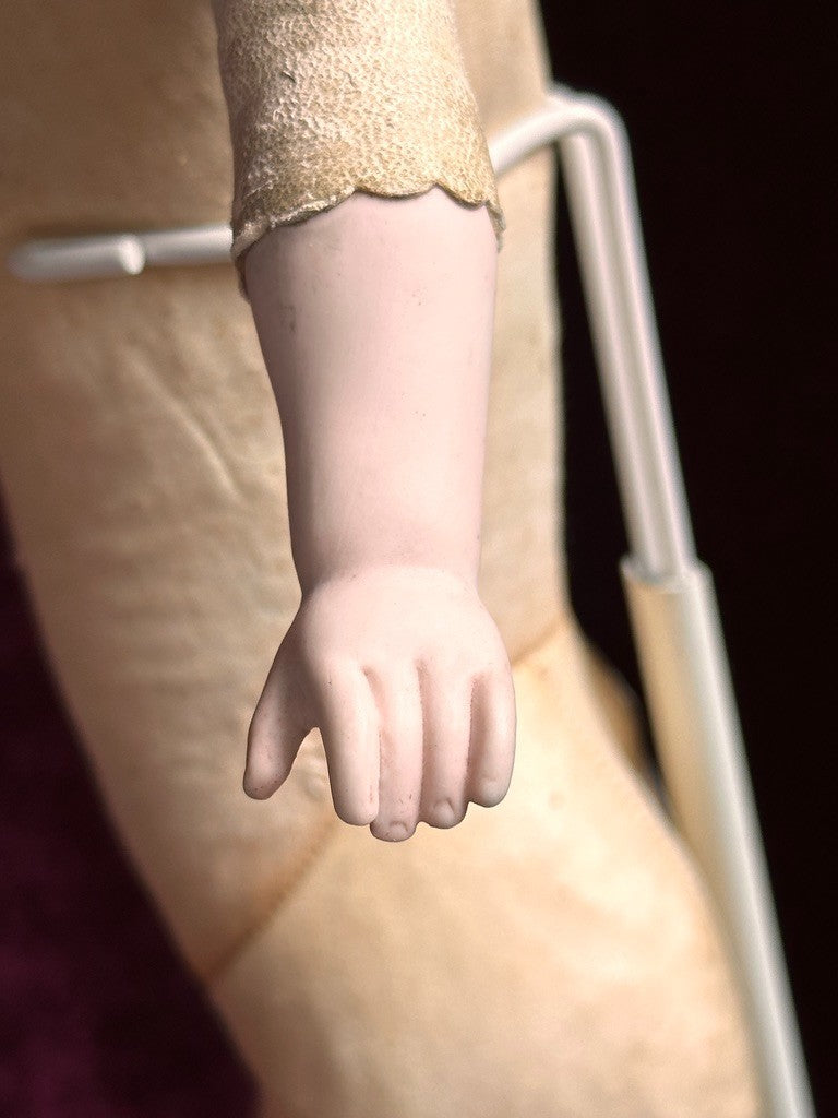 The body is made of cloth as well as leather. Most likely original. There are some repairs to the legs. Lower bisque arms are free of damage. There is no leaking to the doll.