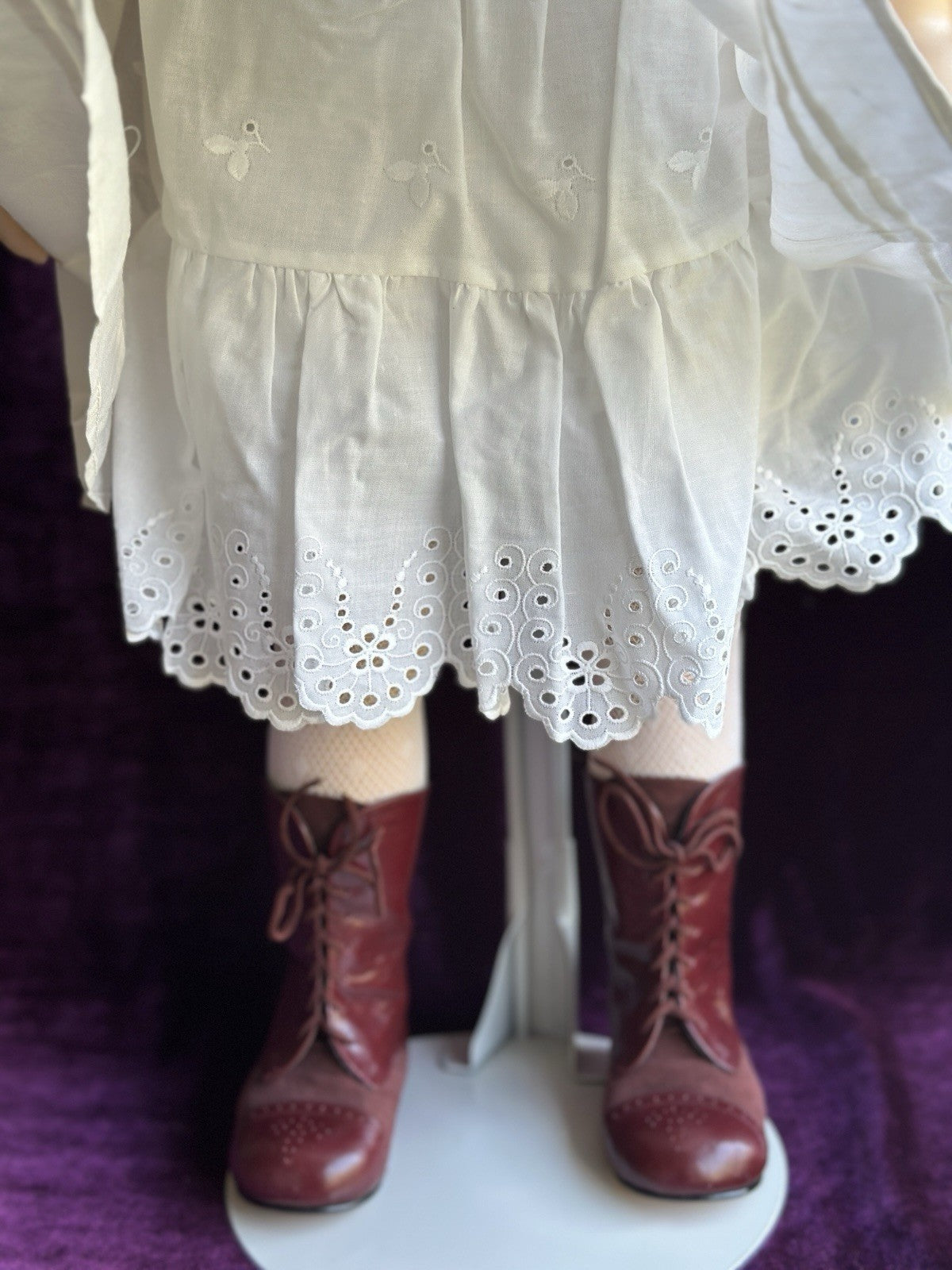 Amazing work by famous doll artist! The doll is new and clean. She was never displayed. The doll is supposed to be displayed standing. She is not able to sit. May has no damage. No wear was found. May is coming with her original box, certificate, video and tag. The box is a little worn. Please refer to the pictures for more details. No stand to the doll.