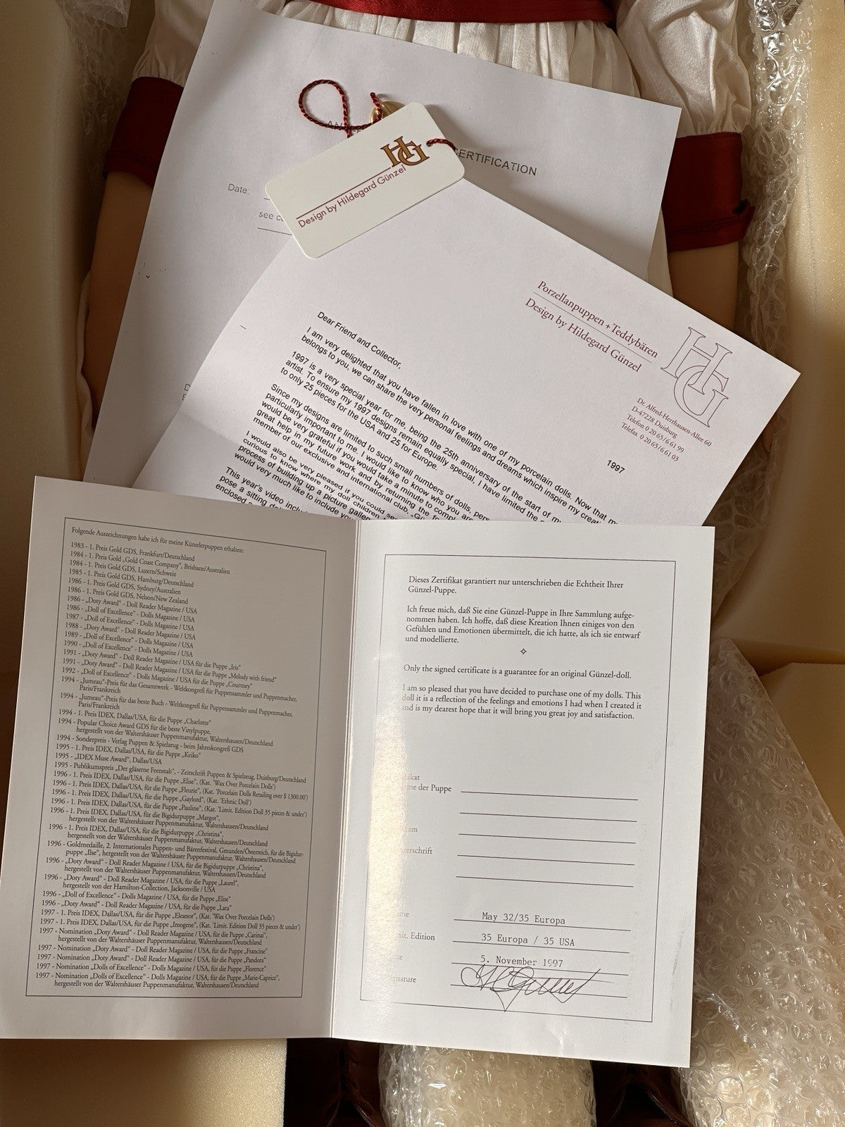 German 31” Hildegard Gunzel Wax Over Porcelain May Doll NIB LE Europe 35