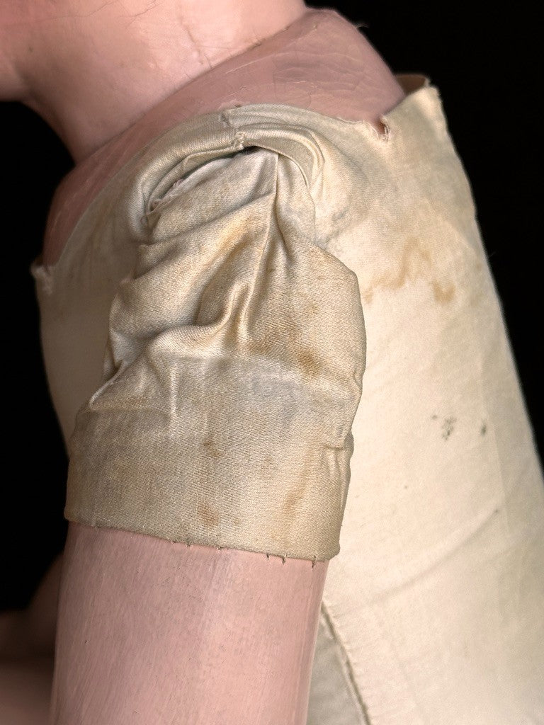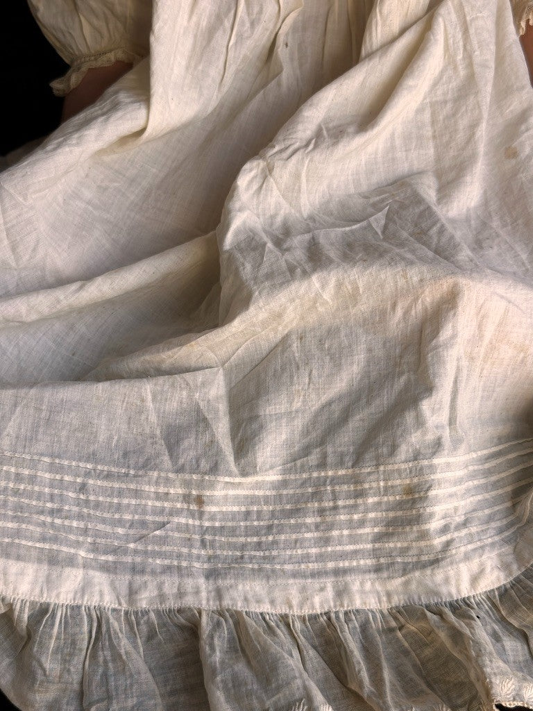 The doll has no underwear and is coming with an antique dress that shows some stains. A beautiful newer hat is included.
