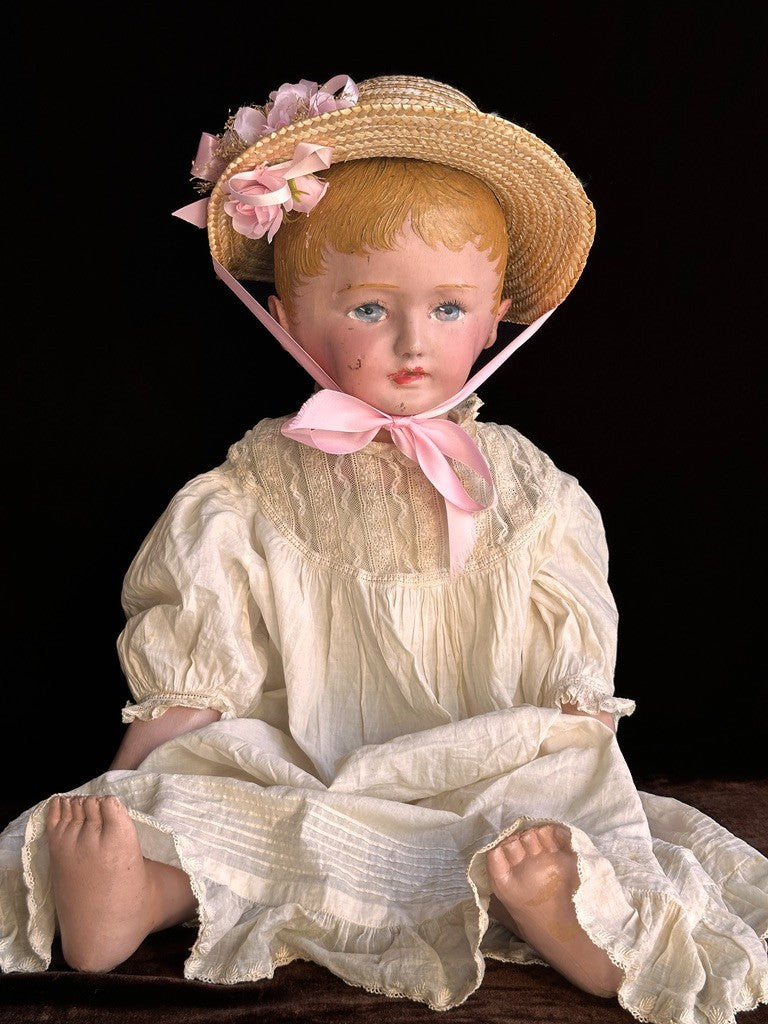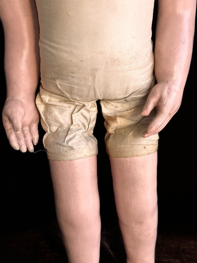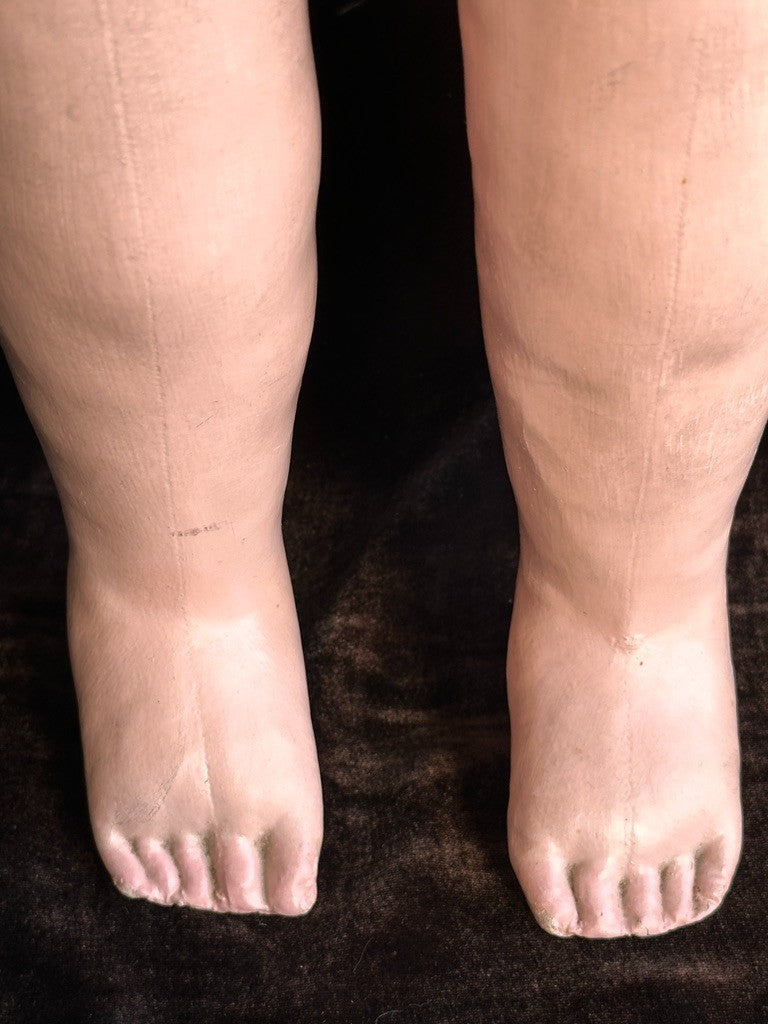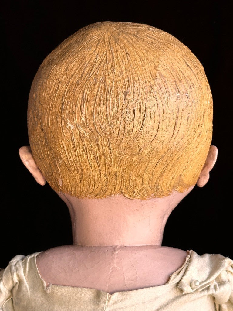 Incredible life-size doll that appears to represent a toddler rather than a typical baby. She has a beautifully molded face with very distinctive facial features. The doll shows typical paint wear that can be seen on the photos, including some marks to the face. Overall, she is in good condition considering her age.