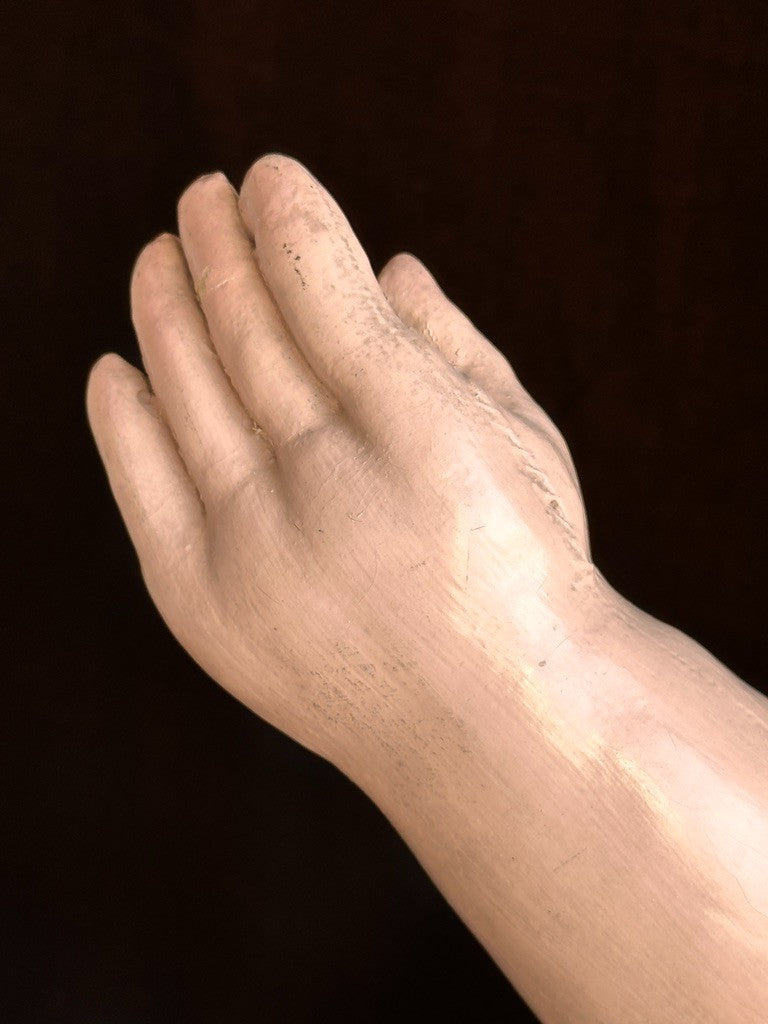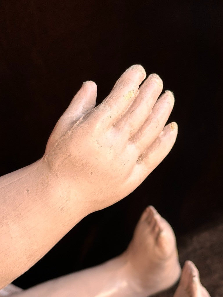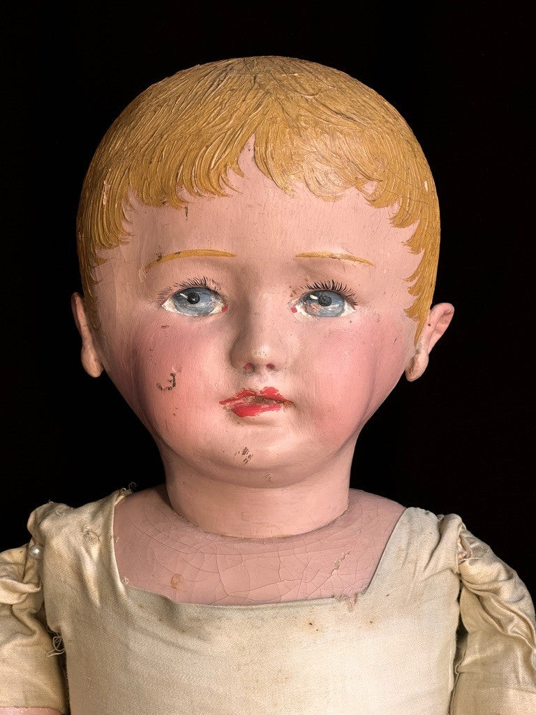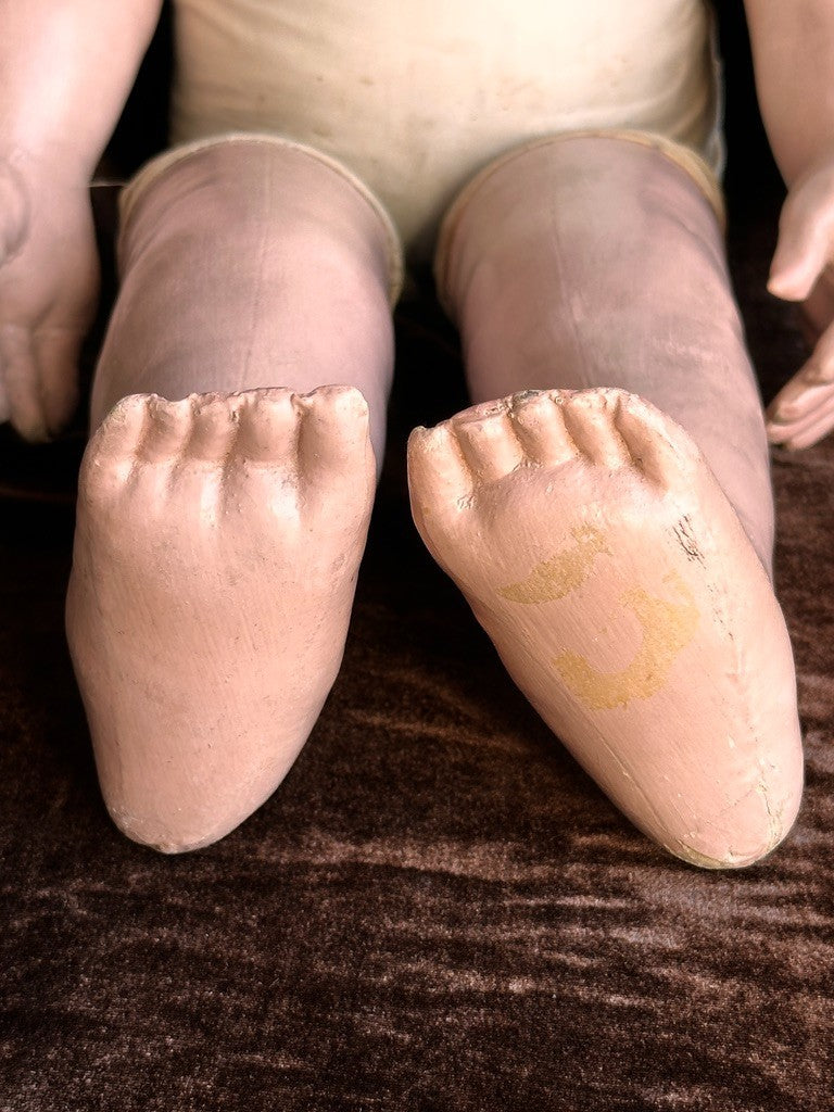 Incredible life-size doll that appears to represent a toddler rather than a typical baby. She has a beautifully molded face with very distinctive facial features. The doll shows typical paint wear that can be seen on the photos, including some marks to the face. Overall, she is in good condition considering her age.