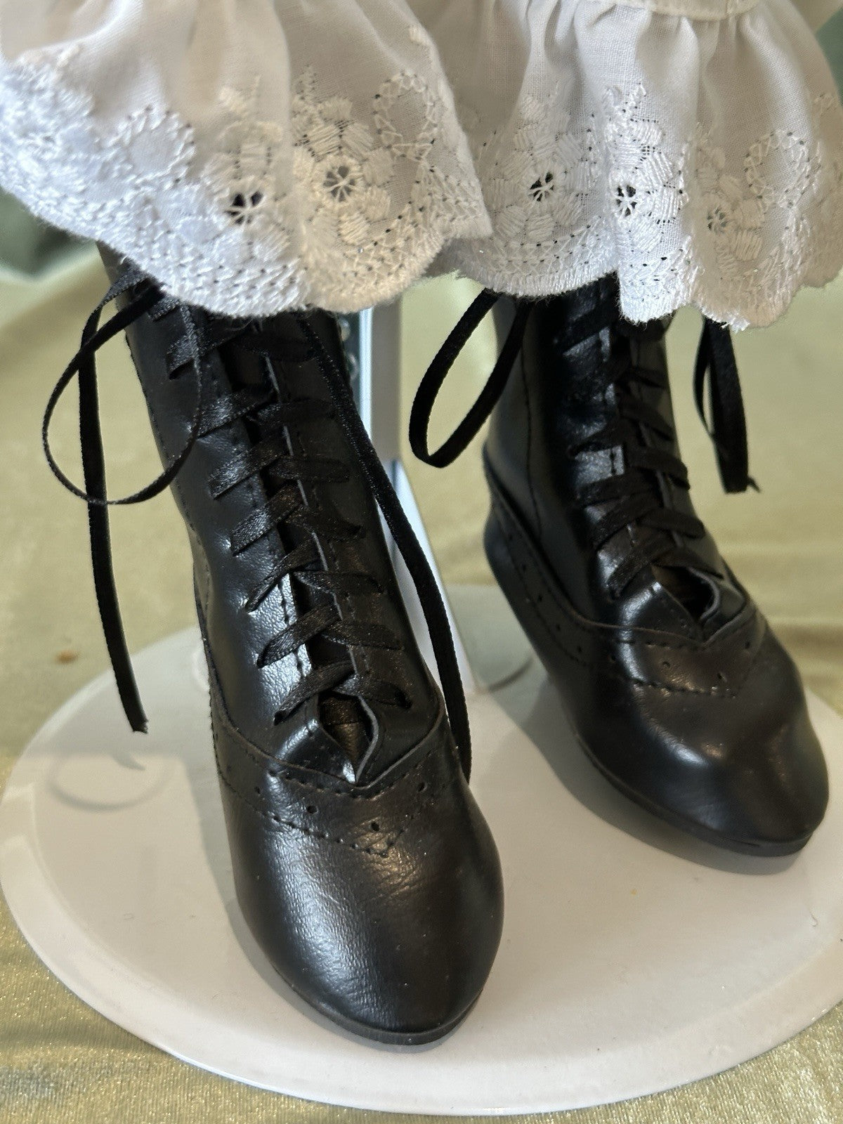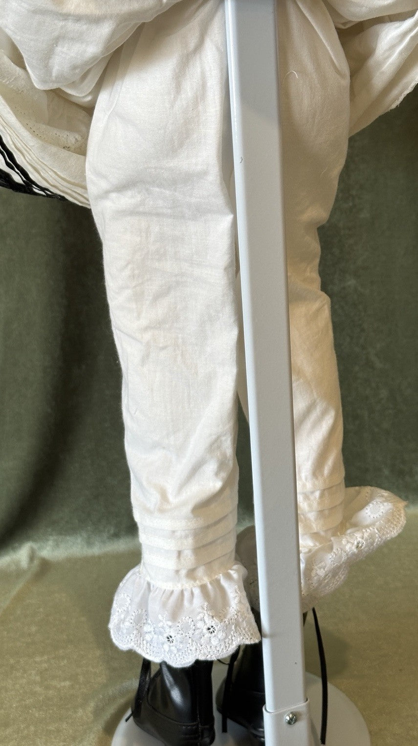 Beautiful doll by Jan Mclean!! Her name is Laura and she was created for Exclusively Yours collection. She is approximately 28" tall. She has porcelain head and partial extremities. The rest of her body is stuffed cloth. Her outfit is original. Stand is not included. No box. Comes with tag, stand and COA.