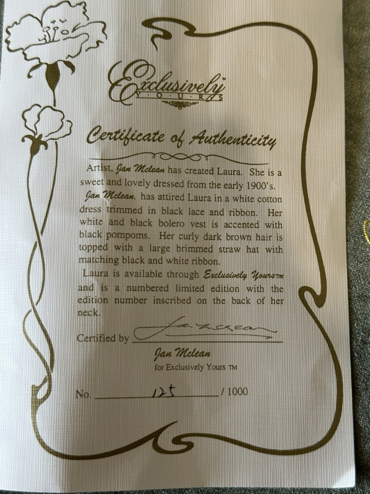 Jan Mclean 28" Porcelain Doll “Laura” Tag and COA For Exclusively Yours 1997