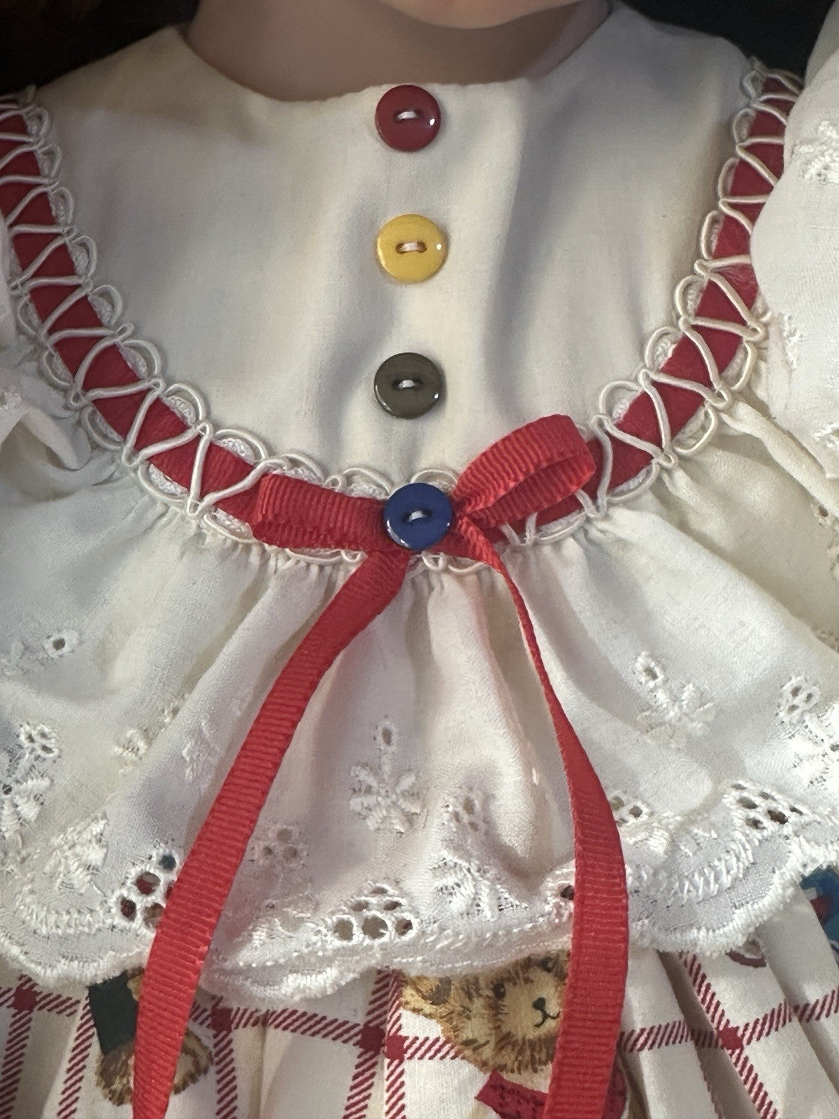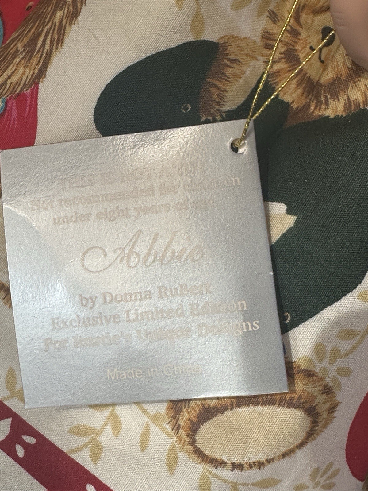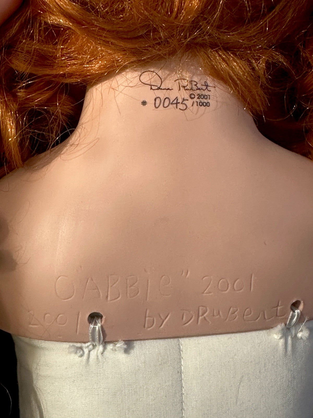Beautiful large doll by Donna Rubert!!! Doll is approximately 29" tall. Abbie is a limited edition of 100 dolls. Has to be displayed in a standing position only. She has porcelain head and breast plate, partial arms and legs. The rest of her body is stuffed cloth with armature inside which allows. Marked on the back of her head and breast plate (see photo). Beautiful face paint; stationary blue eyes; real upper and lower lashes. Original outfit; some stains/holes might be present. Her stockings are glued to her legs/not removable. No box/COA. Comes with her original teddy bear, glasses and tag. Comes with stand.